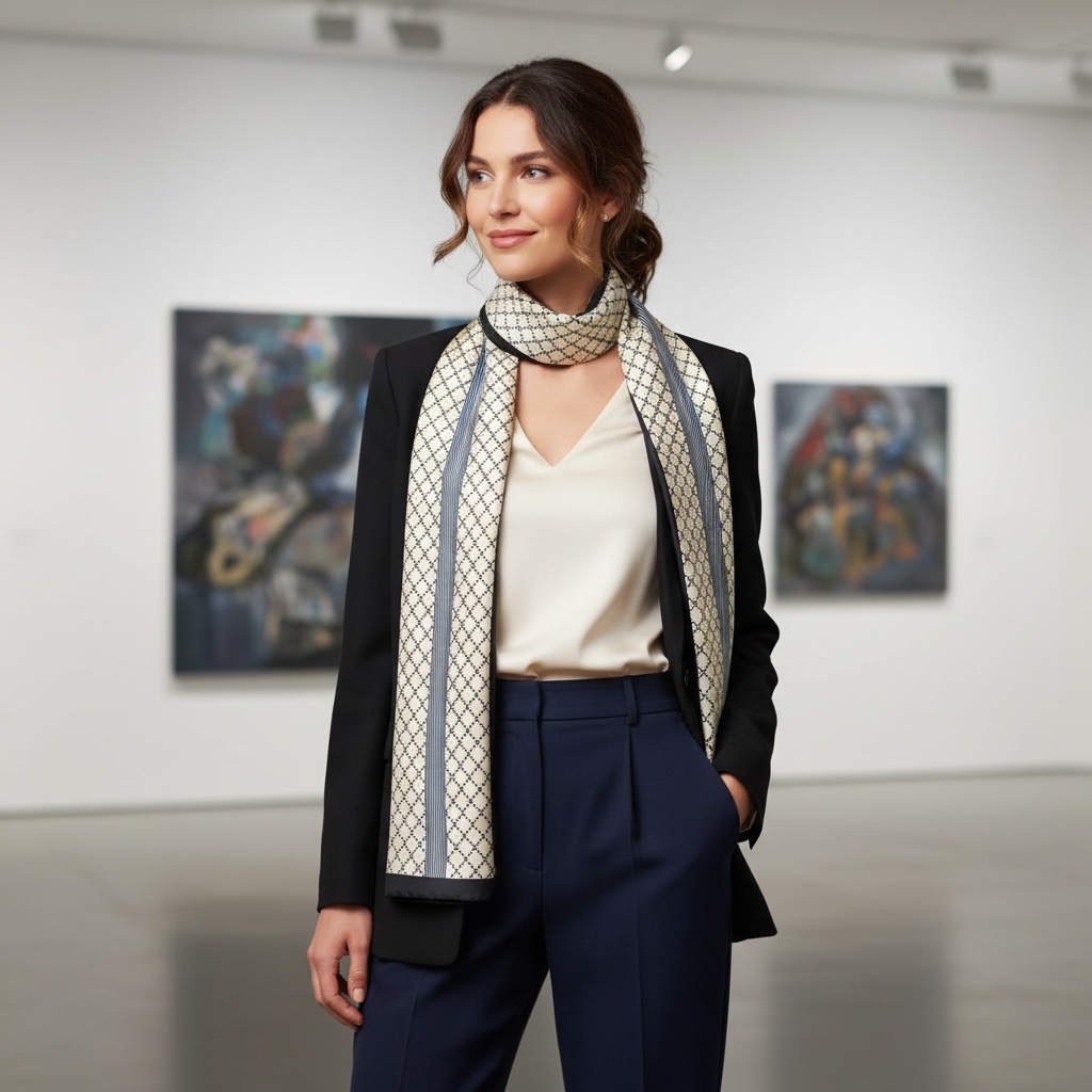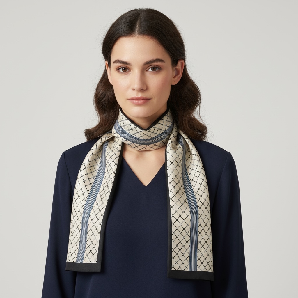 Elegancka, wąska i długa apaszka wykonana z gładkiego, śliskiego materiału, bardzo przyjemna w dotyku. Subtelny, geometryczny wzór w odcieniach beżu nadaje jej ponadczasowy charakter, a kontrastowe, ciemniejsze wykończenie krawędzi dodaje całości wyrafinowania. Apaszka pięknie układa się na szyi, można ją nosić klasycznie, zawiązaną w kokardę, luźno puszczoną lub jako stylowy akcent do marynarki, sukienki czy koszuli. Lekka i delikatna, idealna zarówno na co dzień, jak i do eleganckich stylizacji.
