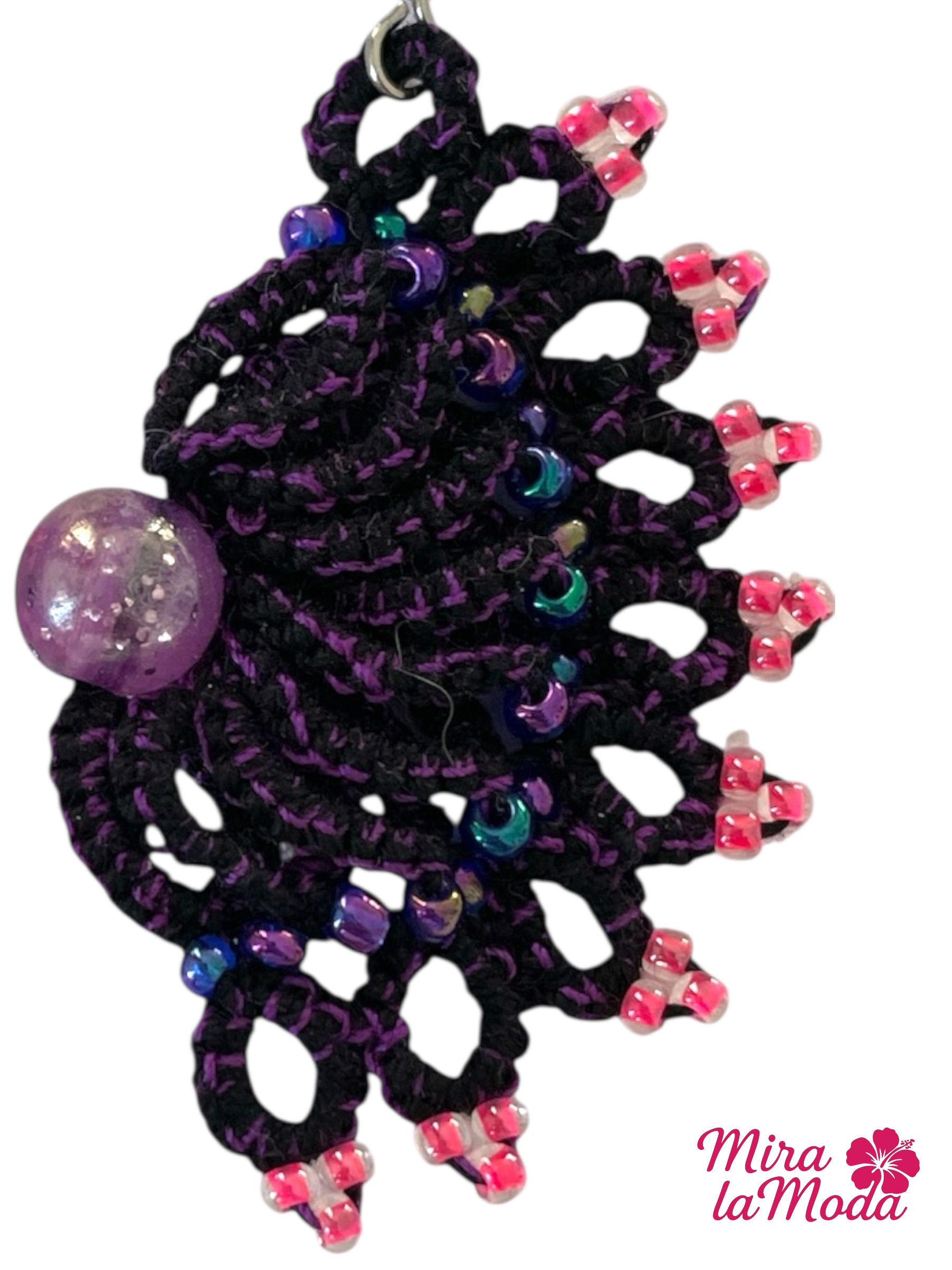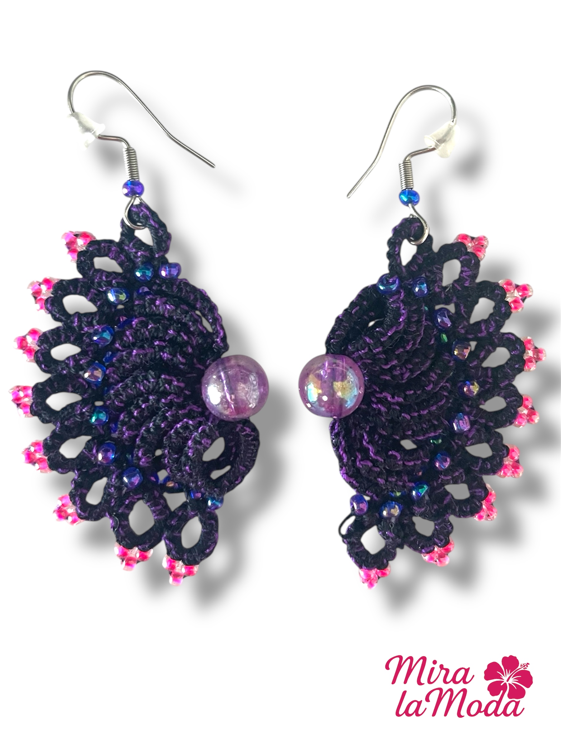Ręcznie robione kolczyki w kształcie eleganckiego wachlarza, stworzone z najwyższą dbałością o detale. Połączenie intensywnej czerni z dodatkiem fioletu, nadaje całości wyjątkowej głębi. Delikatne nici tworzą piękny, ażurowy wzór. Ozdobione koralikami w kolorze kameleon wplecionymi w części środkowej oraz różowe koraliki subtelnie zdobiące brzegi. W centralnej części większa, elegancka perełka w kolorze fioletowym. Zapięcie - otwarte bigle w kolorze srebrnym, wykonane ze stali chirurgicznej, z silikonową zatyczką.