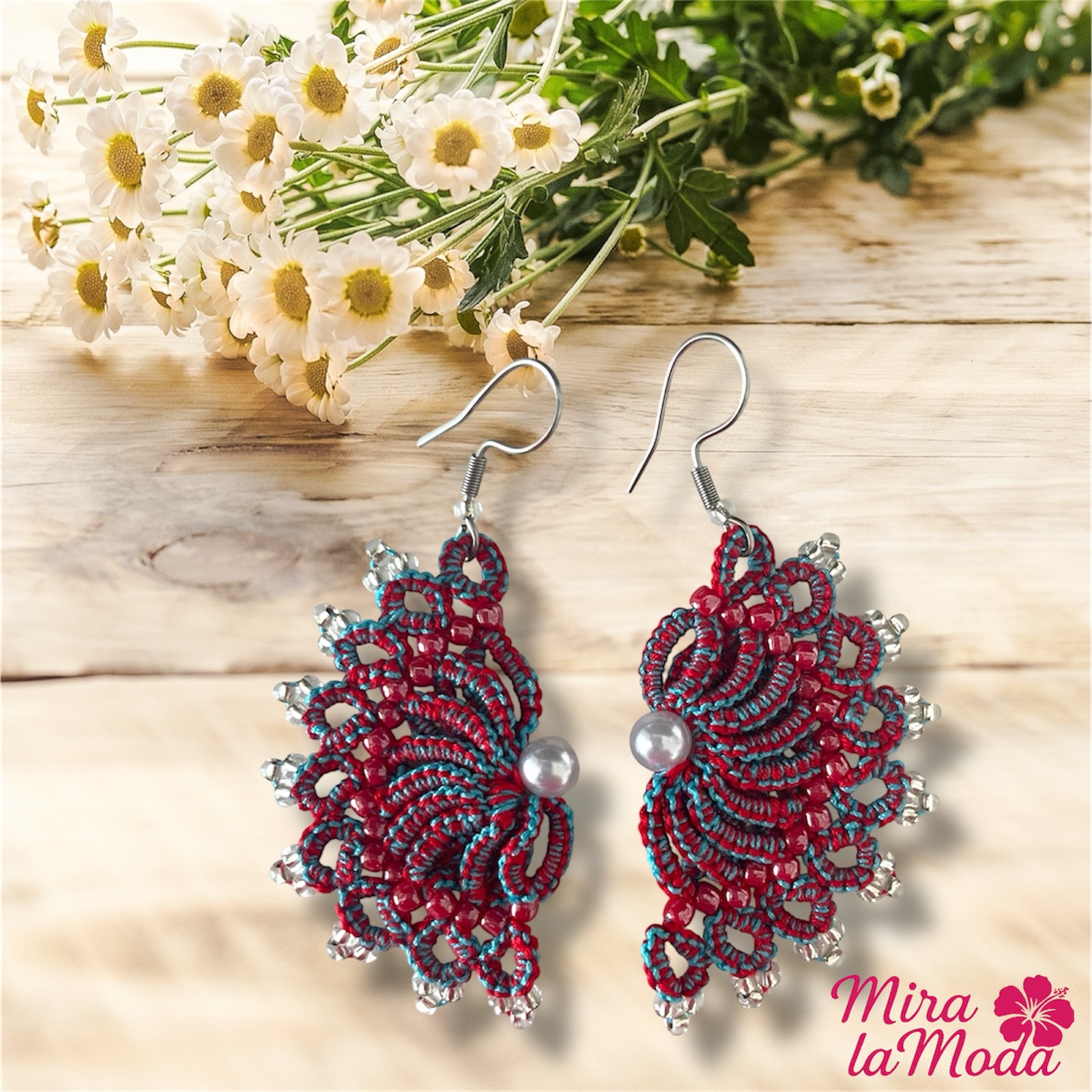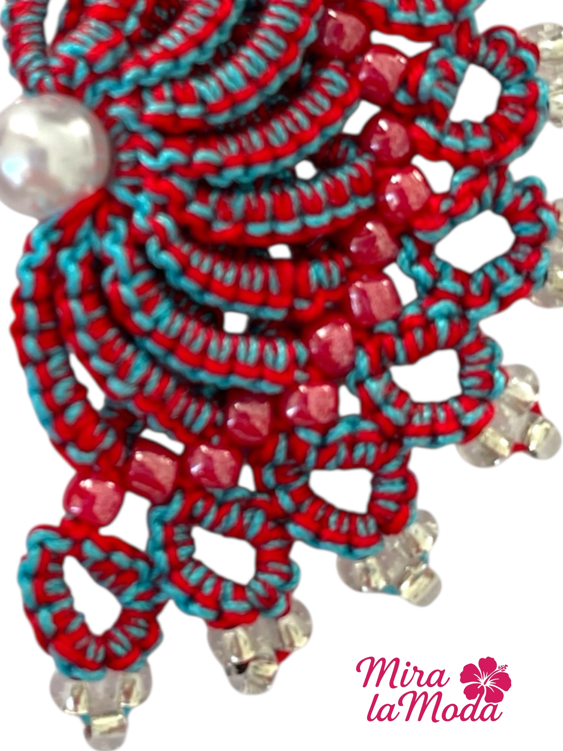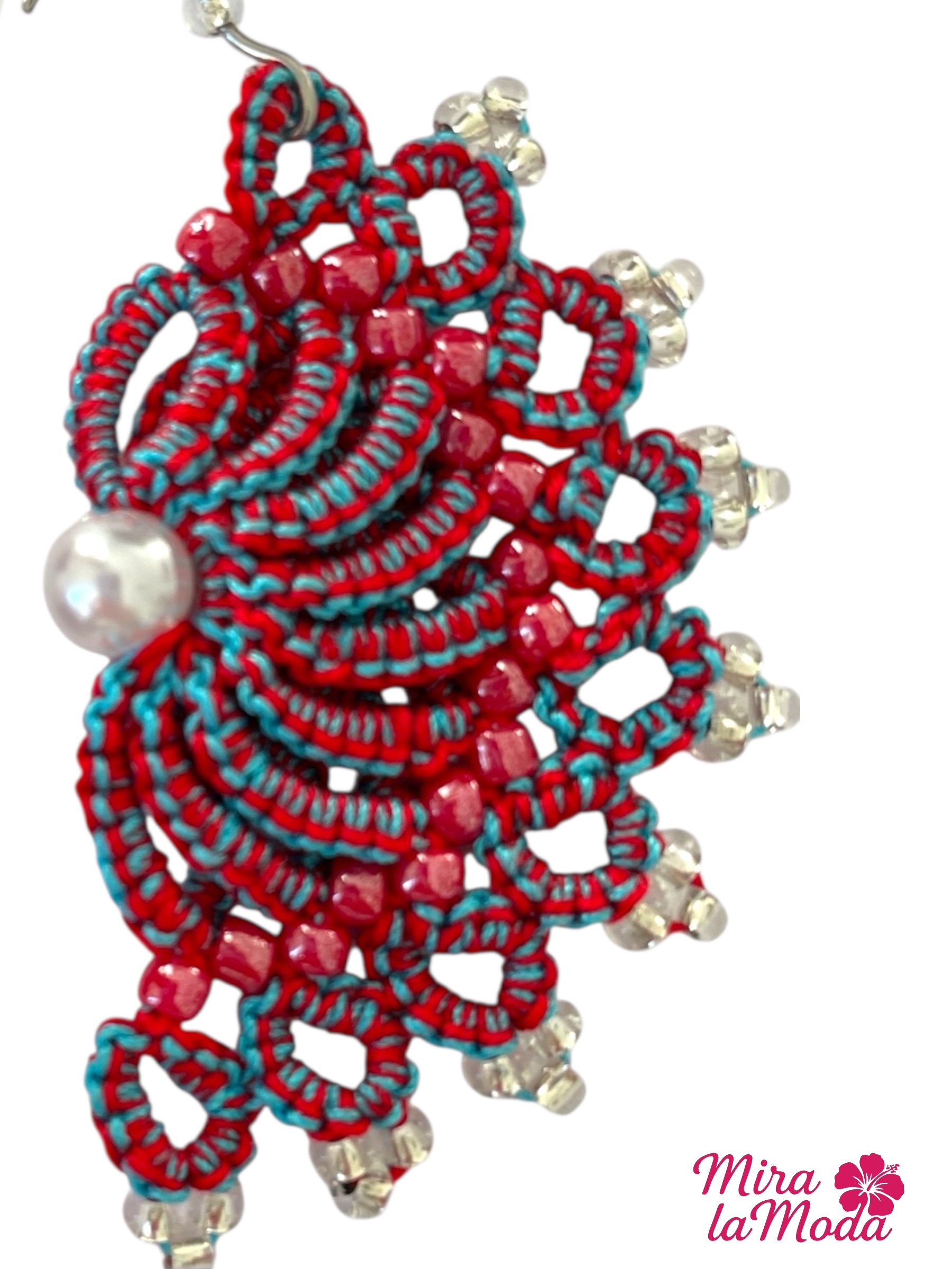 Ręcznie robione kolczyki w kształcie eleganckiego wachlarza, stworzone z najwyższą dbałością o detale. Połączenie intensywnej czerwieni z dodatkiem błękitu, które nadają całości wyjątkowej głębi. Delikatne nici tworzą piękny, ażurowy wzór. Ozdobione czerwonymi koralikami wplecionymi w części środkowej oraz przeźroczyste koraliki subtelnie zdobiące brzegi. W centralnej części większa, elegancka perełka. Zapięcie - otwarte bigle w kolorze srebrnym, wykonane ze stali chirurgicznej, z silikonową zatyczką.