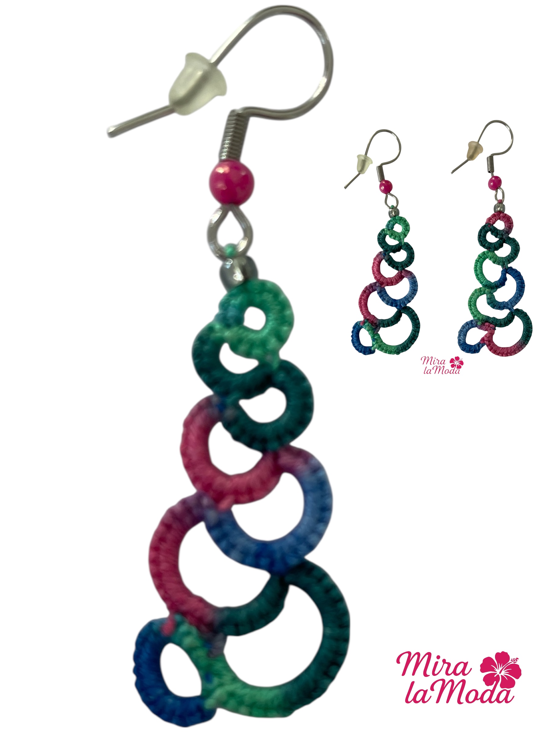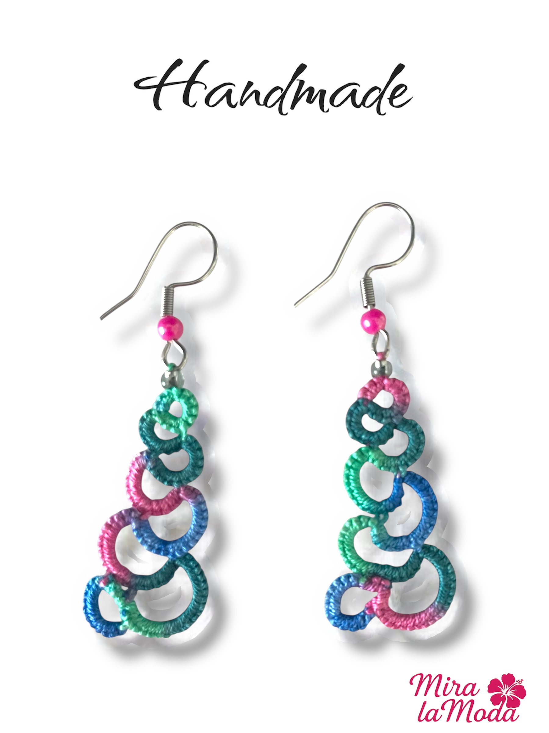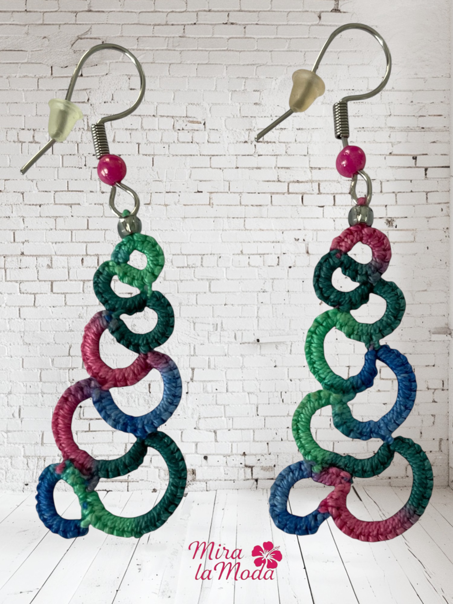 Ręcznie robione kolczyki o nietypowej stożkowej formie, pełne koloru i fantazji. Kształt to delikatnie skręcone kółka, połączone ze sobą w pionie mniejsze od góry, większe u dołu, tworzące lekko stożkową kompozycję. Kolorystyka to harmonijne połączenie turkusu, zieleni, różu i błękitu, które nadaje im radosnego i świeżego charakteru. Zapięcie to otwarte bigle w kolorze srebrnym ze stali chirurgicznej z silikonową zatyczką. Bezpieczne dla wrażliwych uszu. Styl nowoczesny i artystyczny.