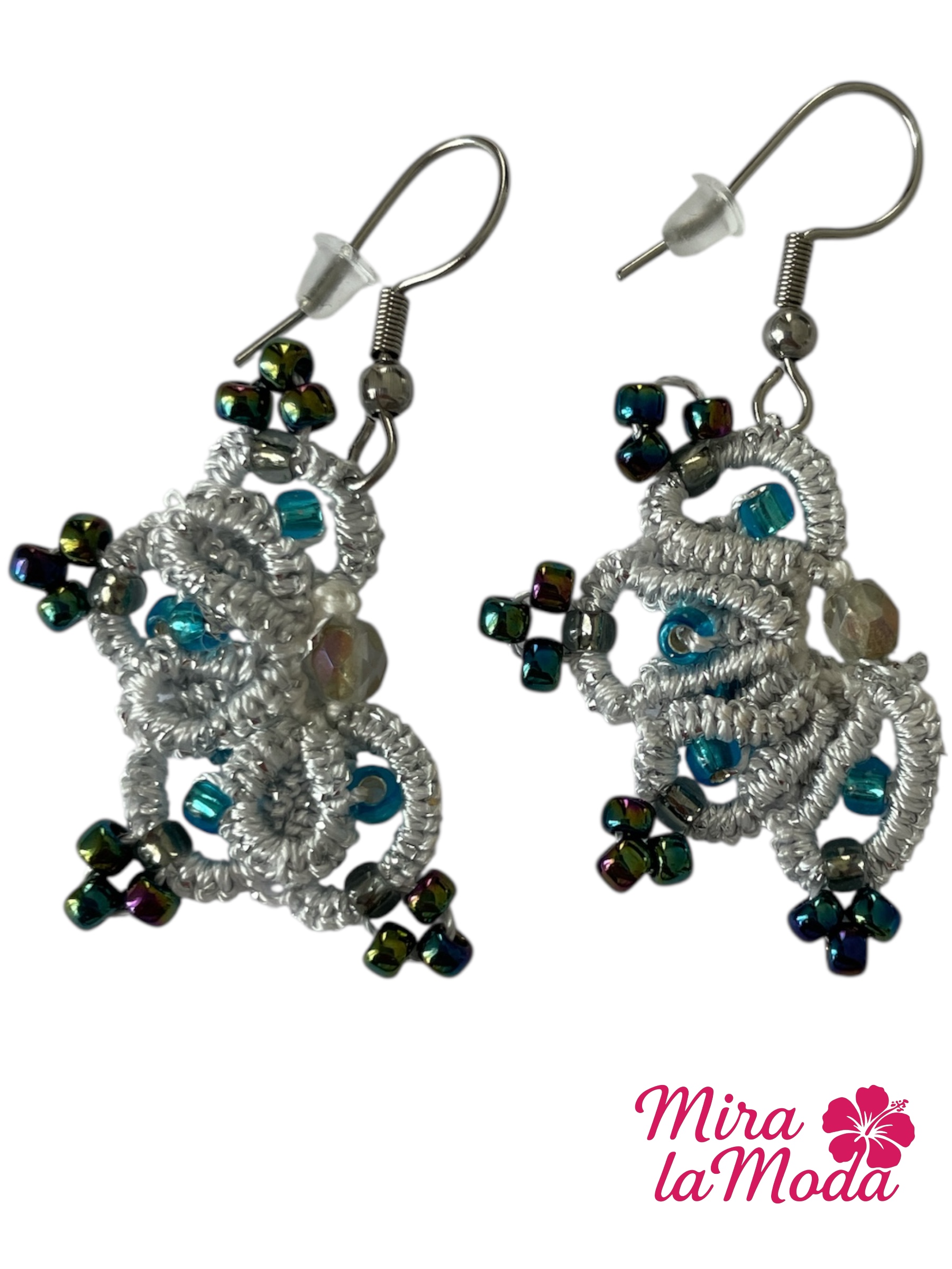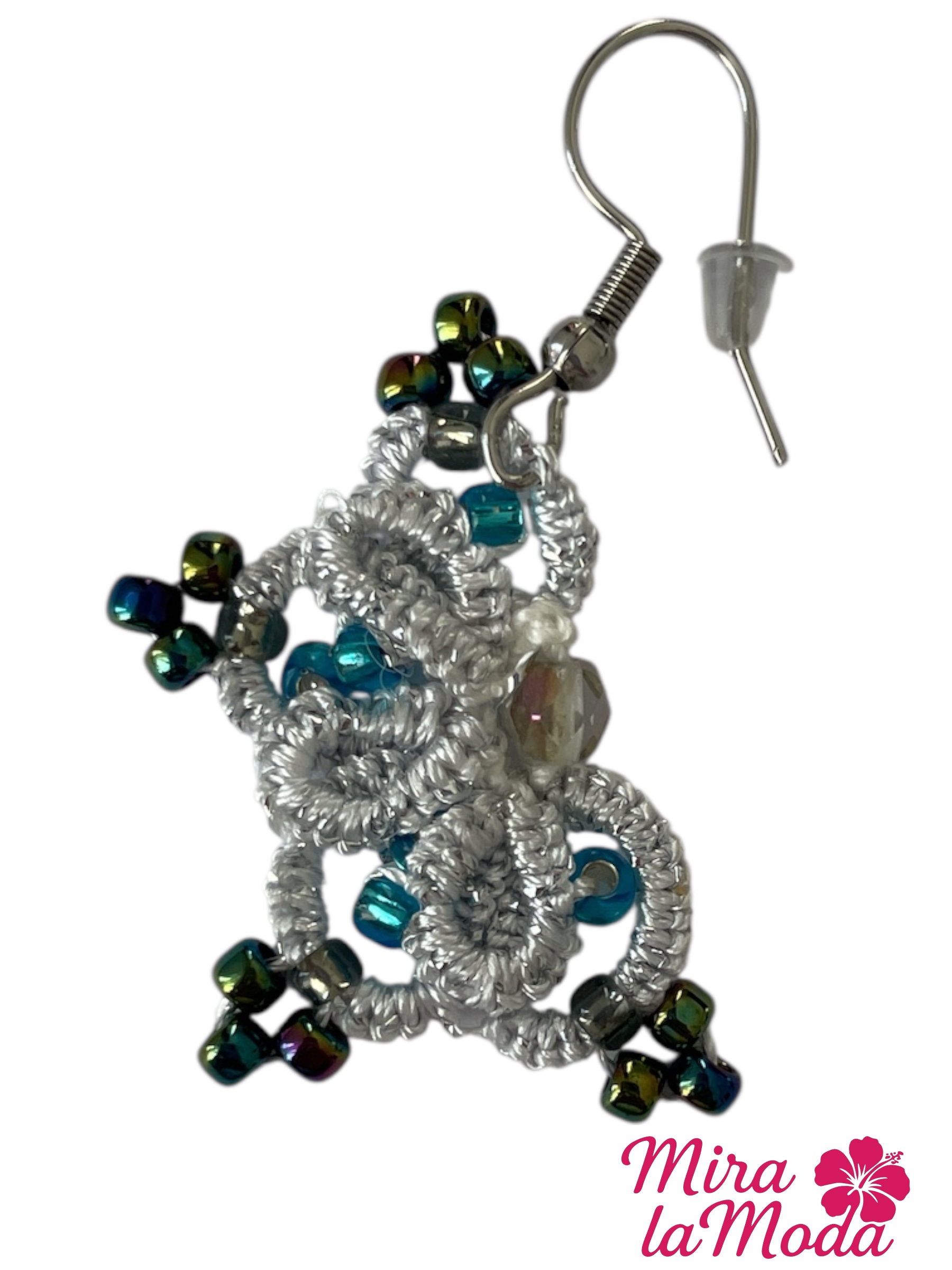 Ręcznie robione kolczyki o subtelnym gwieździstym charakterze, delikatne i pełne uroku. Kolorem dominującym jest biały z dodatkiem srebrnej nici. W środku drobne, przeźroczyste niebieskie koraliki, na brzegach ciemnogranatowe maleńkie koraliki dodające wyrazistości. W centralnym punkcie umiejscowiony jest większy przeźroczysty koralik – subtelny akcent świetlny. Zapięcie- otwarty bigiel w kolorze srebrnym, wykonany ze stali chirurgicznej z silikonową zatyczką.