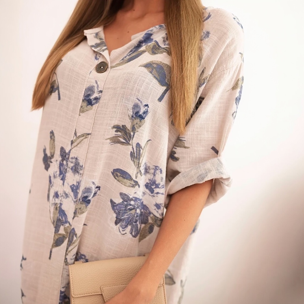 Lekka i wygodna sukienka w kolorze beżowym wykonana z bawełny to doskonały wybór na wiosnę i lato. Luźny, swobodny fason zapewnia komfort noszenia oraz pięknie układa się na sylwetce, gwarantując pełną swobodę ruchów. Sukienka posiada rękawy o długości 3/4, zakładana przez głowę, a dekolt zapinany na jeden większy guziczek, który dodaje sukience subtelnej elegancji. Delikatny, kwiatowy wzór nadaje całości kobiecego charakteru, dzięki czemu sukienka świetnie sprawdzi się zarówno na co dzień, jak i na wyjście. Rozmiar uniwersalny S-L