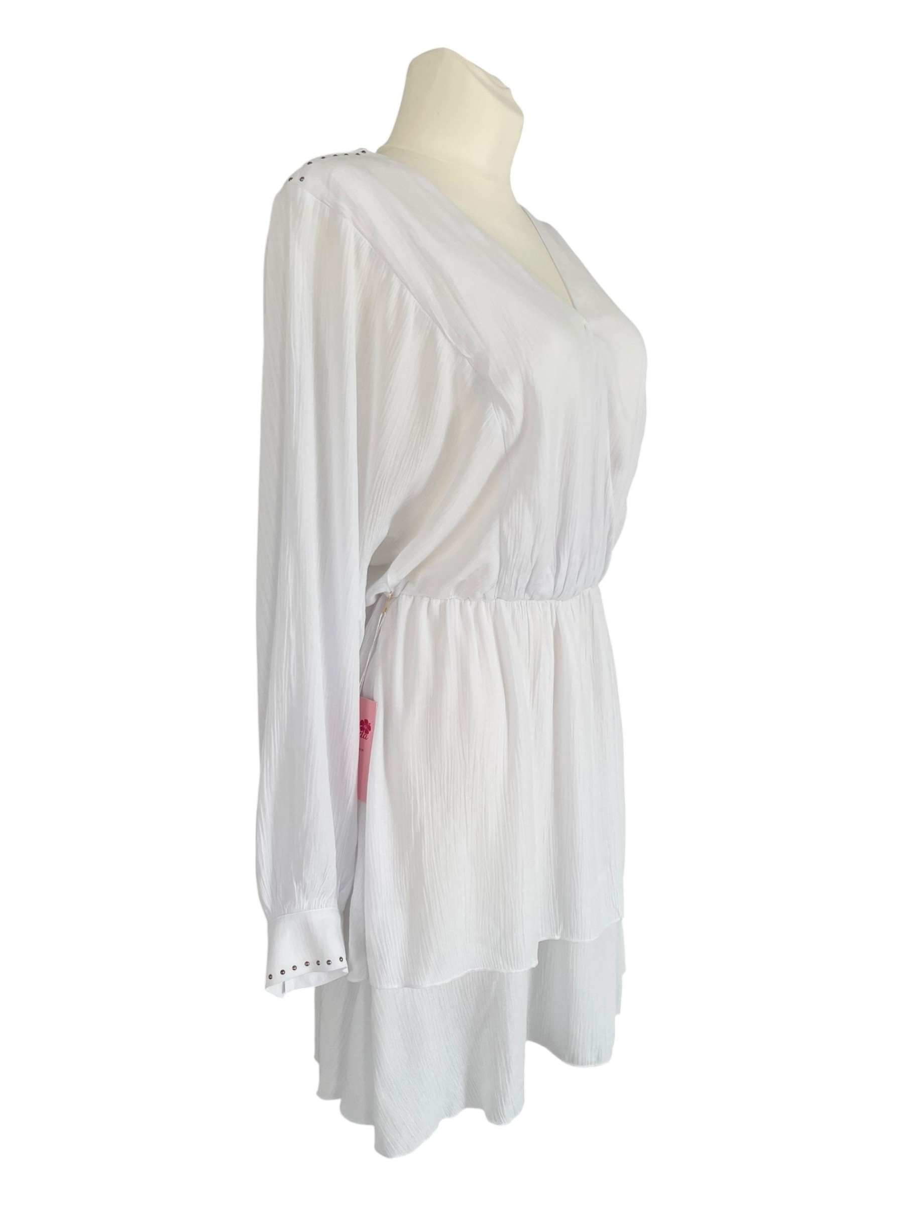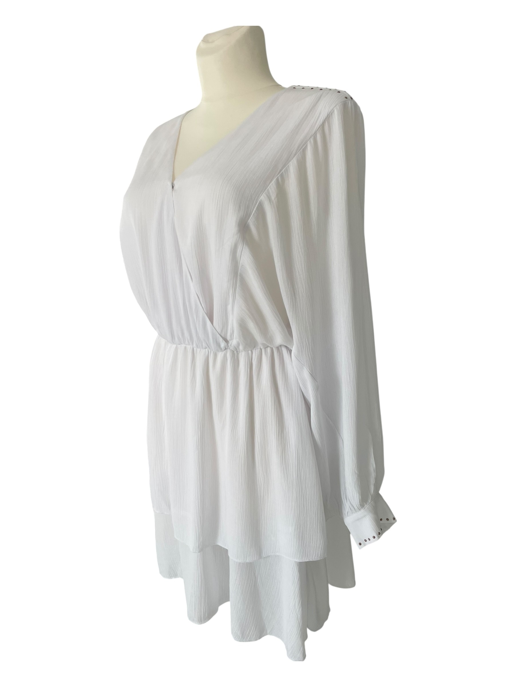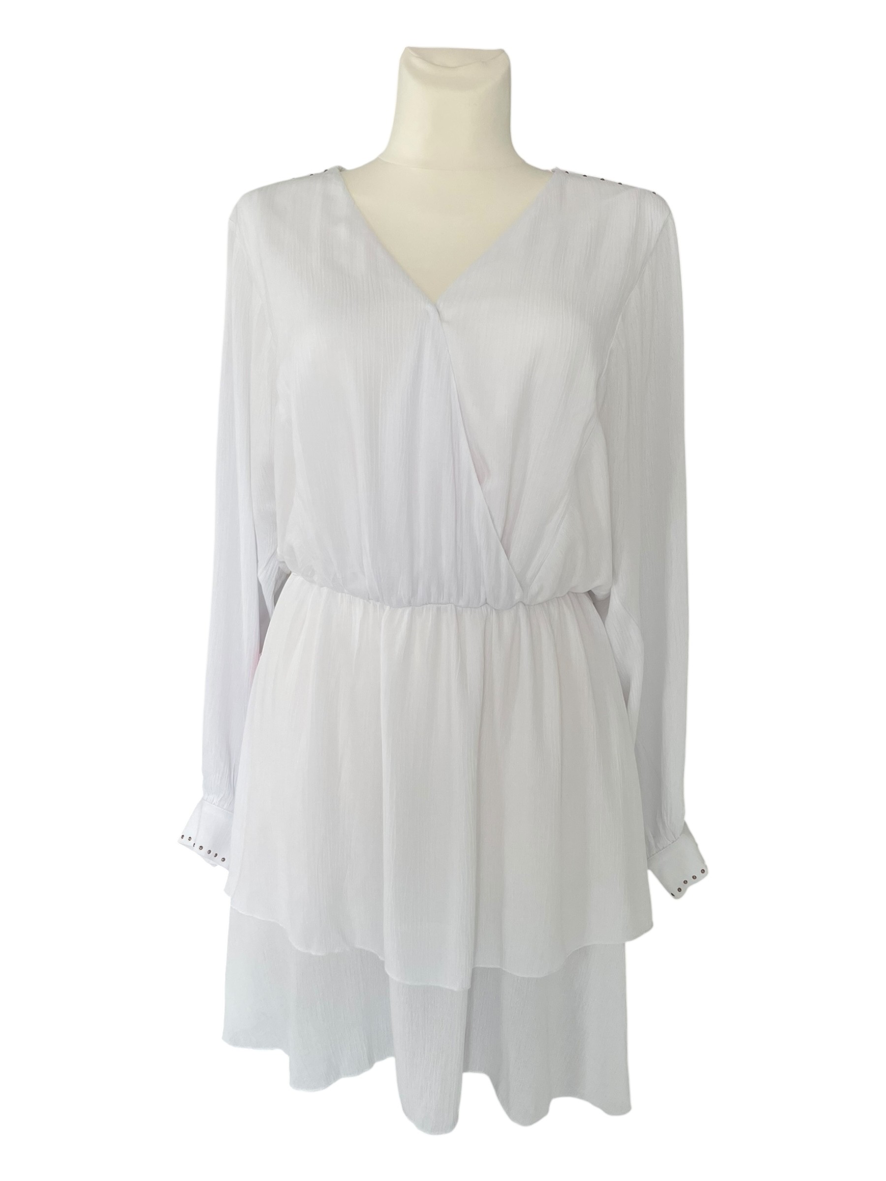 Biała sukienka z długim rękawem to idealne połączenie dziewczęcej lekkości i odrobiny rockowego charakteru. Wykonana z cienkiego , lekko prześwitującego materiału, pięknie układa się na sylwetce. Gumka w pasie delikatnie podkreśla talię, a subtelna falbanka u dołu nadaje całości romantyczny look. Małe metalowe ćwieki na ramionach i mankietach dodają nowoczesnego akcentu, a haftka przy dekolcie pozwala regulować głębokość wycięcia. Idealna na letnie dni 🥰