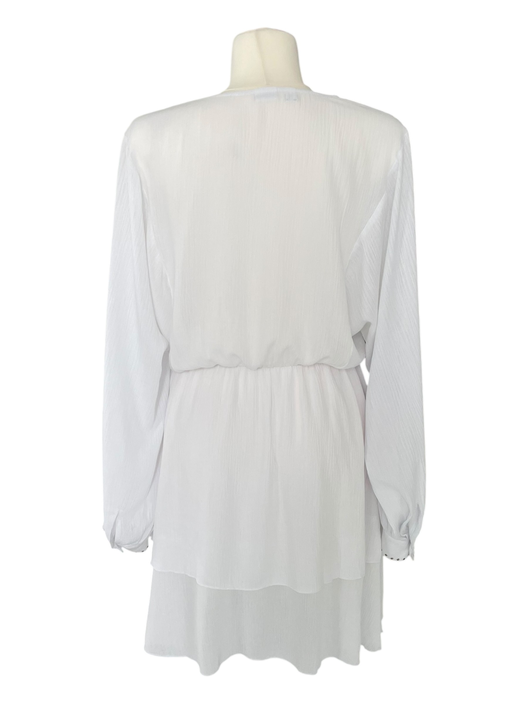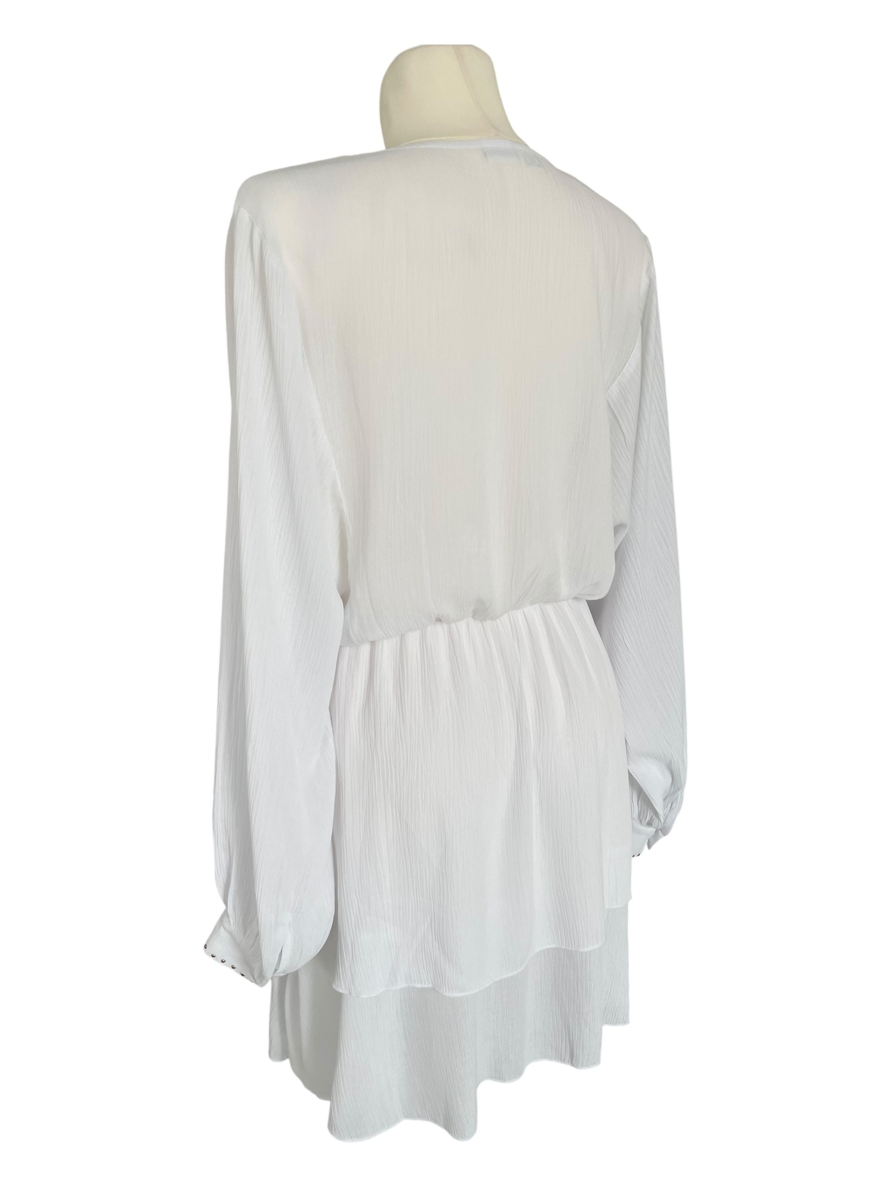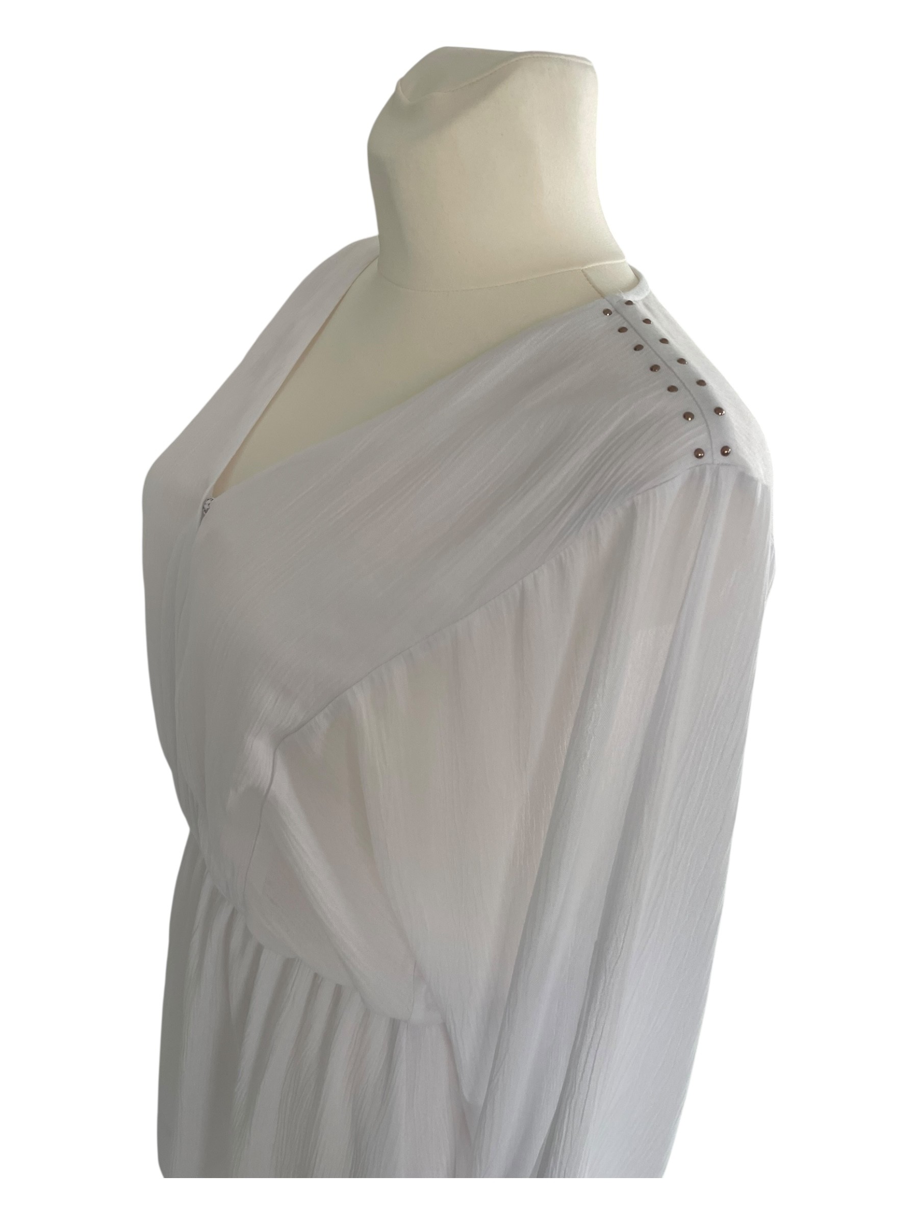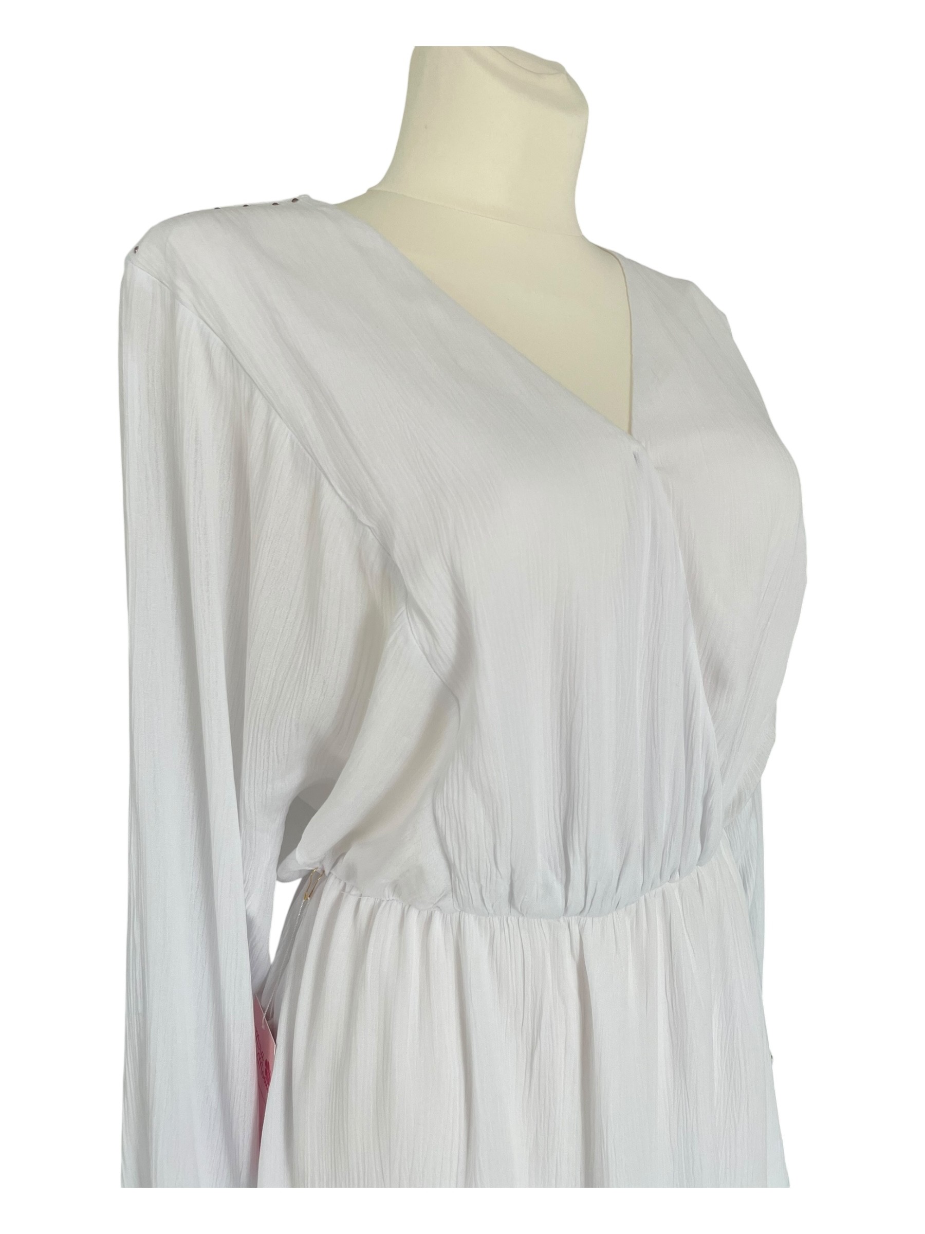Biała sukienka z długim rękawem to idealne połączenie dziewczęcej lekkości i odrobiny rockowego charakteru. Wykonana z cienkiego , lekko prześwitującego materiału, pięknie układa się na sylwetce. Gumka w pasie delikatnie podkreśla talię, a subtelna falbanka u dołu nadaje całości romantyczny look. Małe metalowe ćwieki na ramionach i mankietach dodają nowoczesnego akcentu, a haftka przy dekolcie pozwala regulować głębokość wycięcia. Idealna na letnie dni 🥰