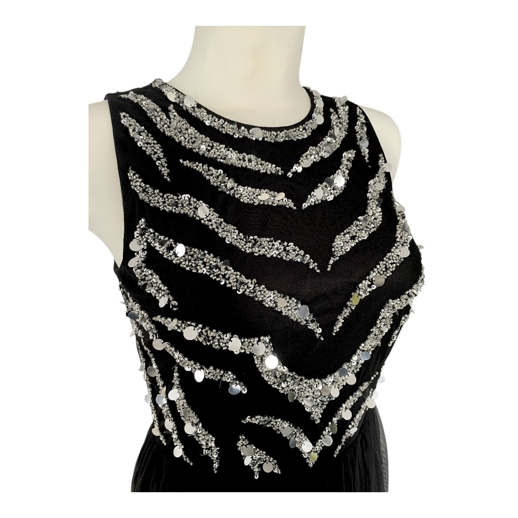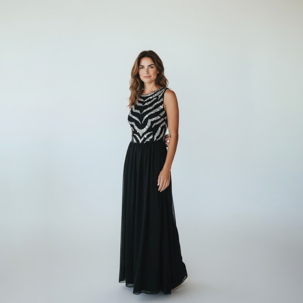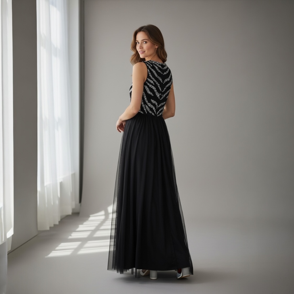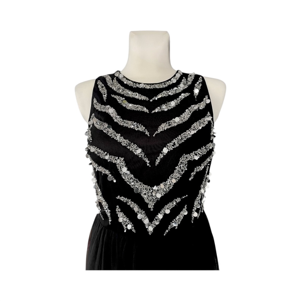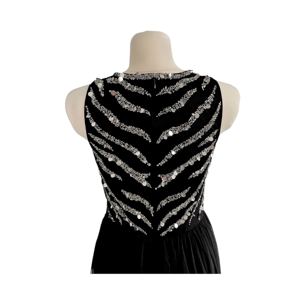 Długa, wieczorowa suknia w klasycznej, głębokiej czerni łączy w sobie elegancję i wyrafinowany styl. Spódnica sukni jest dwuwarstwowa od spodu wykonana z gładkiego, ciężkiego i lekko lejącego materiału, który pięknie układa się w ruchu, zapewniając komfort i elegancką linię. Na wierzchu spódnicy delikatna, prześwitująca koronka dodaje sukni subtelnej lekkości i romantycznego charakteru, a lekko rozkloszowany fason podkreśla sylwetkę, zachowując klasyczną elegancję. Gorset sukni jest dopasowany, bez rękawów, z okrągłym dekoltem blisko szyi, co nadaje całości nowoczesnego i stylowego wyrazu. Tył sukni zapinany na zamek. Cała góra sukni pokryta jest cekinami w różnych rozmiarach, które tworzą efektowny wzór inspirowany zebrą – połyskujące detale przyciągają wzrok i nadają sukni wyjątkowego blasku podczas wieczornych okazji. Idealna na eleganckie gale, przyjęcia i wyjątkowe wieczory, gdzie klasyka spotyka się z odrobiną ekstrawagancji.
