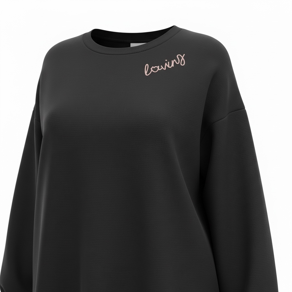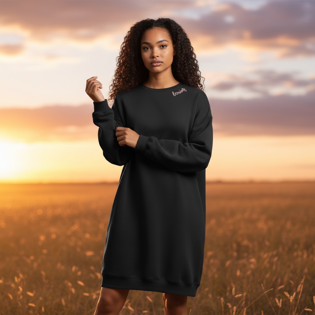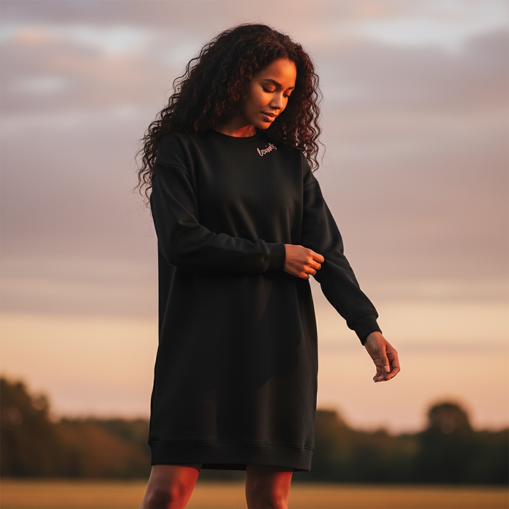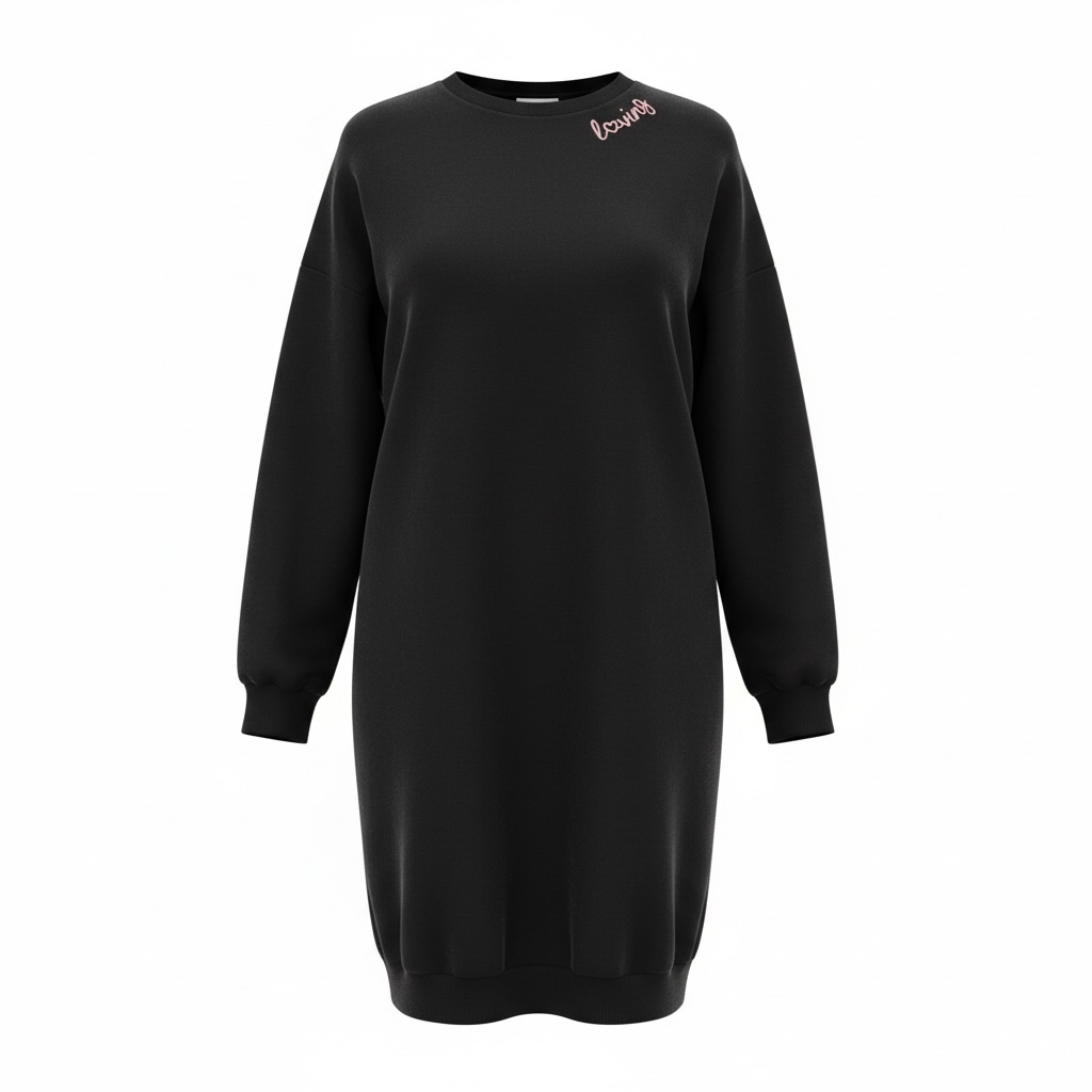 Model o prostym, lekko luźnym kroju przypomina dłuższą bluzę, dzięki czemu świetnie układa się na sylwetce i zapewnia maksymalny komfort noszenia. Wykonana z wysokiej jakości bawełny, jest miękka, przewiewna i przyjazna dla skóry. Długie rękawy zakończone ściągaczami oraz delikatnie zwężany dół nadają jej sportowo-miejski charakter. Dodatkowym atutem są praktyczne kieszenie, które zwiększają funkcjonalność i wygodę użytkowania. Klasyczna czerń sprawia, że sukienka jest uniwersalna i łatwa do stylizacji – pasuje zarówno do sneakersów, jak i botków. Subtelnym akcentem jest niewielki haft przy dekolcie, który dodaje całości kobiecego uroku i wyróżnia model spośród basicowych fasonów.