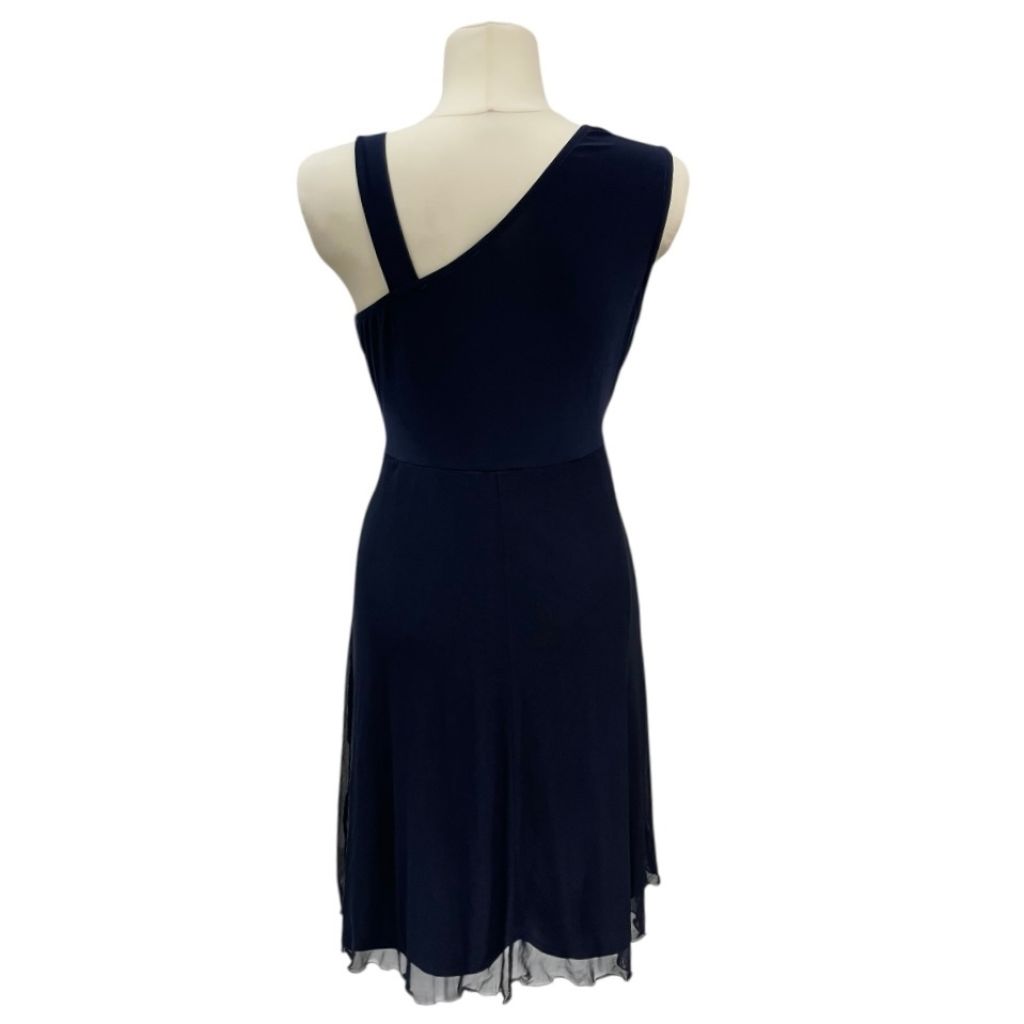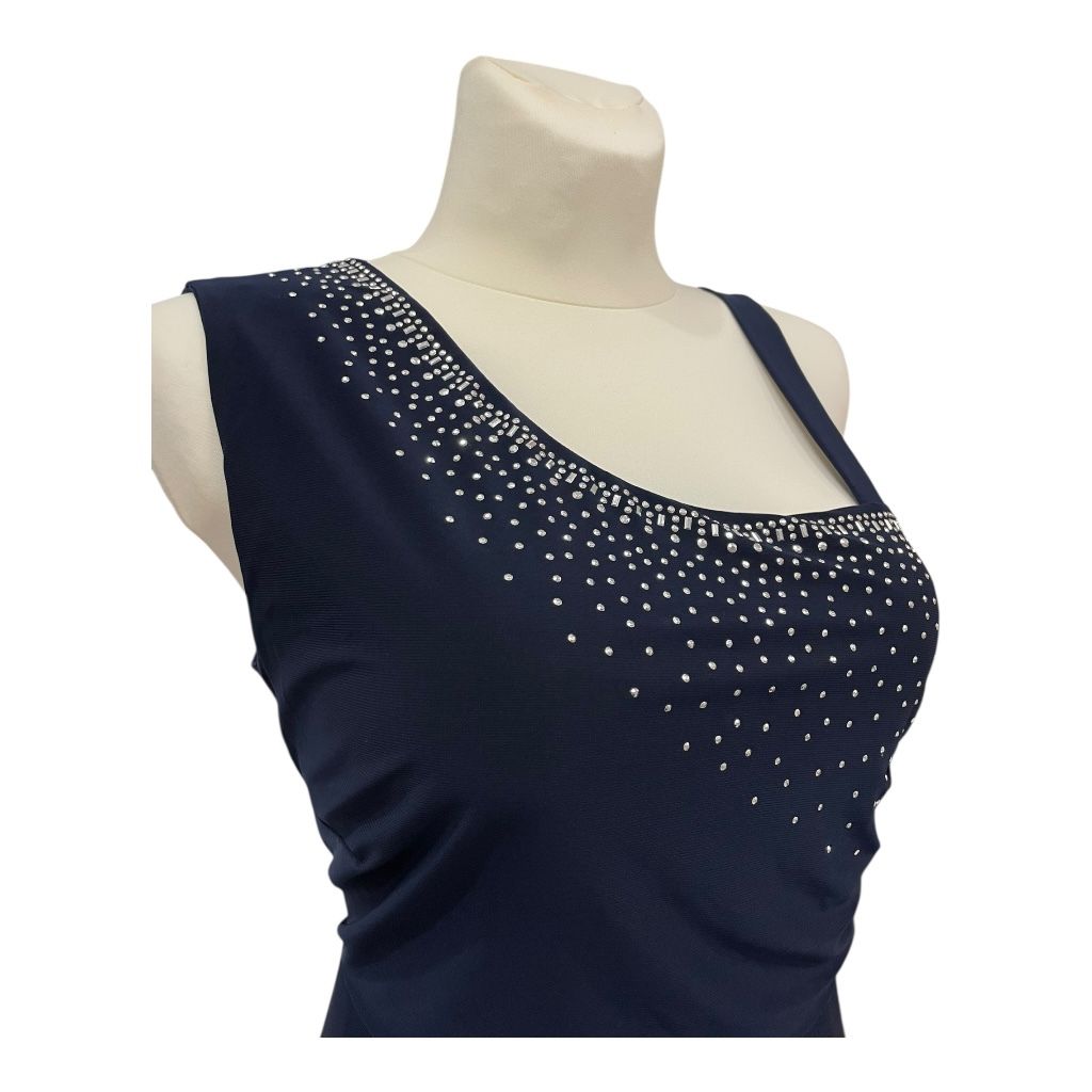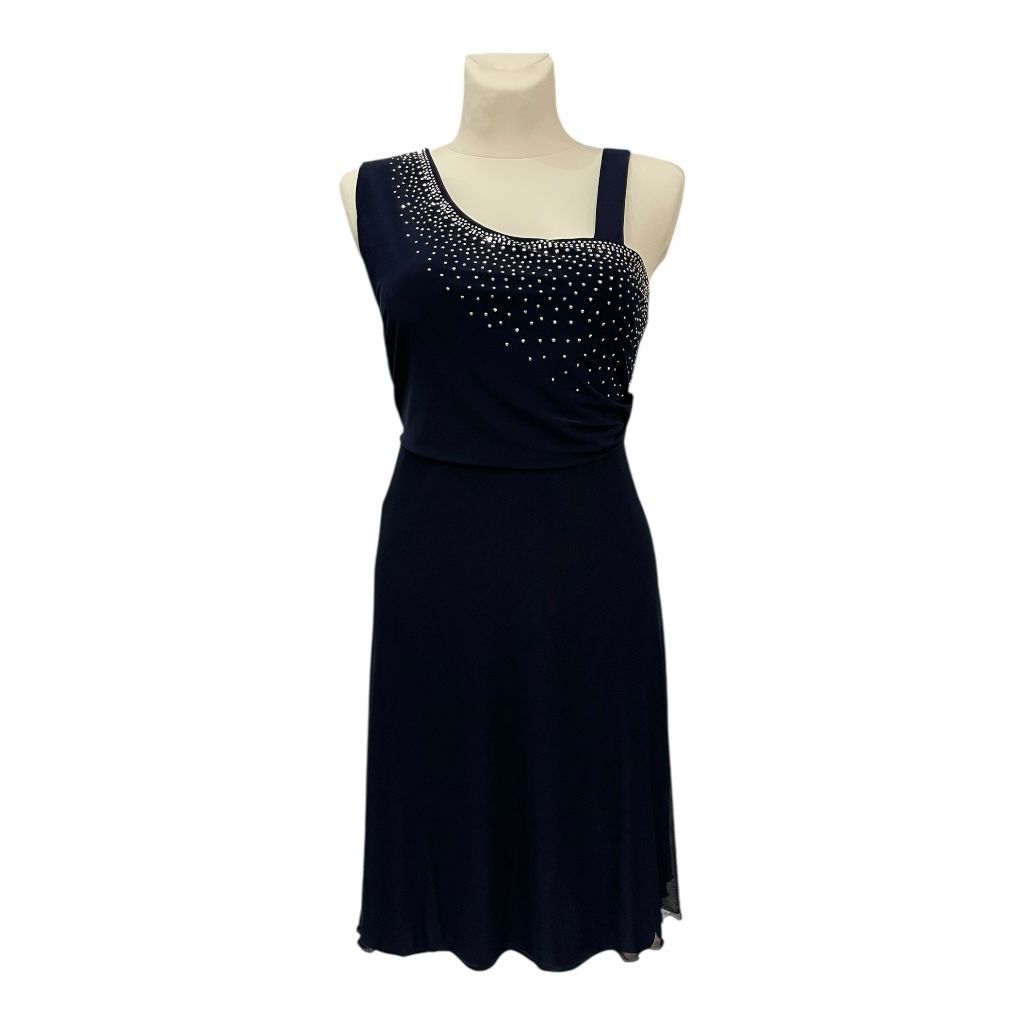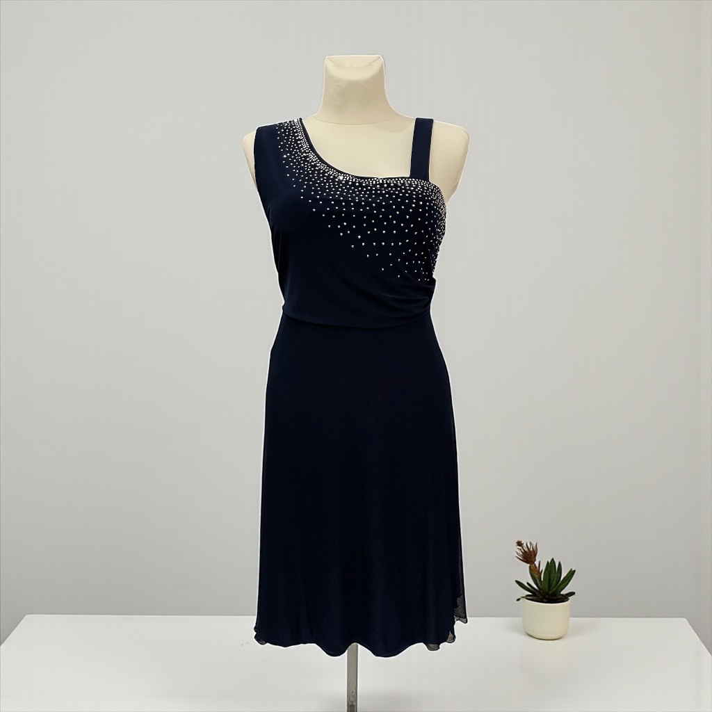 Ta stylowa, granatowa sukienka do kolan to idealny wybór na Sylwestra oraz wszystkie wieczorne wyjścia. Model wyróżnia się asymetryczną górą – z jednej strony ramiączko jest klasyczne, z drugiej szerokie i efektownie wyprofilowane, co nadaje sukience nowoczesnego charakteru. Góra sukienki ozdobiona jest drobniutkimi, srebrzystymi dżetami, które układają się niczym rozsypane gwiazdy na nocnym niebie. Dzięki temu całość pięknie połyskuje przy każdym ruchu, tworząc efekt glamour. Sukienka ma lekko rozkloszowany dół, który swobodnie układa się na sylwetce i zapewnia komfort przez całą noc. Tkanina miękko pracuje i delikatnie podkreśla kształty, jednocześnie nie opinając zbyt mocno