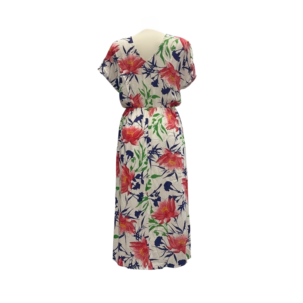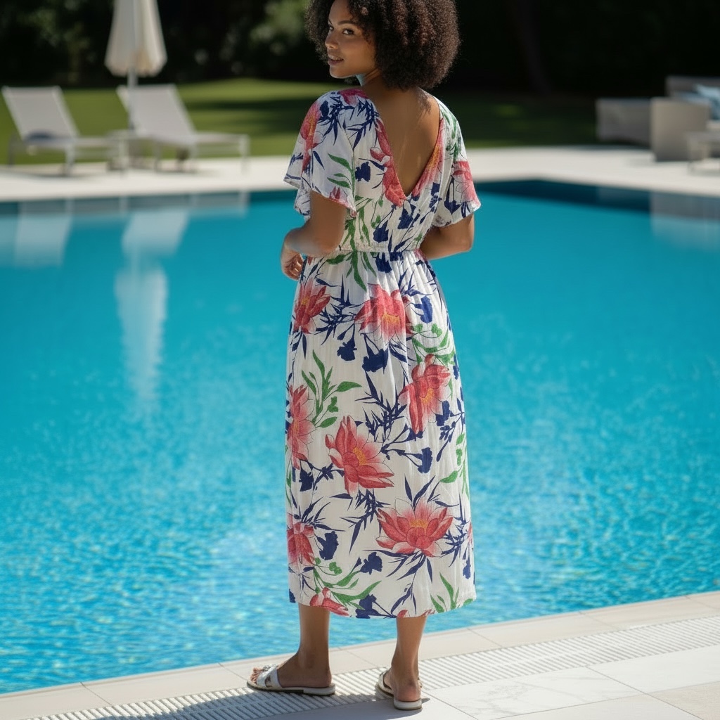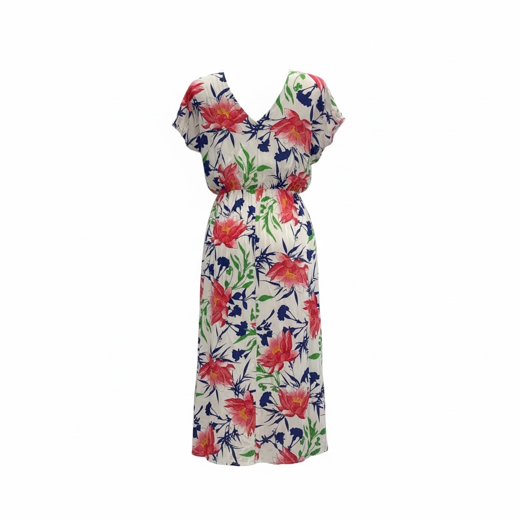 Lekka i niezwykle komfortowa letnia sukienka z wiskozy, idealna na lato. Cienki, przewiewny materiał pięknie układa się na sylwetce i zapewnia komfort nawet podczas upałów. Model o długości do połowy łydki, posiada elastyczną gumkę w pasie, która delikatnie podkreśla talię i dopasowuje się do figury. Krótkie rozcięcia po bokach dodają lekkości. Dekolt zarówno z przodu jak i z tyłu w kształcie litery V, oraz krótki rękaw sprawiają, że sukienka jest wygodna i uniwersalna. Kolorowy, kwiatowy wzór nadaje całości letniego, wakacyjnego stylu i świetnie sprawdzi się zarówno na co dzień, jak i podczas urlopu czy spacerów nad morzem.