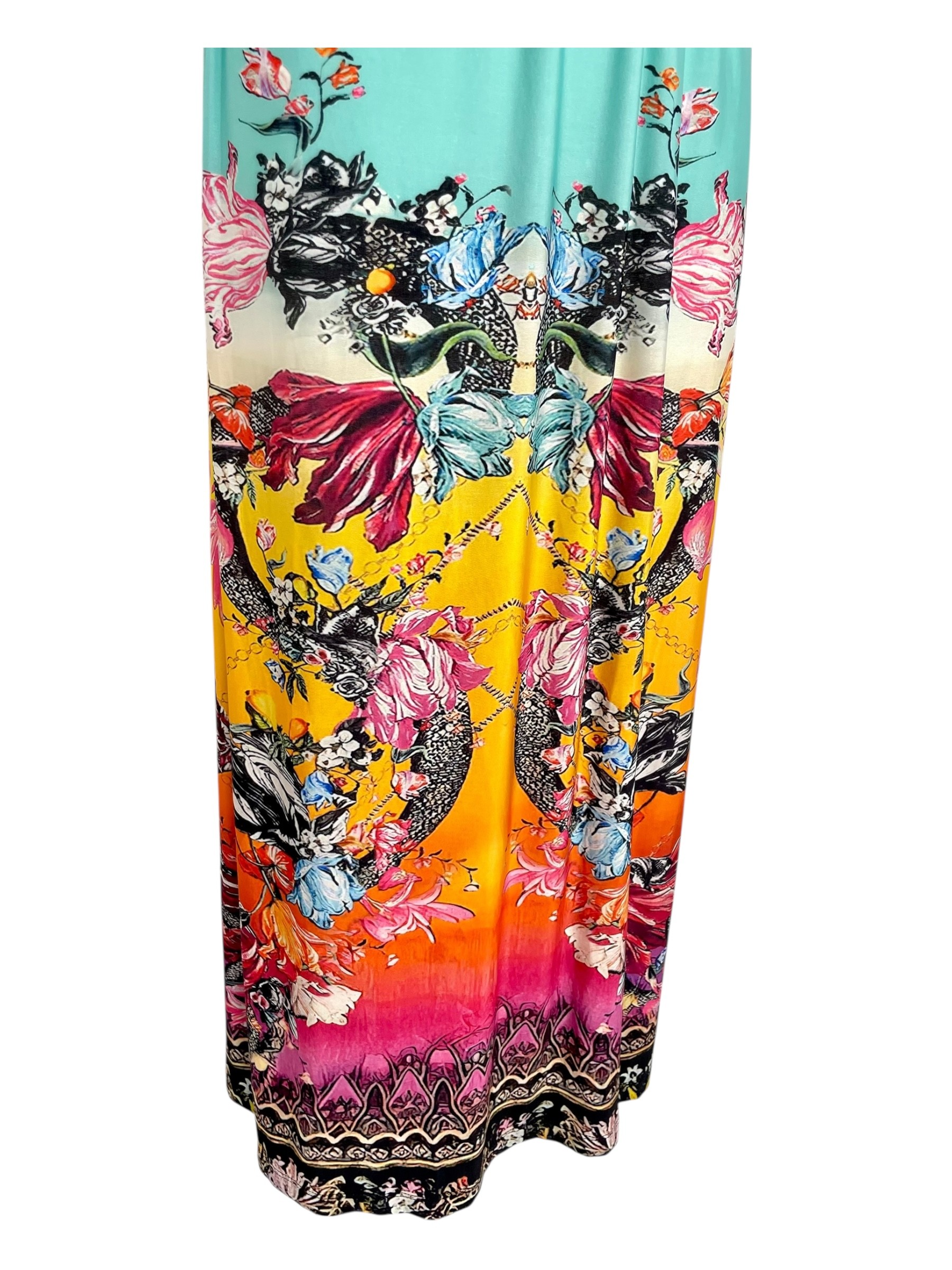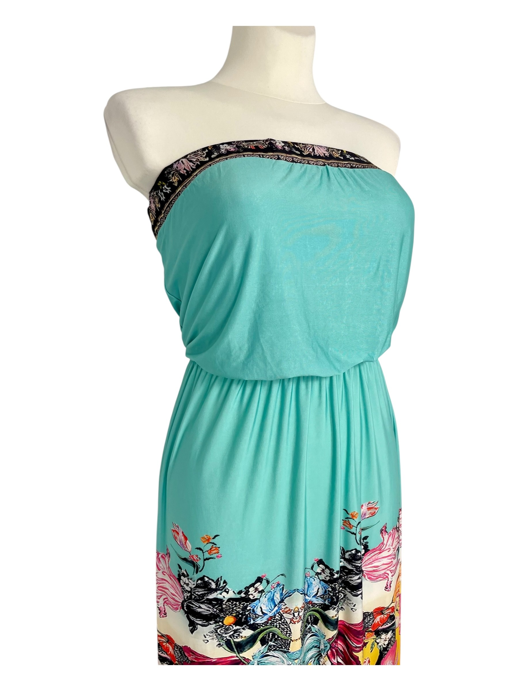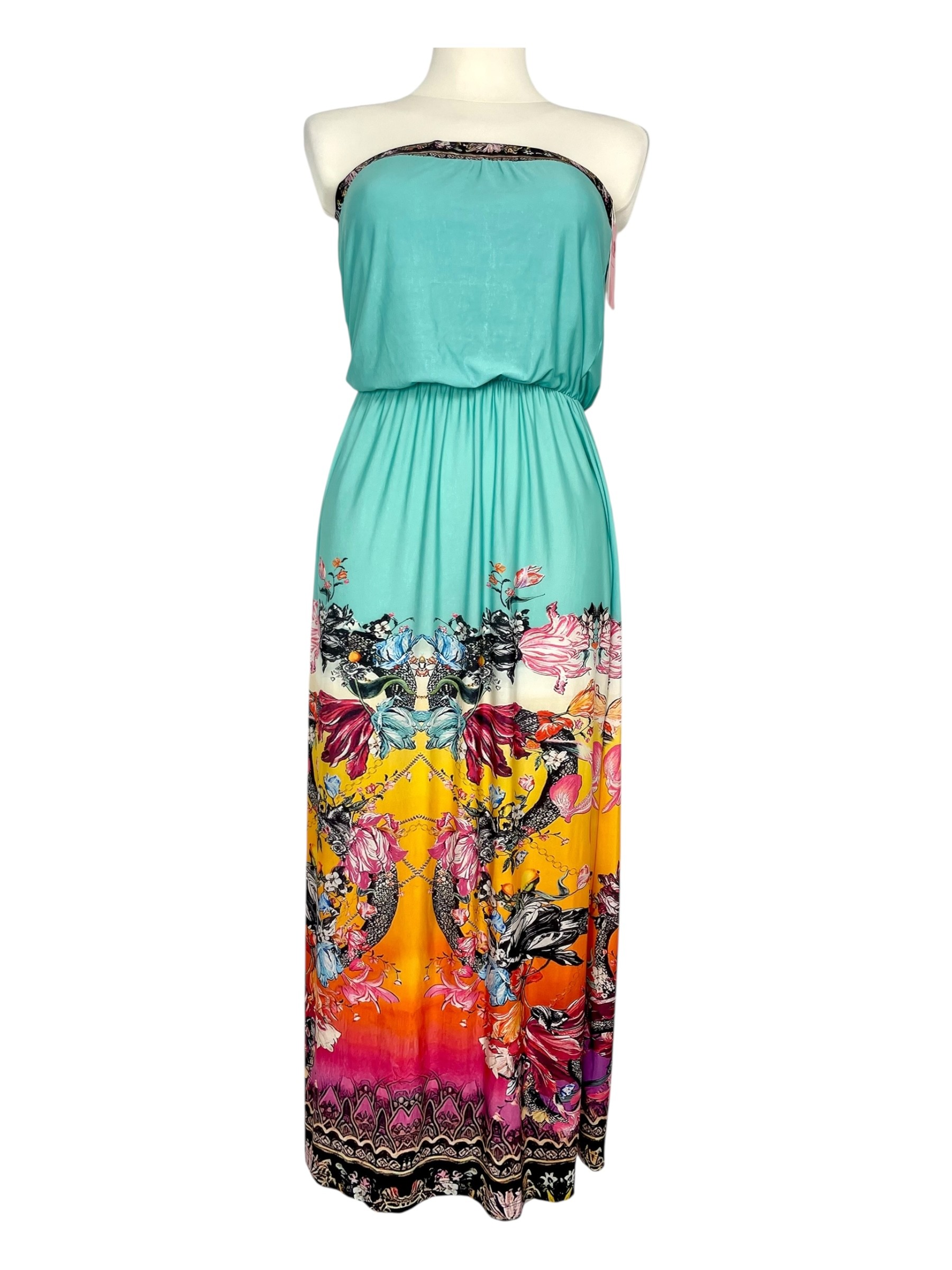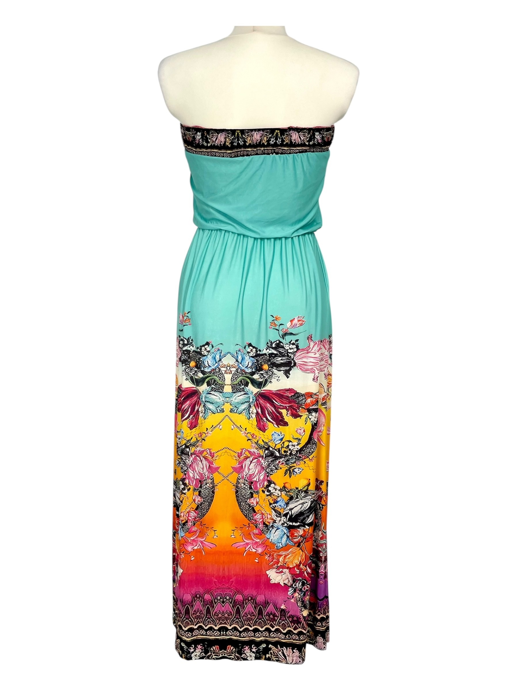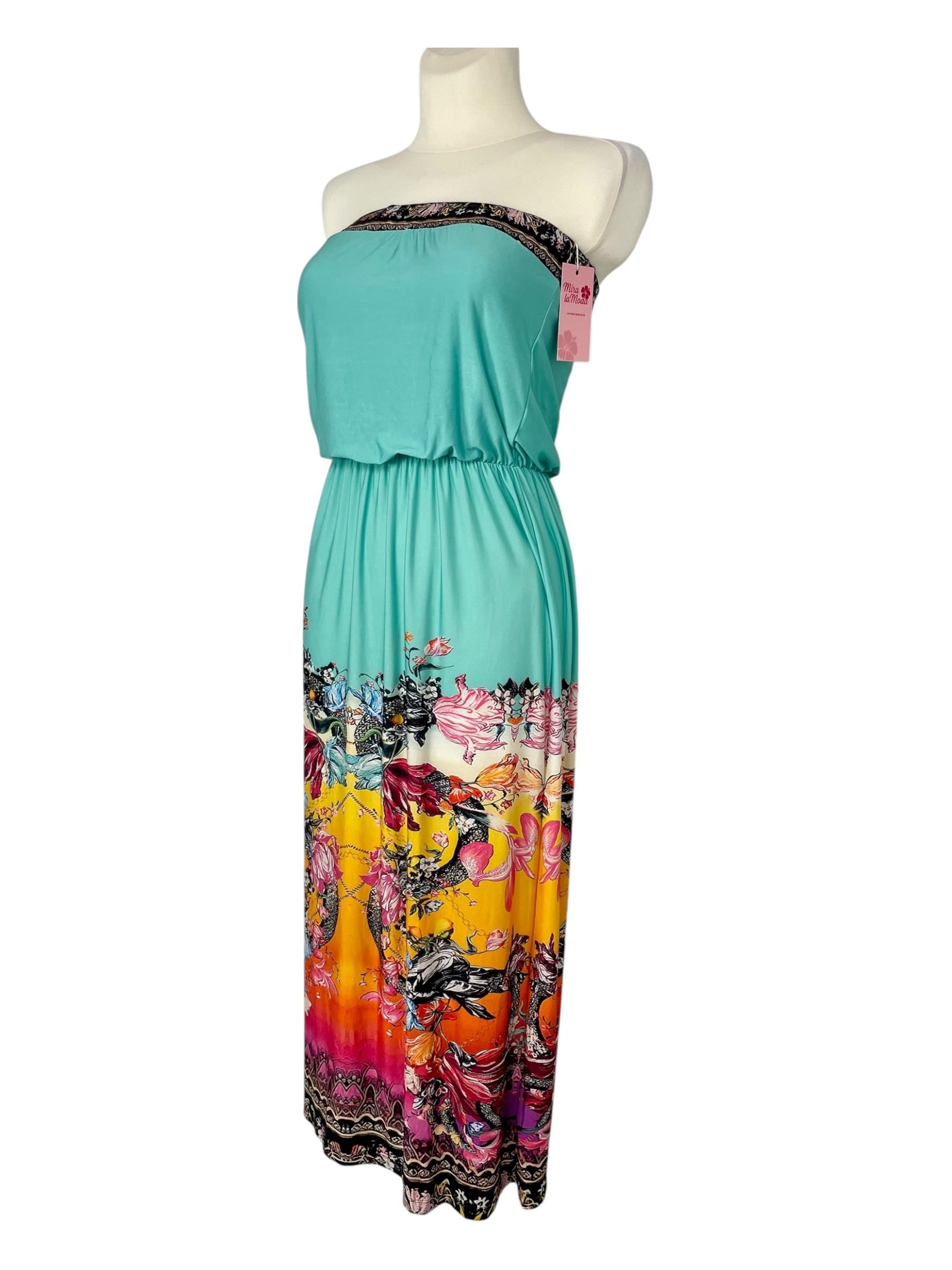 Zachwycająca długa sukienka, wykonana z lesistego materiału, z orientalnym indyjskim wzorem w wielobarwnym intensywnym kolorze. W talii wszyta elastyczna gumka, która pięknie podkreśla kobiecą figurę. Nad piersiami szersza guma, która idealnie utrzymuje sukienkę na właściwym miejscu. Doskonale sprawdzi się zarówno na spacer po plaży, wakacyjne zakupy jak i wieczorne spotkanie.