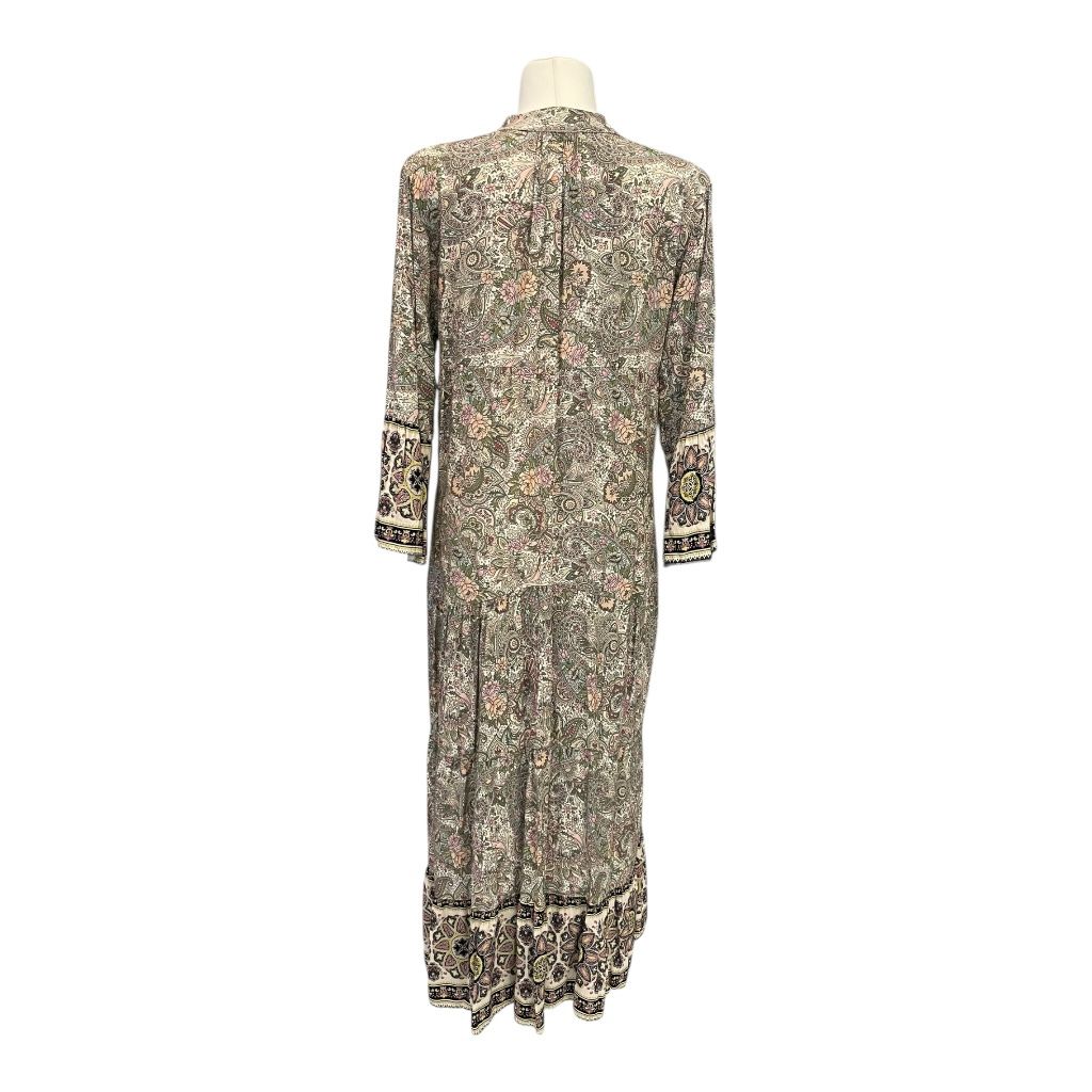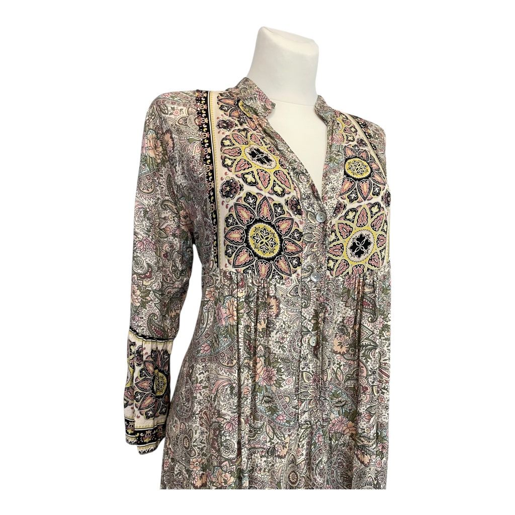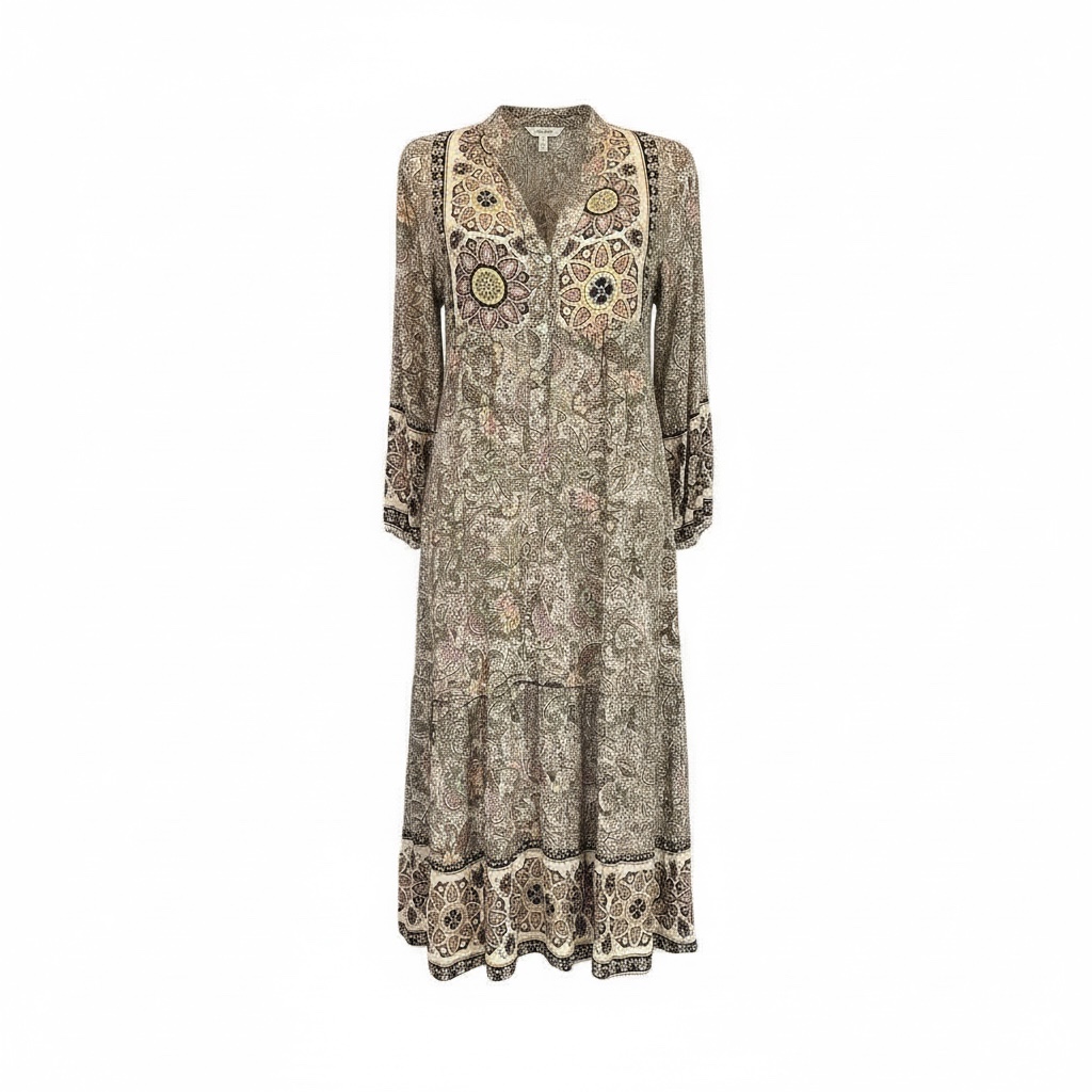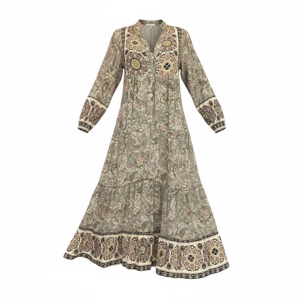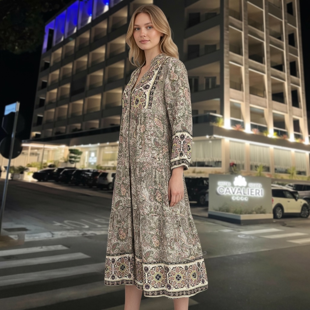 Ta wyjątkowa długa trapezowa sukienka uszyta z miękkiej, oddychającej wiskozy to idealna propozycja dla kobiet, które cenią wygodę połączoną z wyrafinowanym włoskim stylem. Zwiewny krój pięknie układa się na sylwetce i dodaje jej lekkości Sukienka ze stójką, dekolt w kształcie litery V, zapinana na trzy guziczki subtelnie podkreśla linię szyi i biustu a długie rękawy zakończone falbanką nadają elegancji. Efektowne geometryczne motywy z delikatną imitacją marokańskich wzorów przyciąga spojrzenia. Materiał to w 100% wysokiej jakości wiskoza, miękka, przyjemna w dotyku i idealna na każdą porę roku. Sukienka pięknie prezentuje się z botkami, sandałkami lub klasycznymi szpilkami, sprawdzi się zarówno na co dzień, jak i na wyjątkowe okazje.