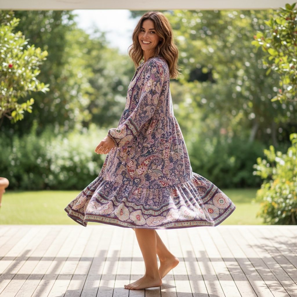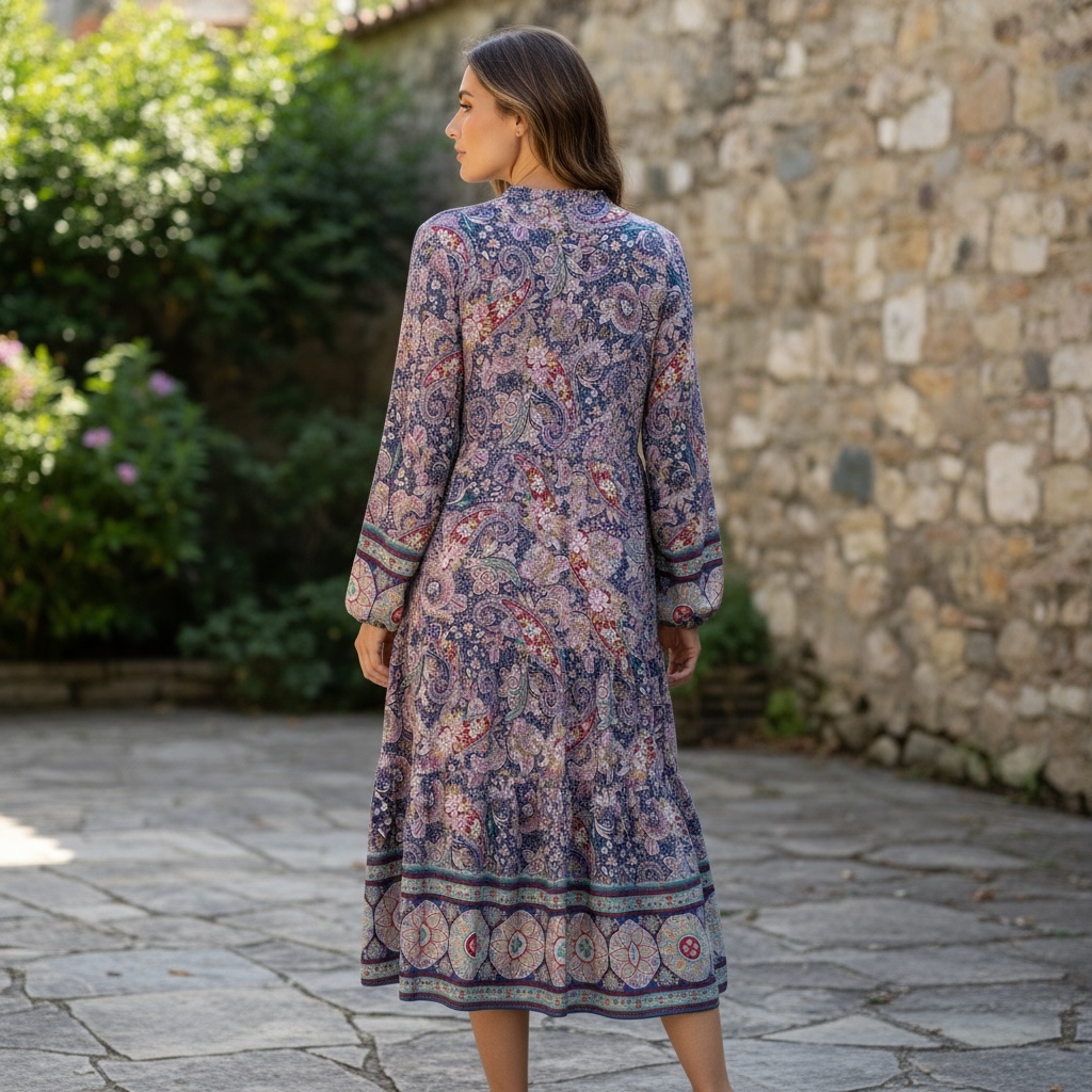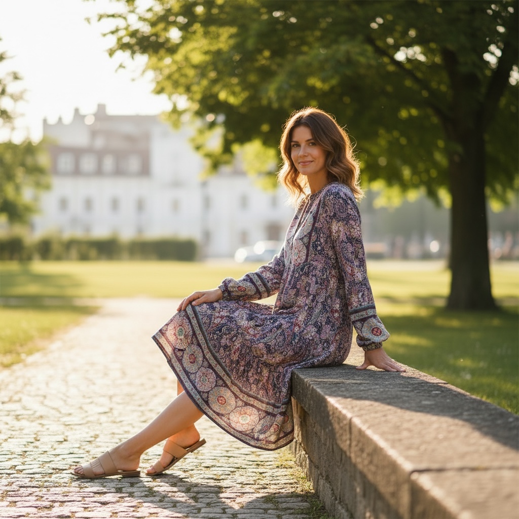 Ta wyjątkowa długa trapezowa sukienka uszyta z miękkiej, oddychającej wiskozy to idealna propozycja dla kobiet, które cenią wygodę połączoną z wyrafinowanym włoskim stylem. Zwiewny krój pięknie układa się na sylwetce i dodaje jej lekkości Sukienka z dekoltem w kształcie litery V, zapinana na cztery guziczki subtelnie podkreśla linię szyi i biustu a długie rękawy zakończone gumką nadają elegancji. Efektowne kwieciste motywy z delikatną imitacją marokańskich wzorów przyciąga spojrzenia. Materiał to w 100% wysokiej jakości wiskoza, miękka, przyjemna w dotyku i idealna na każdą porę roku. Sukienka pięknie prezentuje się z botkami, sandałkami lub klasycznymi szpilkami, sprawdzi się zarówno na co dzień, jak i na wyjątkowe okazje.