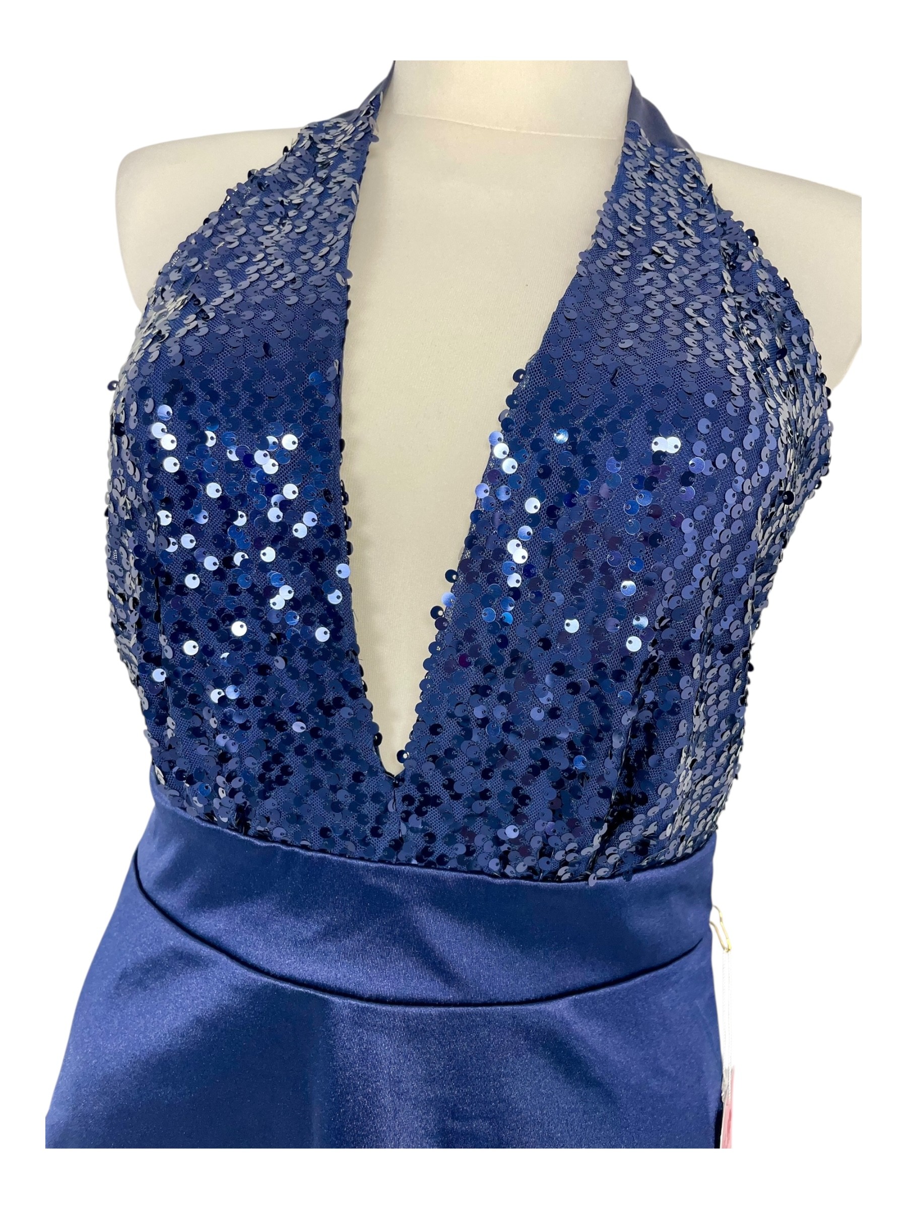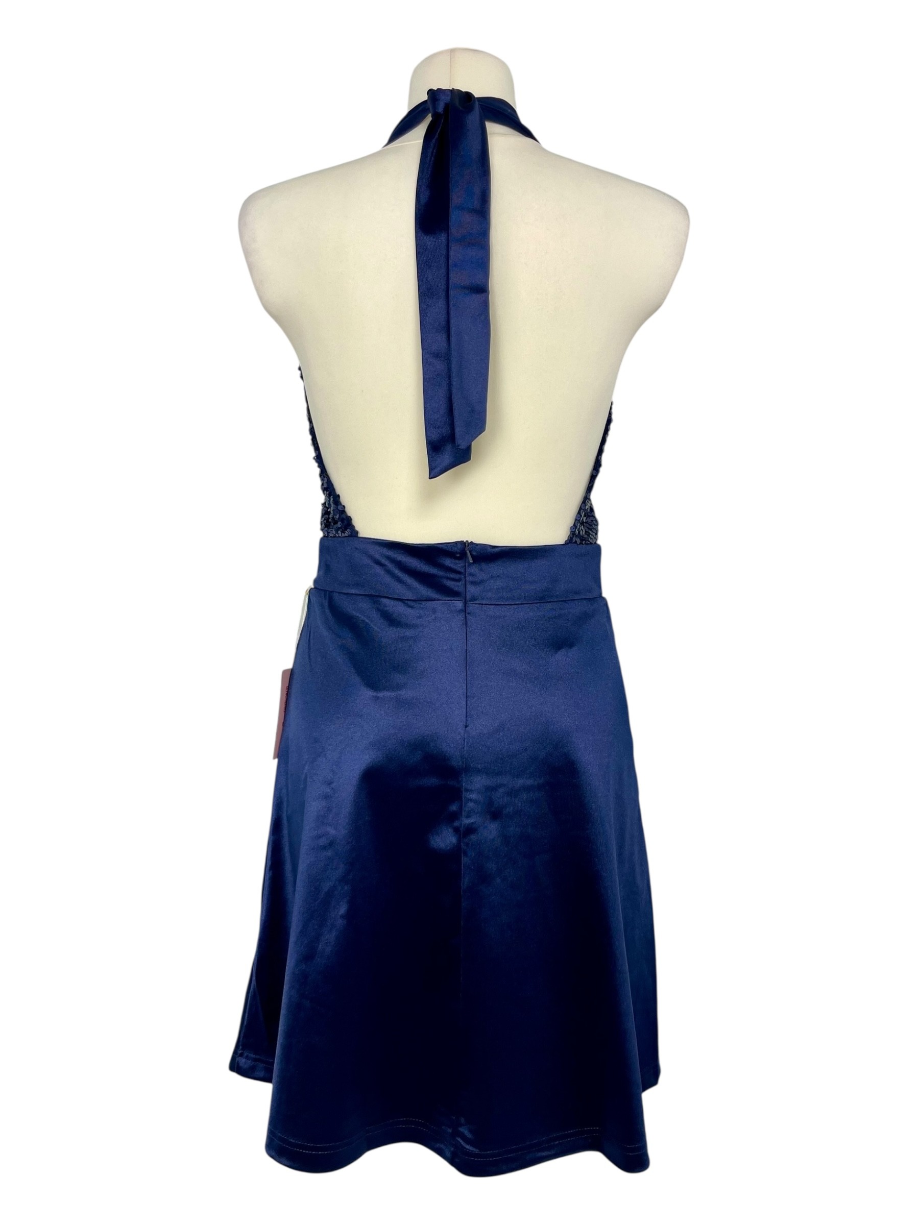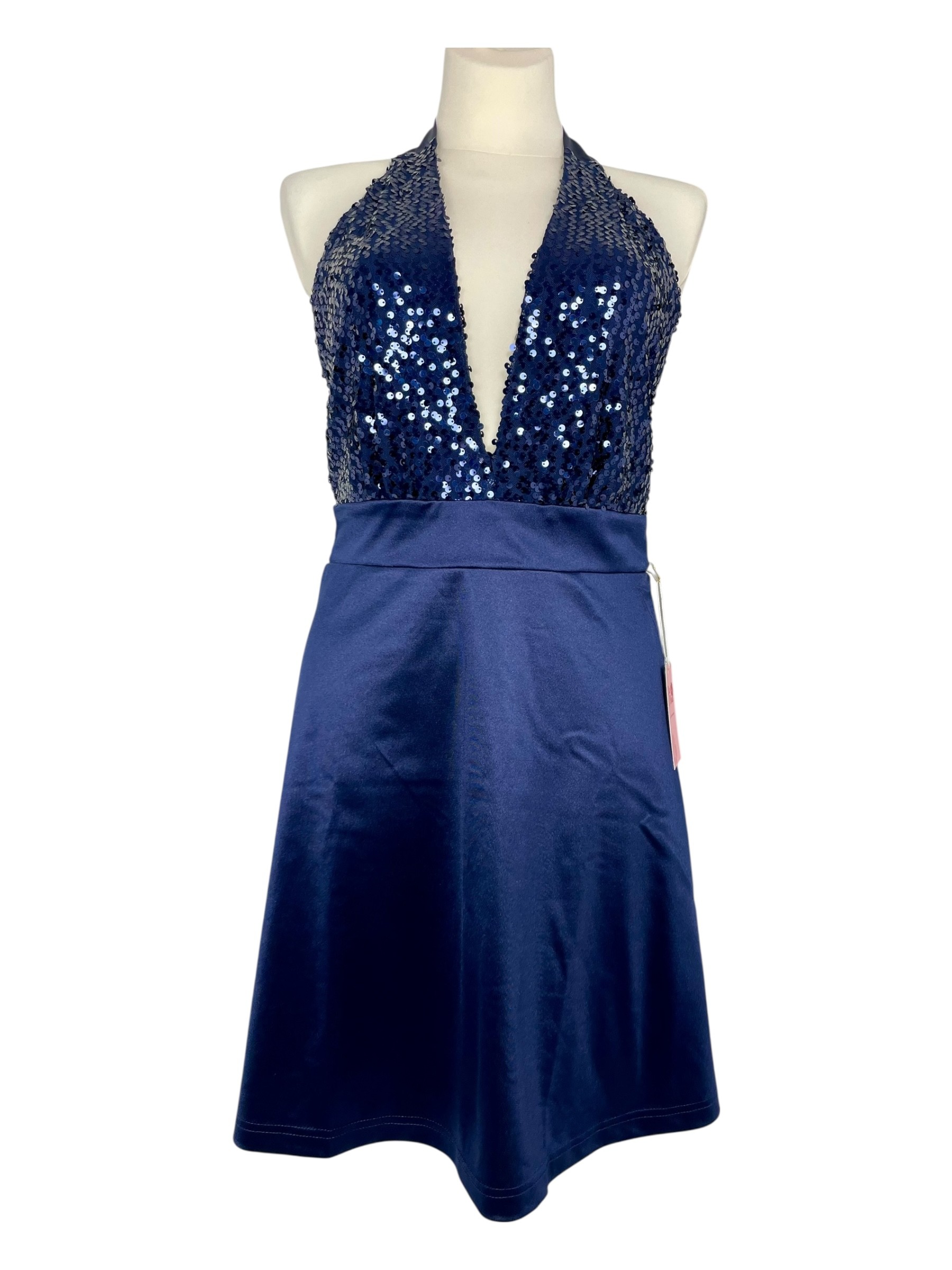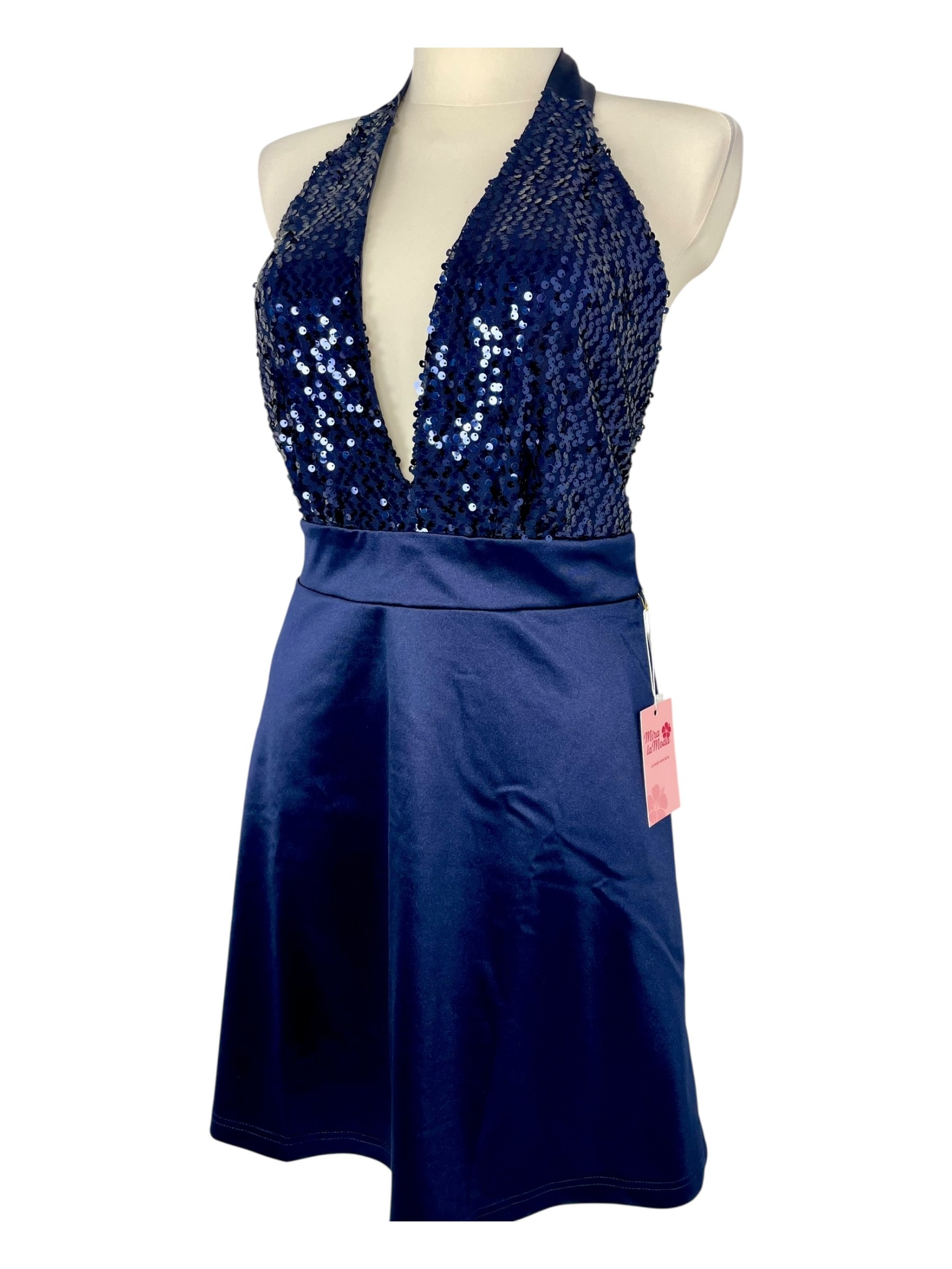 Granatowa sukienka o długości do kolan z efektownym wiązaniem na szyi i górą ozdobioną połyskującymi cekinami. Subtelnie podkreśla ramiona i szyję, dodając stylizacji elegancji i blasku. Z tyłu zapinana na zameczek. Idealna na wyjątkowe okazje od wesel po wieczorne wyjście. Dla młodych kobiet które lubią wyglądać kobieco ceniących szykowną prostotę i subtelne detale.