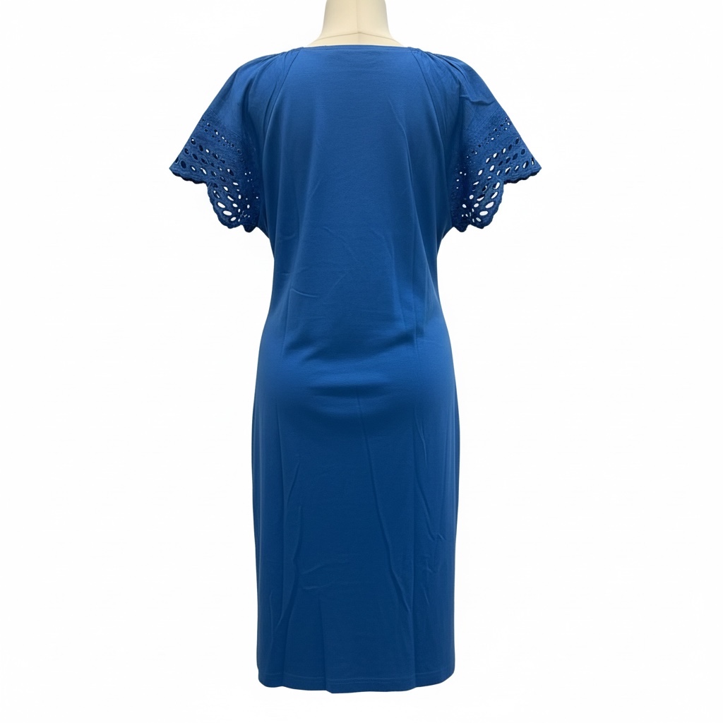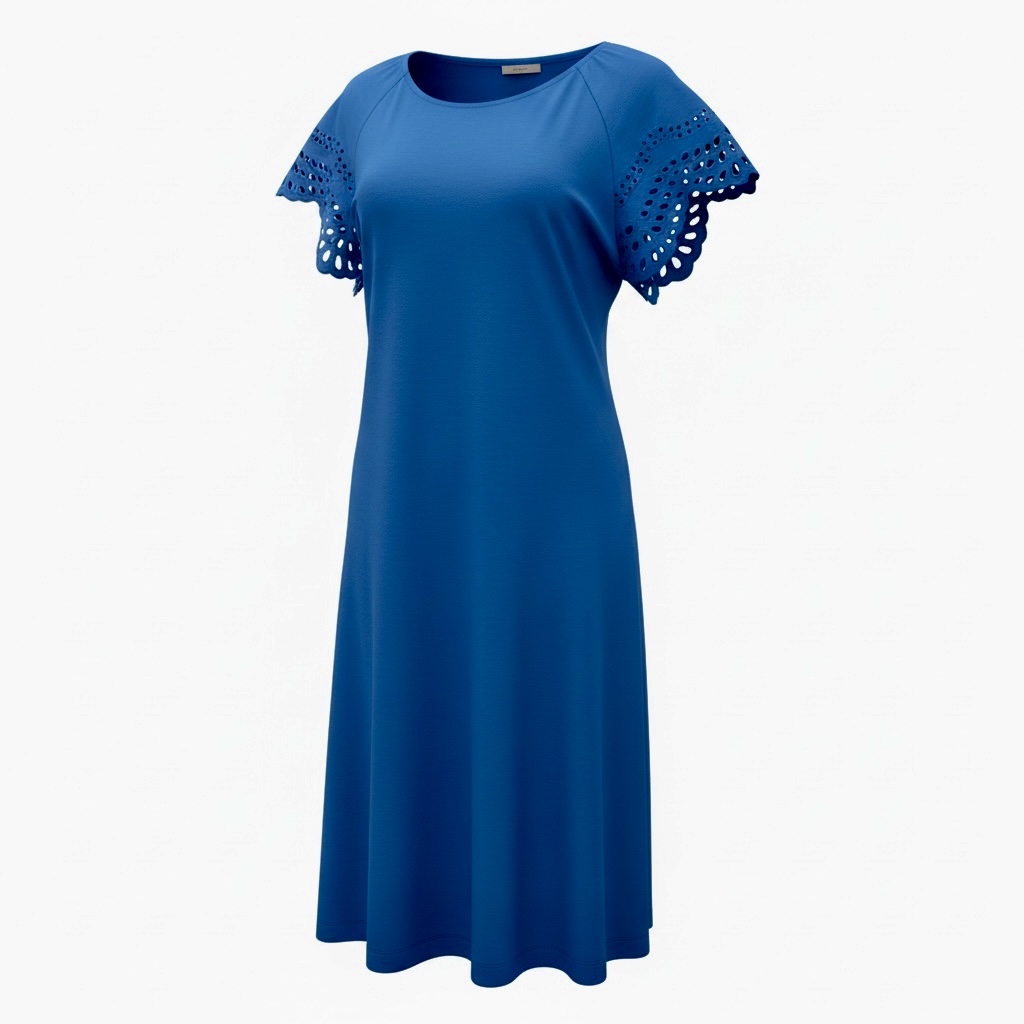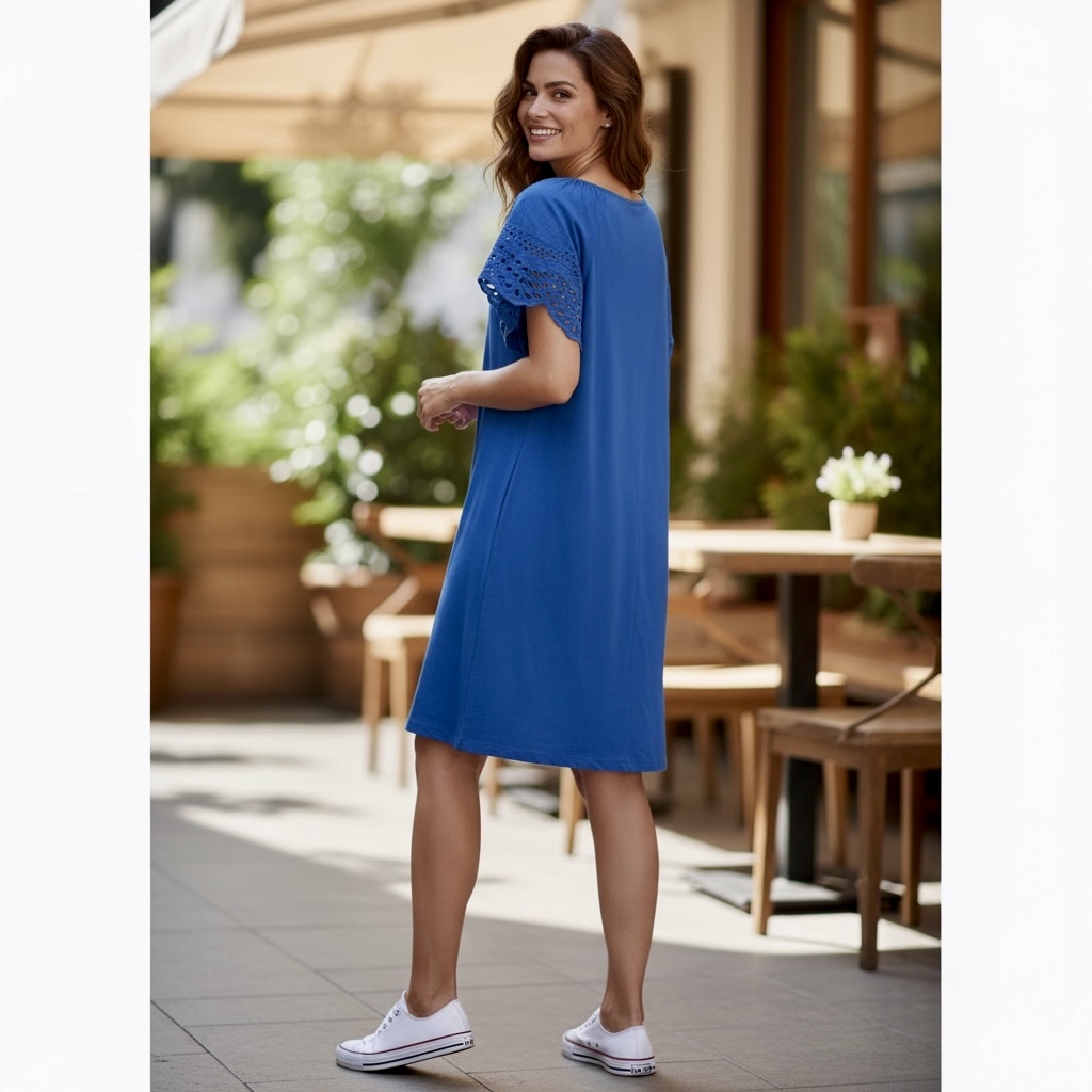 Lekka i przewiewna letnia sukienka z bawełny, stworzona z myślą o komforcie i kobiecym stylu w ciepłe dni. Luźny, delikatnie rozkloszowany fason, po bokach nieduże rozcięcia, które zapewnia większą swobodę ruchów. Model wyróżnia się krótkimi, motylkowymi rękawami z ażurowej bawełny, które dodają lekkości i subtelnej elegancji. Klasyczny, okrągły dekolt sprawia, że sukienka jest uniwersalna i ponadczasowa. Intensywny kobaltowy odcień doskonale podkreśla letnią opaleniznę i pasuje do wielu dodatków. Idealna na co dzień, wakacyjne wyjazdy, spacery, zakupy czy letnie spotkania. Świetnie wygląda zarówno z trampkami i sandałami.