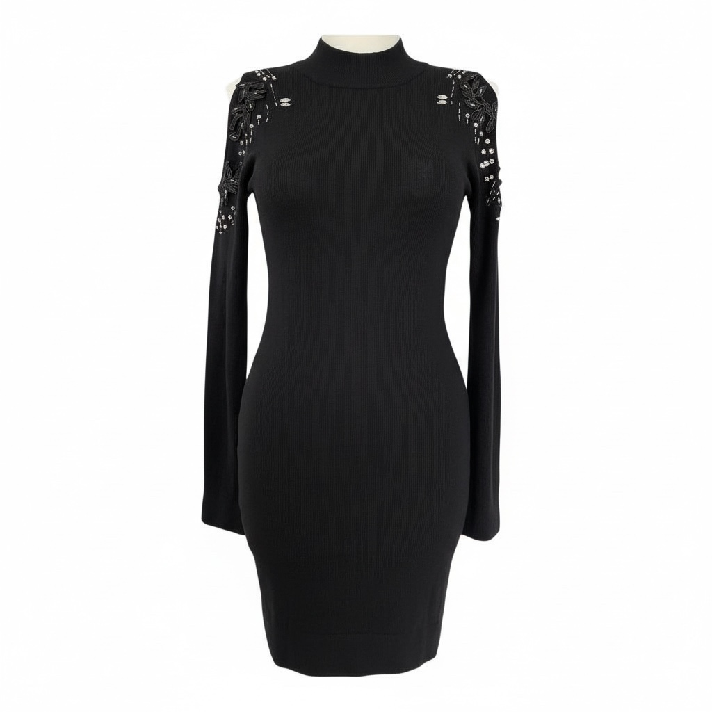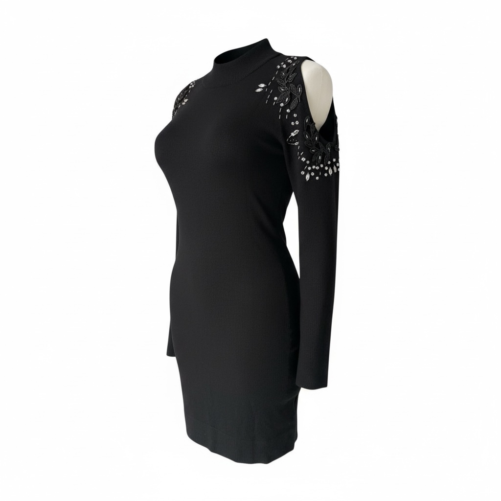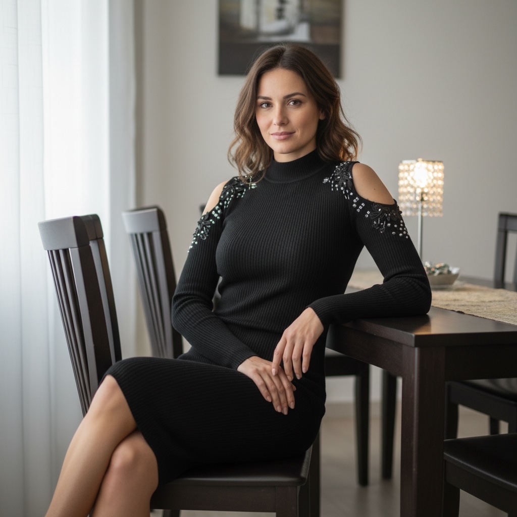 Czarna sukienka z wycięciami na ramionach i koralikową aplikacją o dopasowanym kroju zachwyca swoją prostotą, którą przełamują efektowne detale. Wykonana z miękkiej, dzianinowej tkaniny o strukturze przypominającej wełnę, pięknie układa się na sylwetce i zapewnia pełen komfort noszenia. Dopasowany krój i długość przed kolano. Rękawy długie z modnymi wycięciami „cold shoulder” z ozdobnymi aplikacjami koralików i haftów na ramionach. Dekolt zabudowany w formie eleganckiej stójki. Świetnie podkreśla figurę, a jednocześnie przyciąga wzrok unikatową dekoracją na ramionach. Idealnie sprawdzi się na kolację, wyjście do teatru, imprezę firmową czy elegancki event.