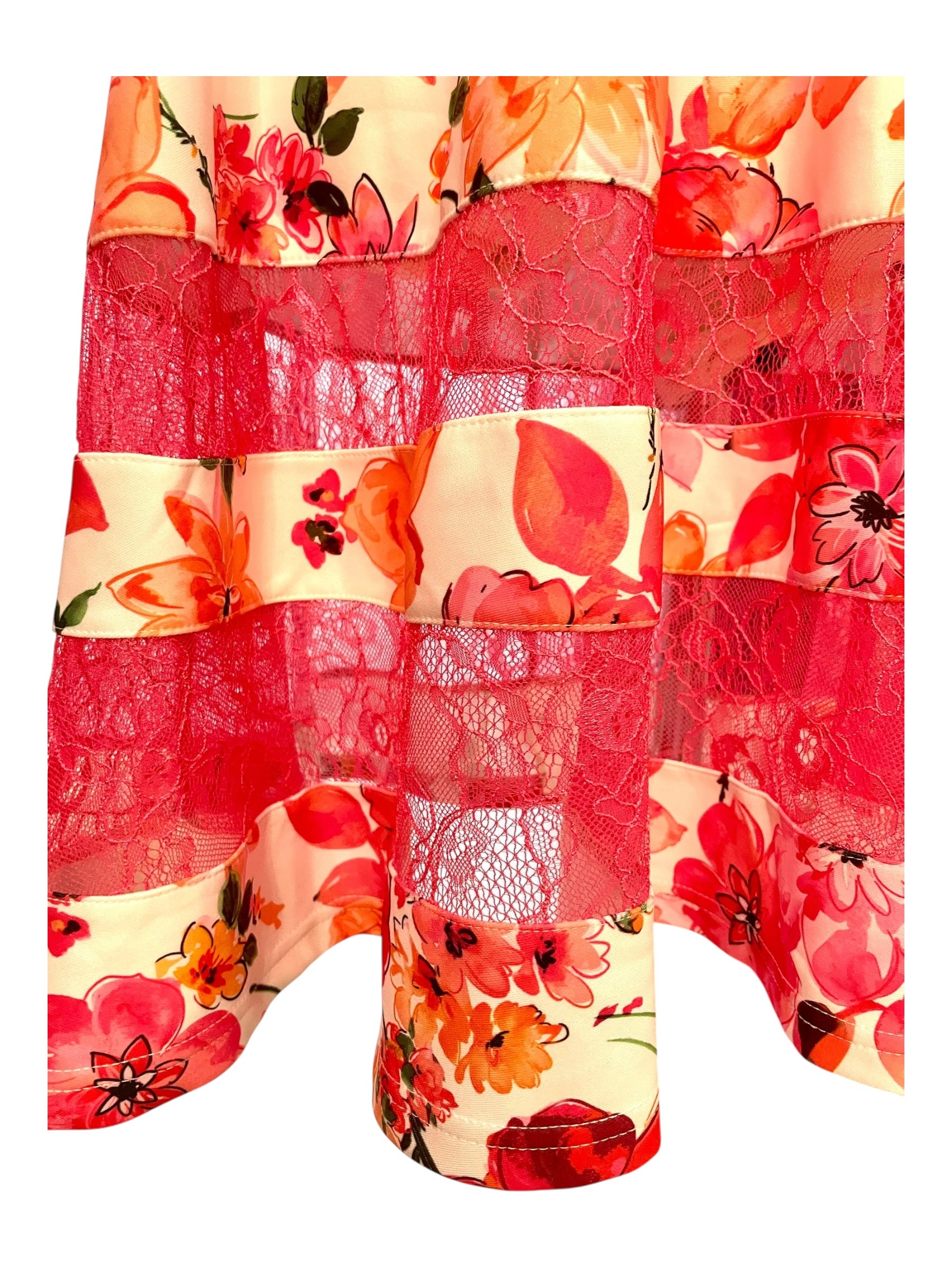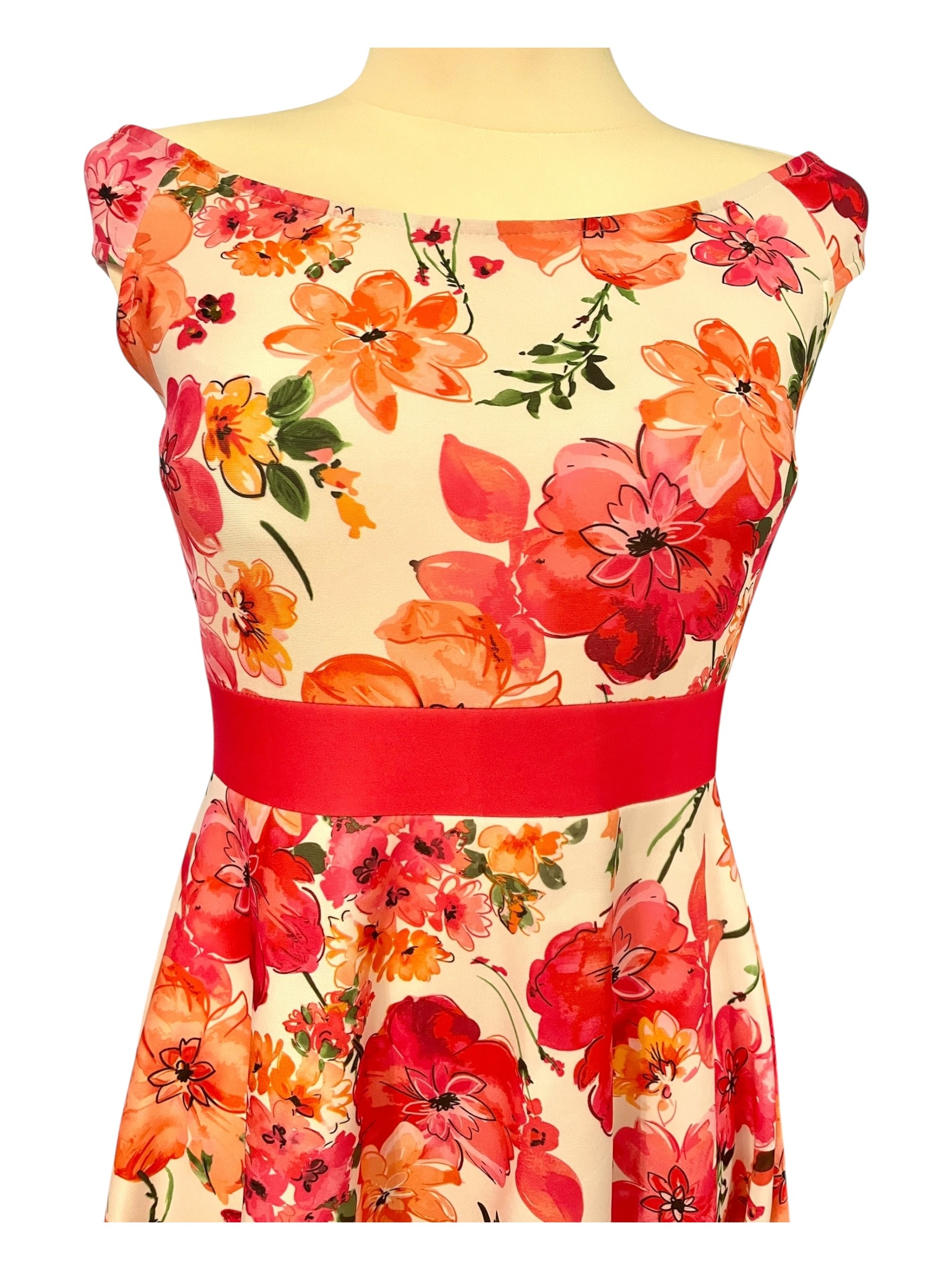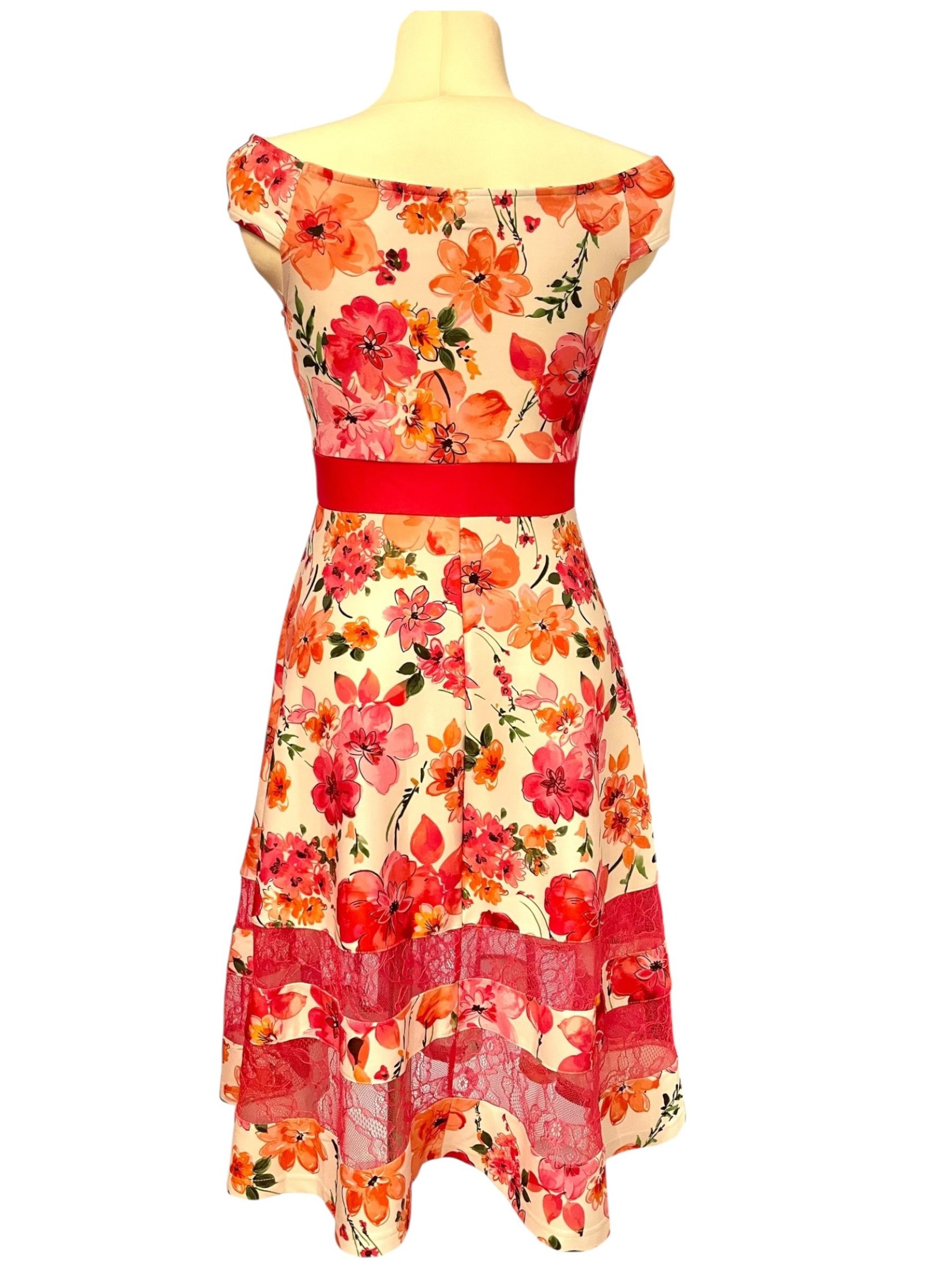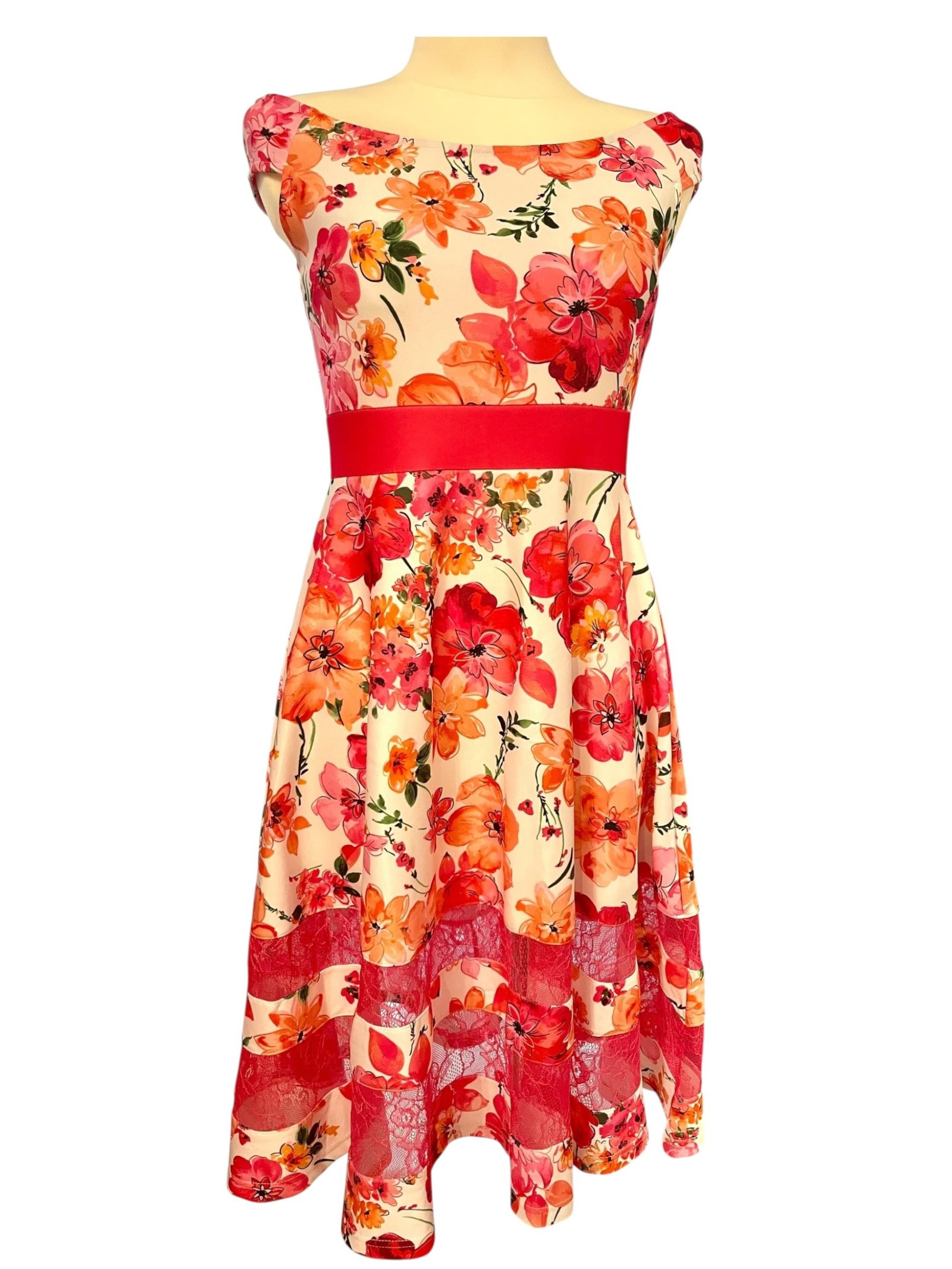 Ta przepiękna sukienka w romantycznym stylu, która przyciąga wzrok żywą kolorystyką i kwiatowym wzorem. Krój lekko rozkloszowany, długość za kolano, góra dopasowana z szerokim dekoltem typu łódka. Podkreślona talia dzięki szerokiemu czerwono - różowemu pasowi, u dołu podwójna prześwitująca koronka. Sukienka ma radosny wiosenno-letni charakter. Bardzo kobieca i romantyczna.