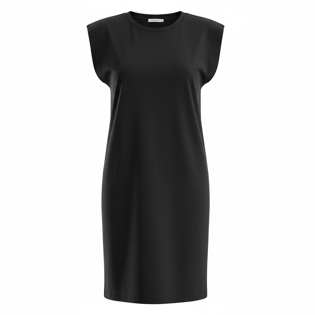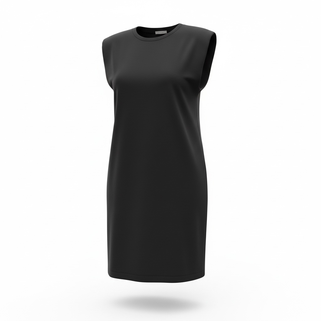 Czarna, klasyczna sukienka o prostym kroju, bez rękawów, z delikatnymi pół-poduszeczkami na ramionach, które subtelnie podkreślają sylwetkę i dodają elegancji. Wykonana z wysokiej jakości bawełny, miękka, przyjemna w dotyku i niezwykle wygodna w noszeniu. Długość do kolan sprawia, że sukienka jest uniwersalna i komfortowa nawet w ciepłe dni. Model daje możliwość stylizacji z ozdobnym paskiem, który podkreśli talię i nada całości indywidualnego charakteru. Idealna propozycja na lato – świetnie sprawdzi się zarówno na co dzień, jak i do pracy. Minimalistyczna forma pozwala łatwo dopasować ją do różnych dodatków i okazji.