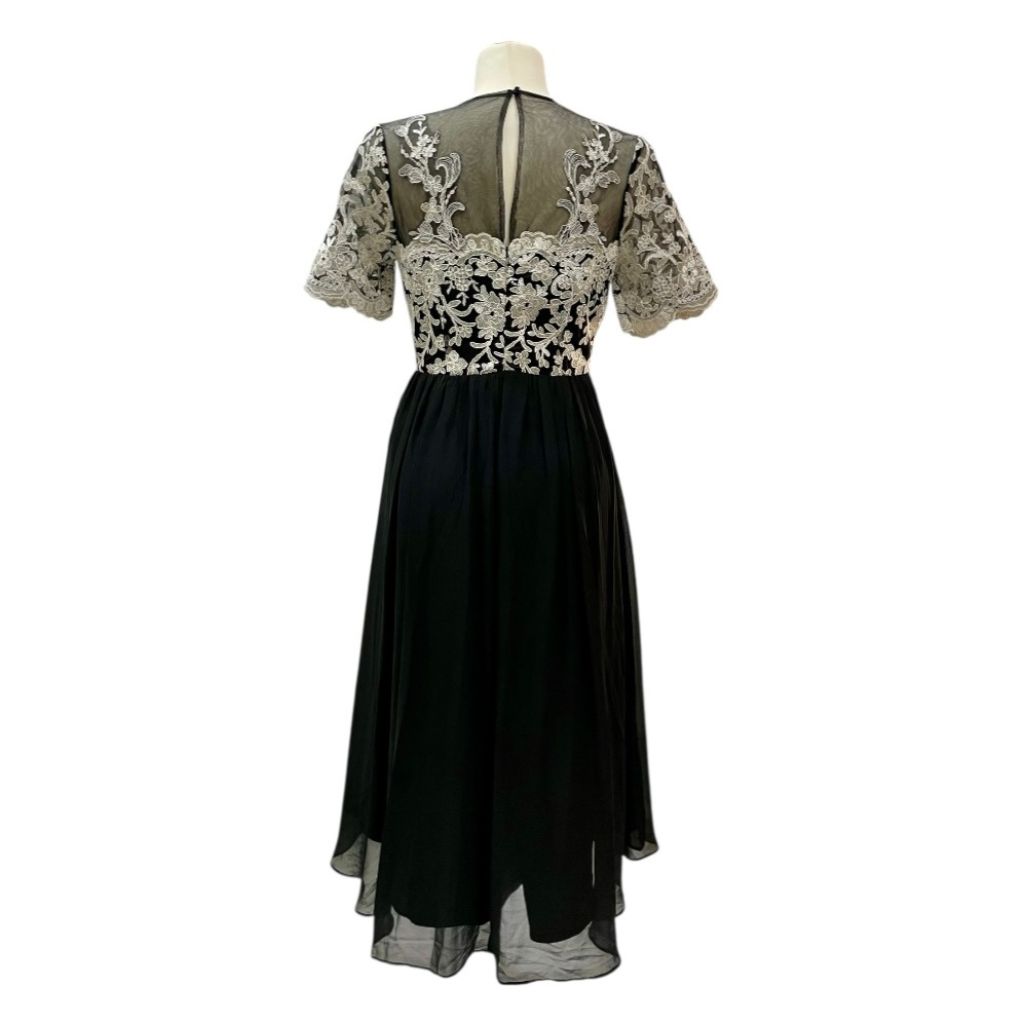 Sukienka ma elegancki, klasyczny krój z nowoczesnym akcentem. Góra wykonana jest z delikatnej koronki w kolorze białym z misternym, roślinnym wzorem. Koronkowa część ma półprzezroczysty dekolt oraz krótkie rękawki, co nadaje kreacji lekkości i subtelnej kobiecości. Od pasa w dół sukienka wykonana jest z lekkiej, zwiewnej tkaniny w kolorze czarnym. Spódnica ma asymetryczny krój – z przodu jest krótsza, a z tyłu dłuższa, co pięknie podkreśla sylwetkę i nadaje dynamiczny, szykowny wygląd podczas ruchu. Z tyłu sukienka jest zapinana na ukryty zamek i haftkę oraz mały guziczek przy szyi, który dopełnia eleganckie wykończenie górnej części. Całość wygląda bardzo szykownie, idealnie nadaje się na eleganckie przyjęcia, wesela czy wieczorne wyjścia.
