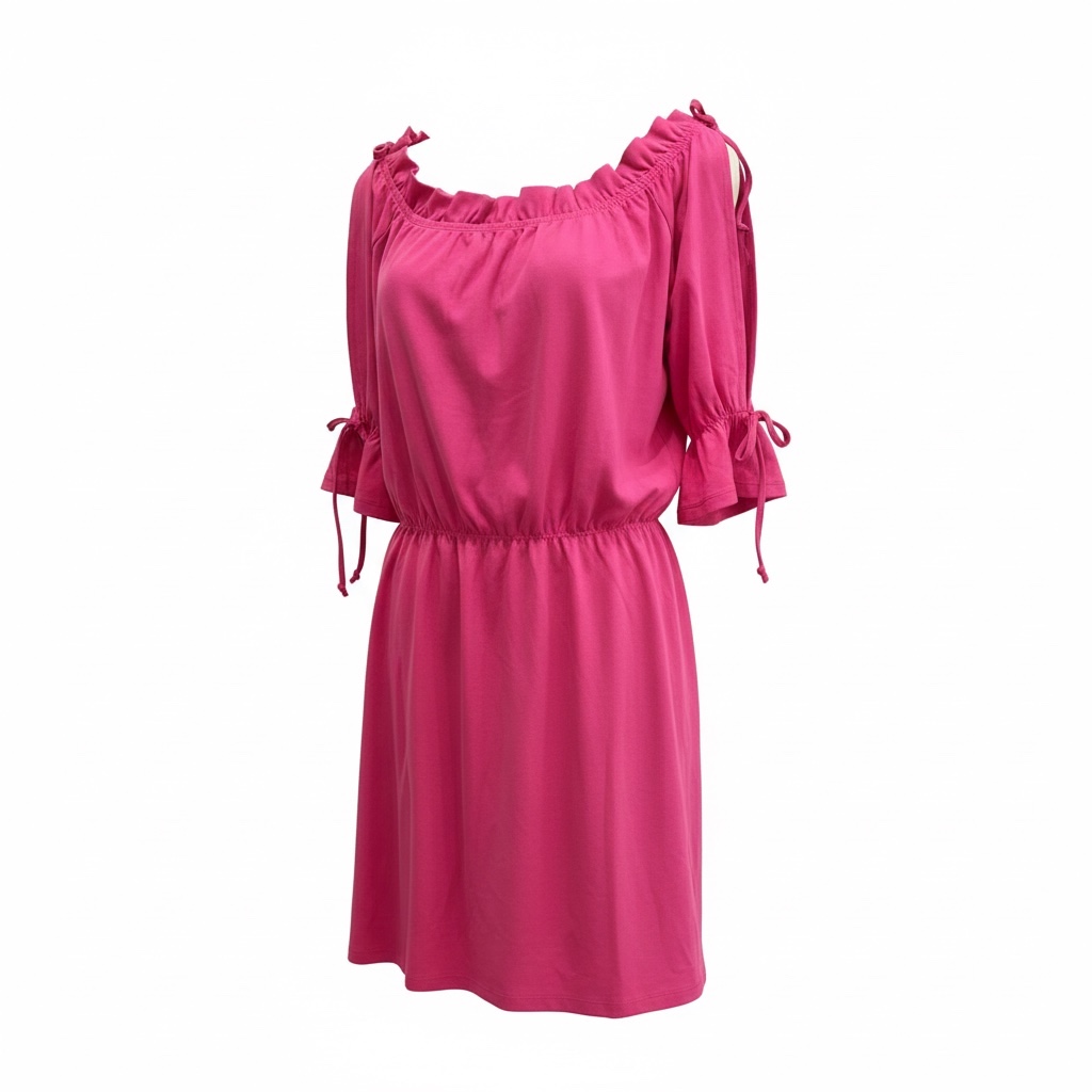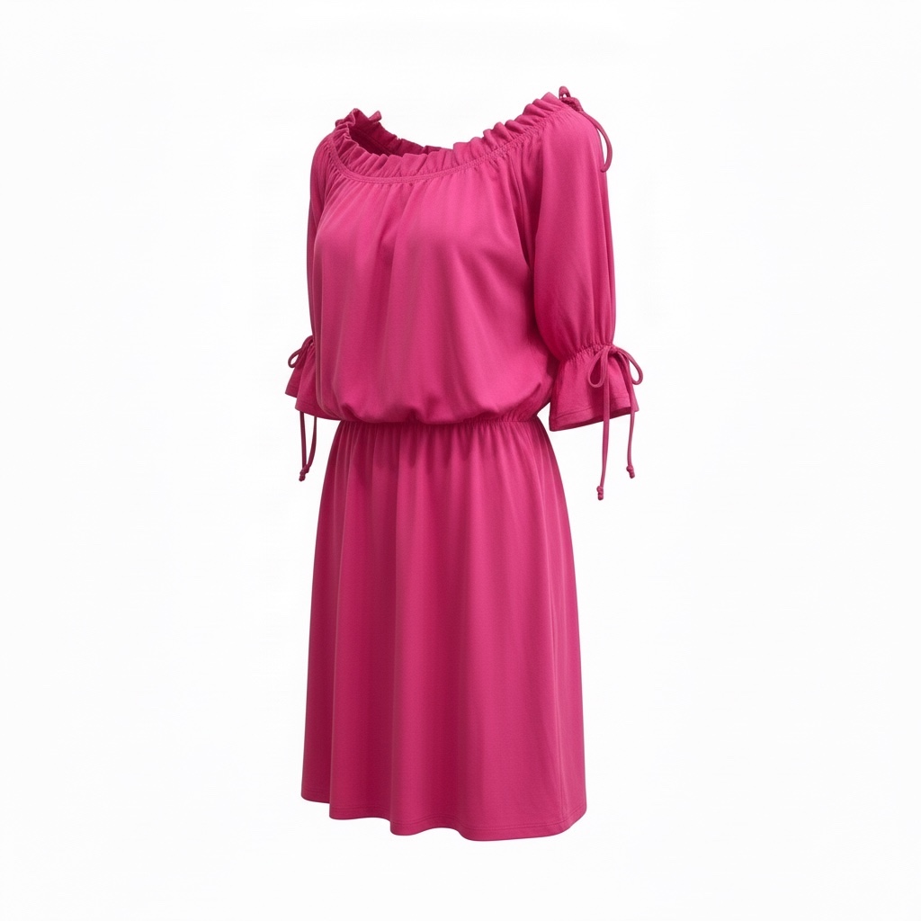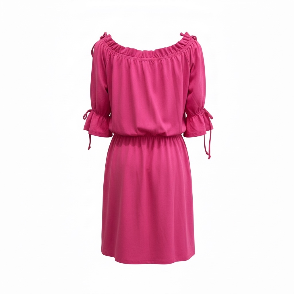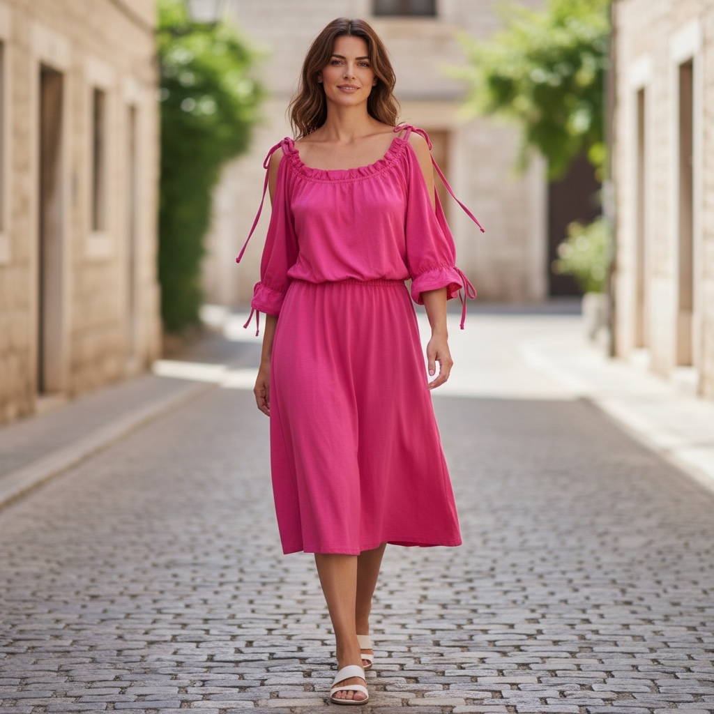 Lekka, kobieca sukienka w kolorze malinowym do kolan która zachwyca swoim kolorem i swobodnym, bardzo komfortowym krojem. To idealna propozycja na lato, wakacyjne wyjazdy i codzienne stylizacje. Sukienka posiada gumkę w pasie, marszczony dekolt, który umożliwia noszenie sukienki klasycznie na ramionach lub w wersji hiszpanki, opuszczonej na ramiona, co dodaje jej zmysłowego charakteru. Wyróżnia się ozdobnymi wiązaniami, sznureczki znajdują się na ramionach oraz na rękawach. Rękawy są otwarte i przewiewne, dzięki czemu sukienka doskonale sprawdza się nawet w bardzo ciepłe dni. Luźna, wygodna spódnica pięknie się układa. Wykonana z bawełny, przyjemna dla skóry i idealna na lato.