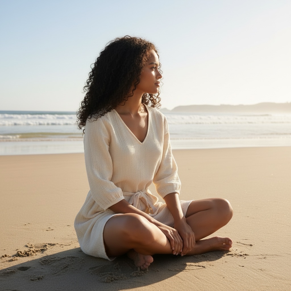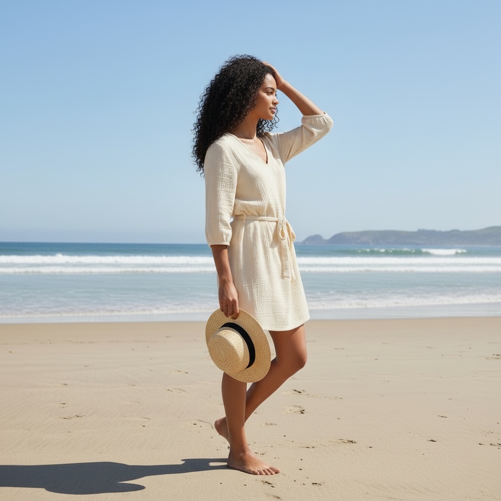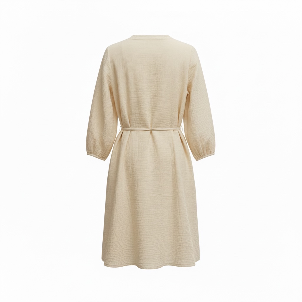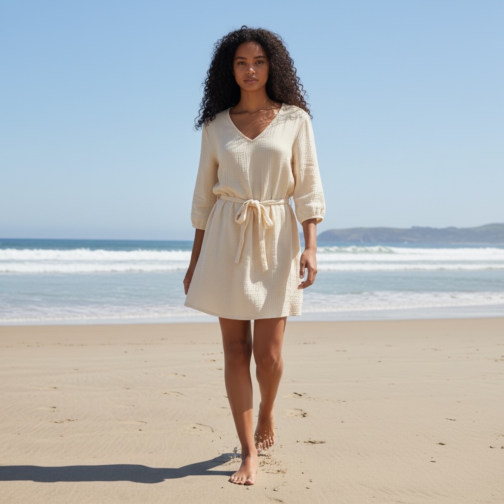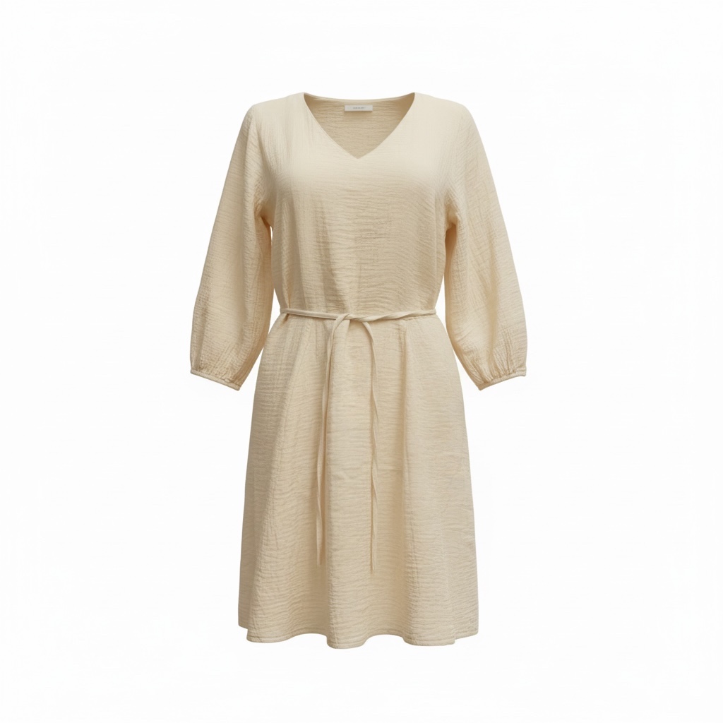 Prześliczna muślinowa sukienka w kolorze kremowym o długości do kolan. Przewiewna, oddychająca, delikatna tkanina 100% bawełna, lekko gnieciona. Sukienka rozkloszowana, w pasie sznurek zakończony frędzlami, rękaw 3/4 zakończony wszytą gumeczką. Sukienka bardzo kobieca i delikatna. Idealna na wiosnę oraz chłodniejsze dni lata. Świetnie sprawdzi się zarówno na co dzień, jak i na wyjścia w bardziej romantycznym stylu.