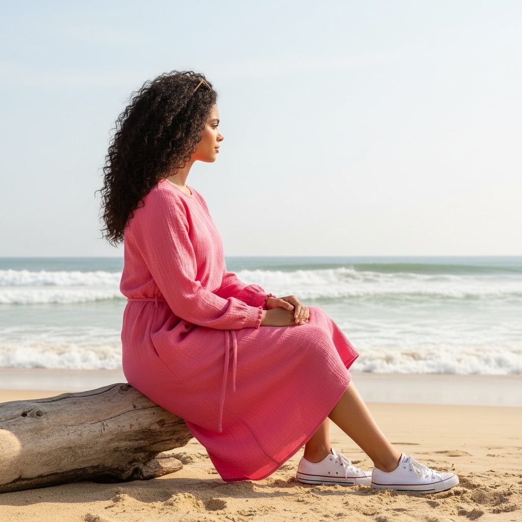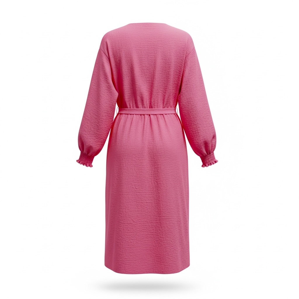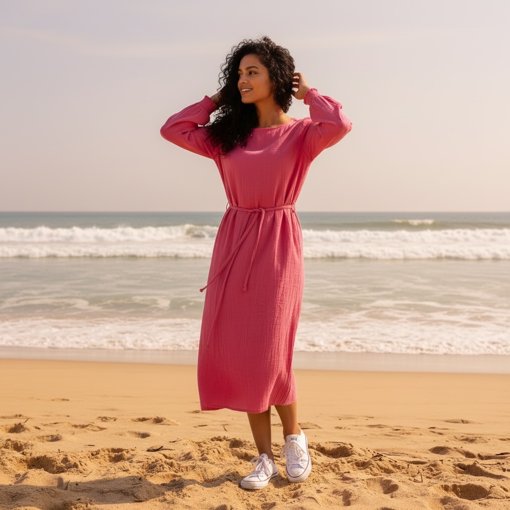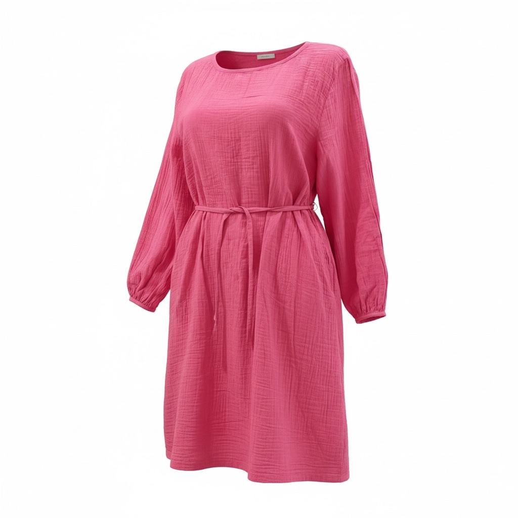 Prześliczna muślinowa sukienka w intensywnym różowym kolorze. Długość do połowy łydki, przewiewna, oddychająca, delikatna tkanina 100% bawełna, lekko gnieciona. Sukienka prosta, w pasie sznurek zakończony koralikami, dwie głębokie kieszenie, długi rękaw zakończony szerokim ściągaczem, bardzo kobieca i delikatna. Idealna na wiosnę oraz chłodniejsze dni lata. Świetnie sprawdzi się zarówno na co dzień, jak i na wyjścia w bardziej romantycznym stylu.