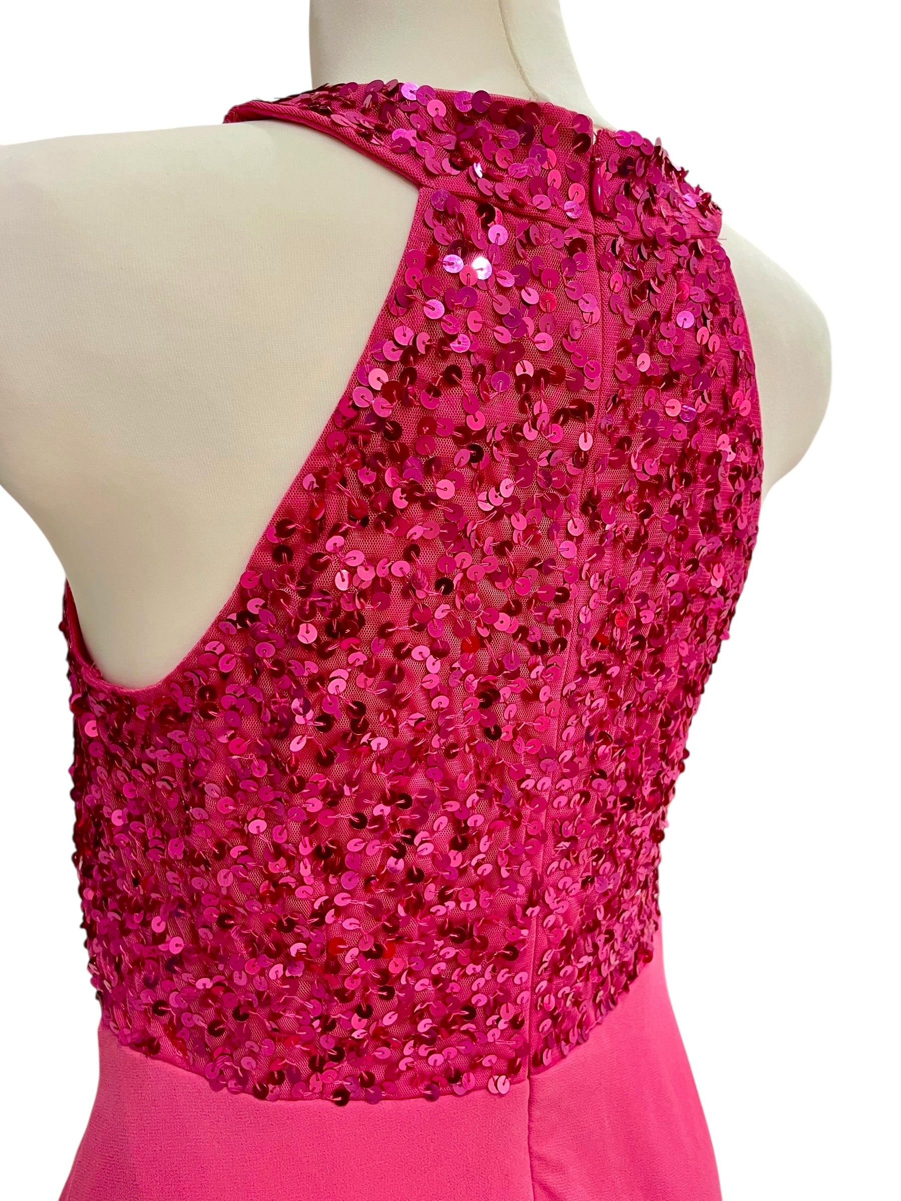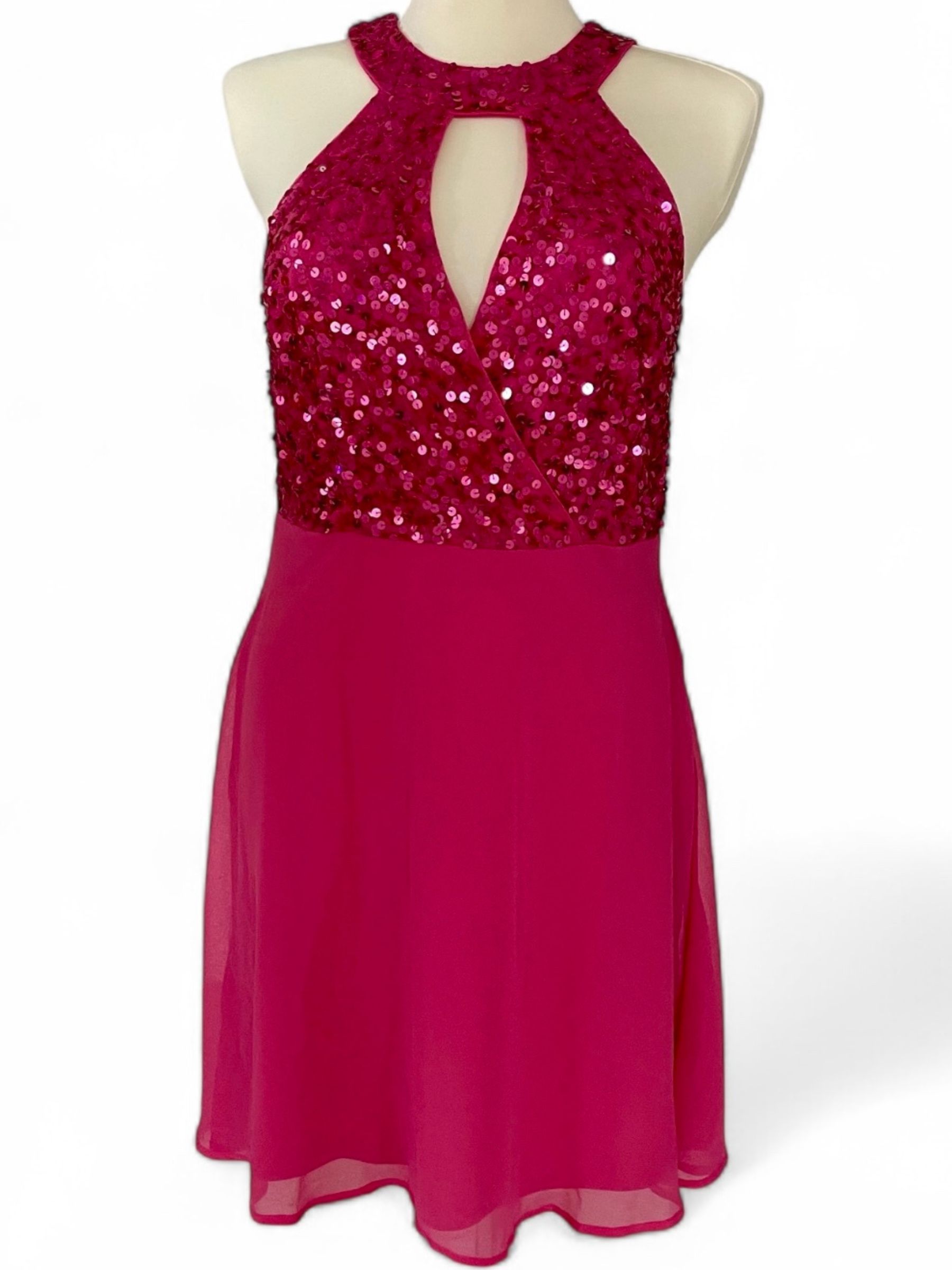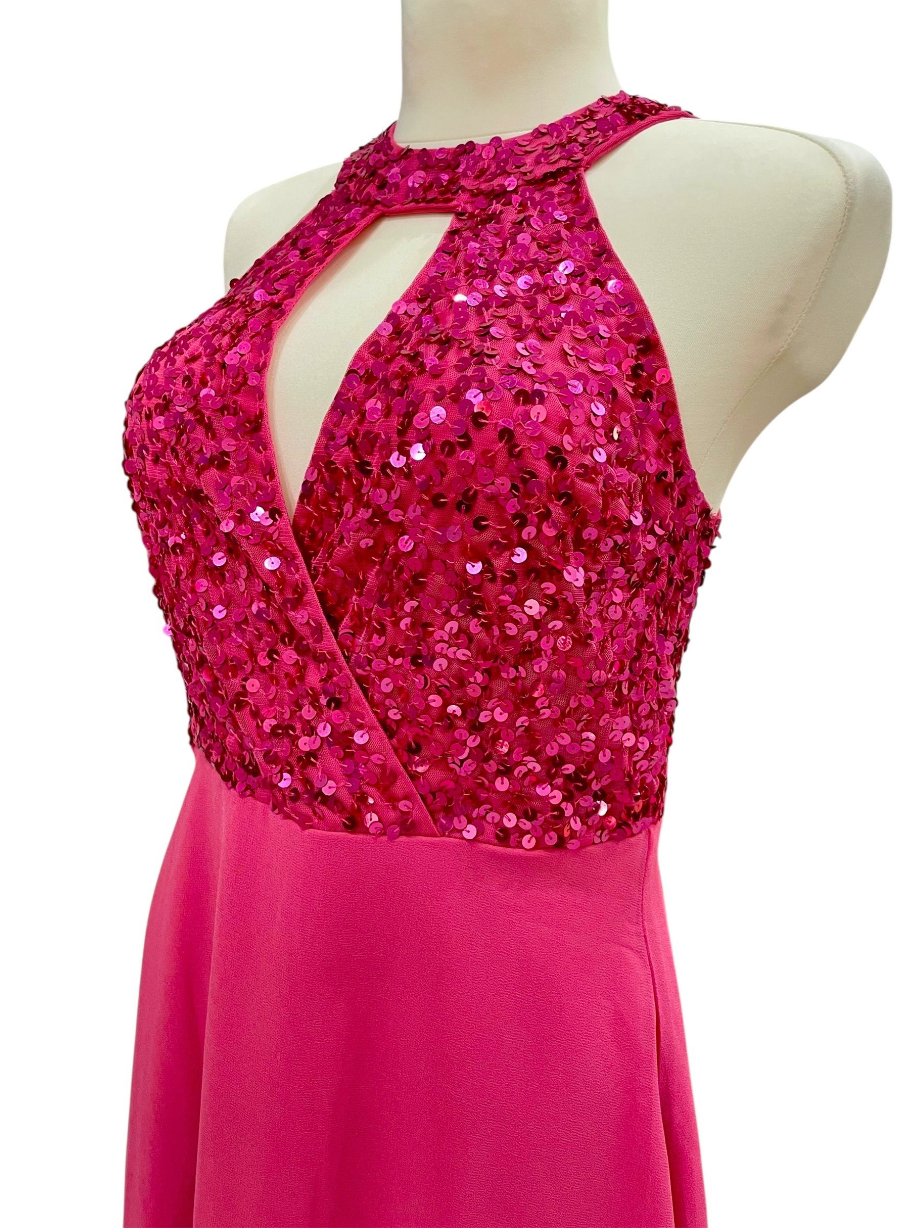 Olśniewająca sukienka koktajlowa w intensywnym odcieniu różu🧡 Góra wykonana jest z mieniących się cekinów, które pięknie łapią światło i dodają kreacji blasku. Dekolt w stylu halter z subtelnym wycięciem podkreśla szyję i ramiona, nadając elegancki, a zarazem zmysłowy charakter. Dół sukienki uszyty z lekkiego, zwiewnego materiału, delikatnie opływa sylwetkę, tworząc dziewczęcą i romantyczną całość. Z tyłu zameczek, który ułatwia zakładanie sukienki. To idealna propozycja na wieczorne wyjścia, przyjęcia czy letnie imprezy — przyciąga spojrzenia i sprawia, że każda kobieta czuje się wyjątkowo.