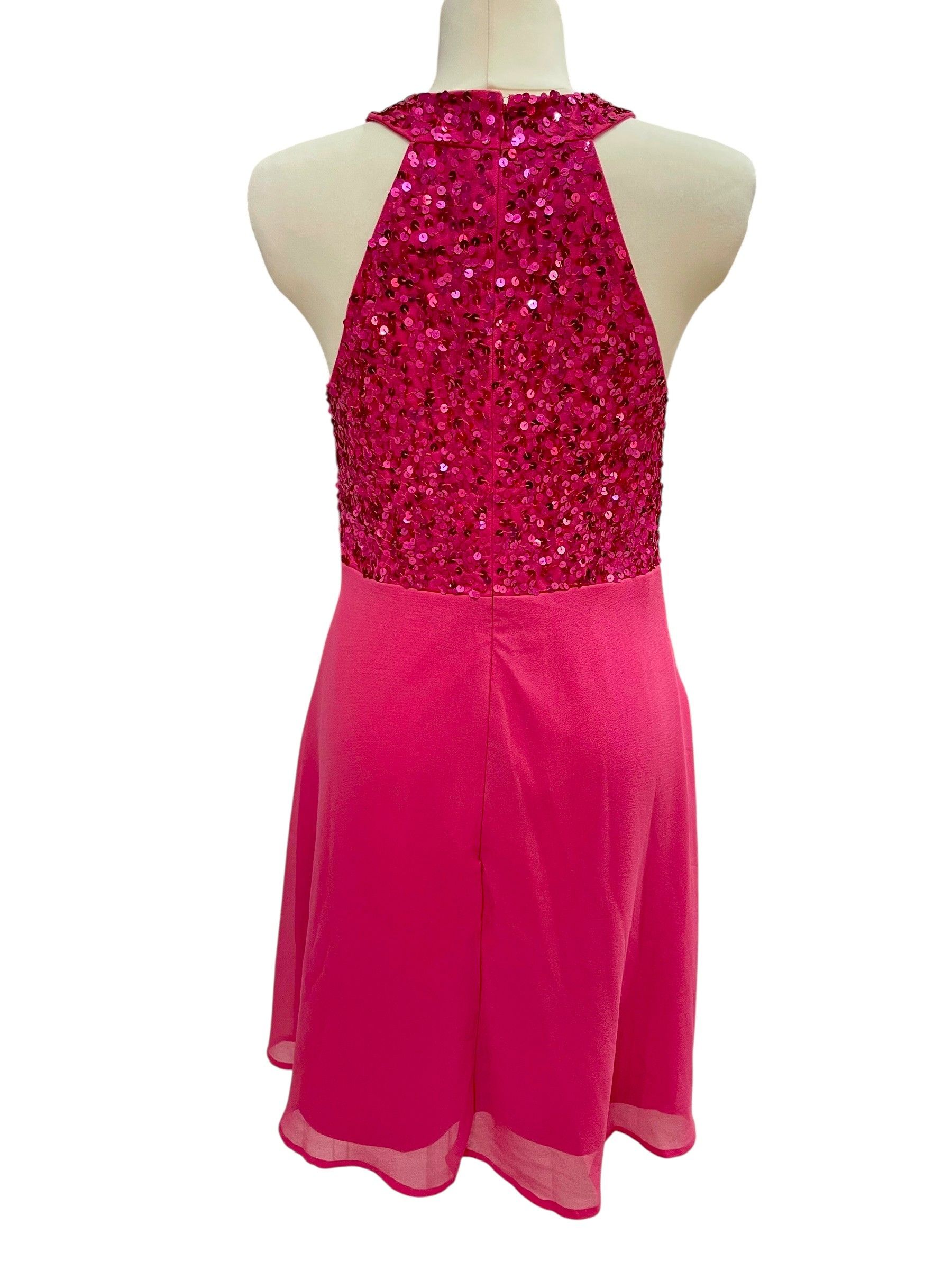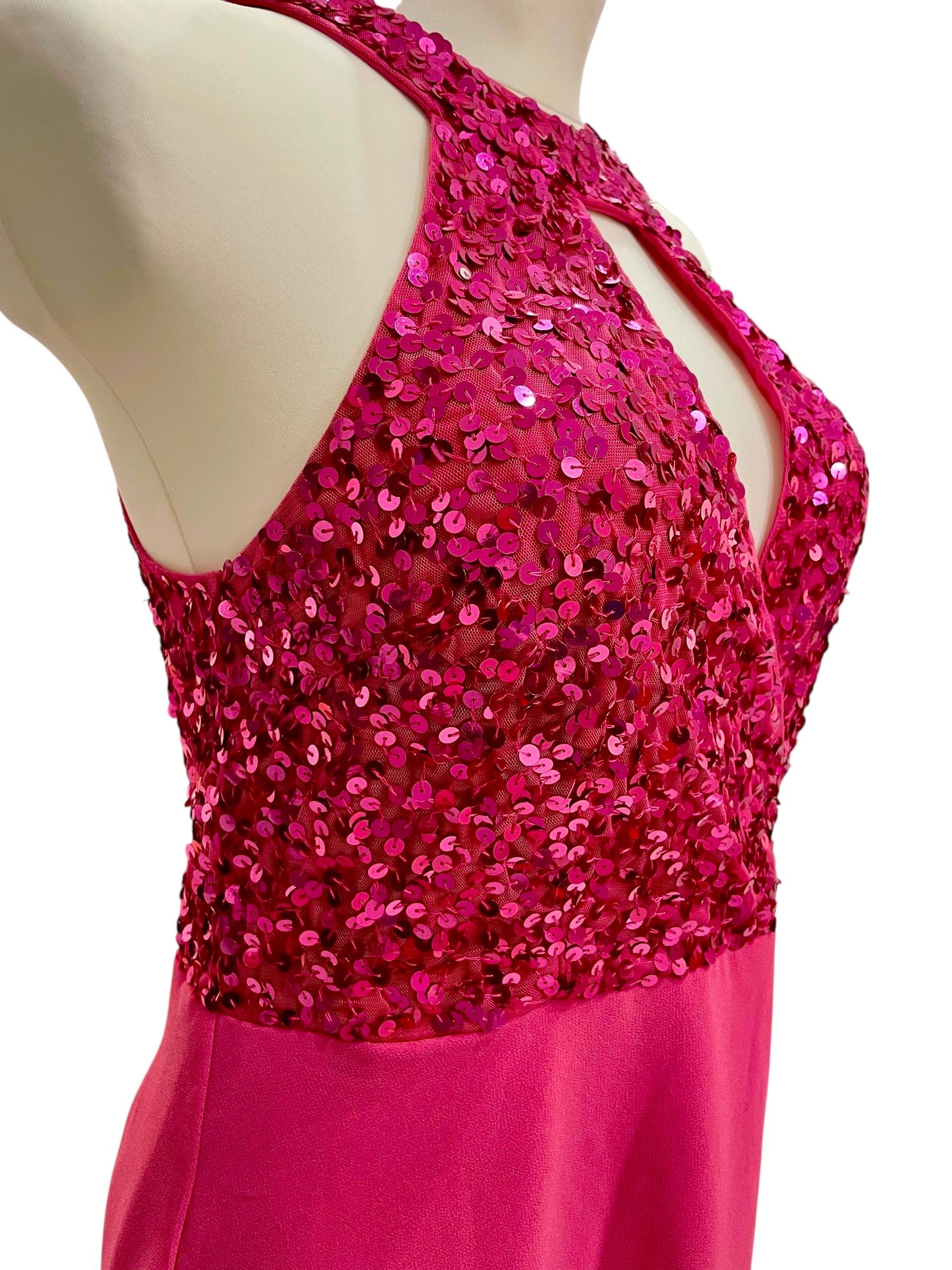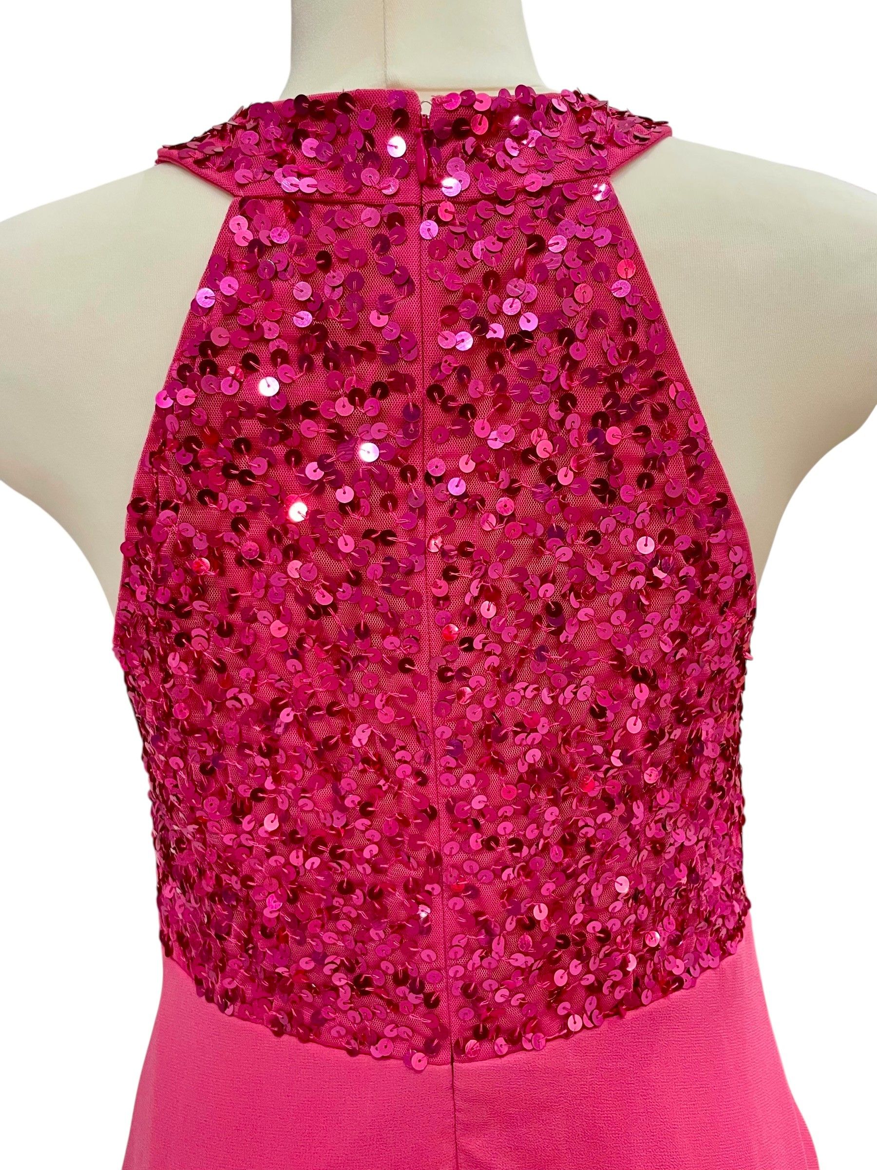 Olśniewająca sukienka koktajlowa w intensywnym odcieniu różu🧡 Góra wykonana jest z mieniących się cekinów, które pięknie łapią światło i dodają kreacji blasku. Dekolt w stylu halter z subtelnym wycięciem podkreśla szyję i ramiona, nadając elegancki, a zarazem zmysłowy charakter. Dół sukienki uszyty z lekkiego, zwiewnego materiału, delikatnie opływa sylwetkę, tworząc dziewczęcą i romantyczną całość. Z tyłu zameczek, który ułatwia zakładanie sukienki. To idealna propozycja na wieczorne wyjścia, przyjęcia czy letnie imprezy — przyciąga spojrzenia i sprawia, że każda kobieta czuje się wyjątkowo.