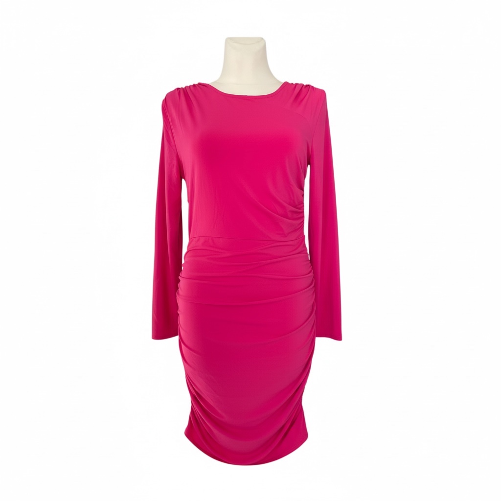 Sukienka ma dopasowany krój do kolan, który pięknie podkreśla sylwetkę, a marszczenia po bokach modelują figurę i dodają jej lekkości, jednocześnie maskując drobne niedoskonałości. Długi rękaw sprawia, że jest bardzo uniwersalna – sprawdzi się zarówno na co dzień, jak i na bardziej eleganckie wyjścia. Wykonana z elastycznego poliestru, doskonale dopasowuje się do ciała, nie krępuje ruchów i jest komfortowa w noszeniu przez cały dzień. Po boku znajduje się zameczek, który umożliwia bezproblemowe założenie sukienki. Materiał jest gładki, przyjemny w dotyku i łatwy w pielęgnacji, co czyni sukienkę praktycznym wyborem na wiele okazji.