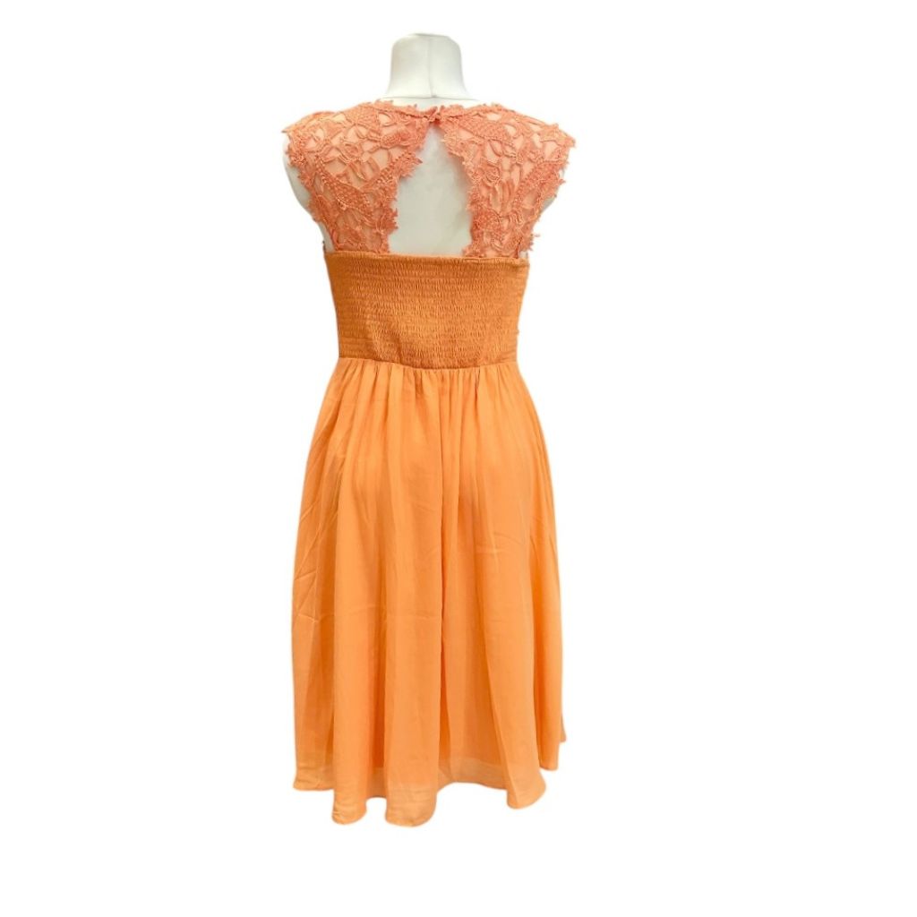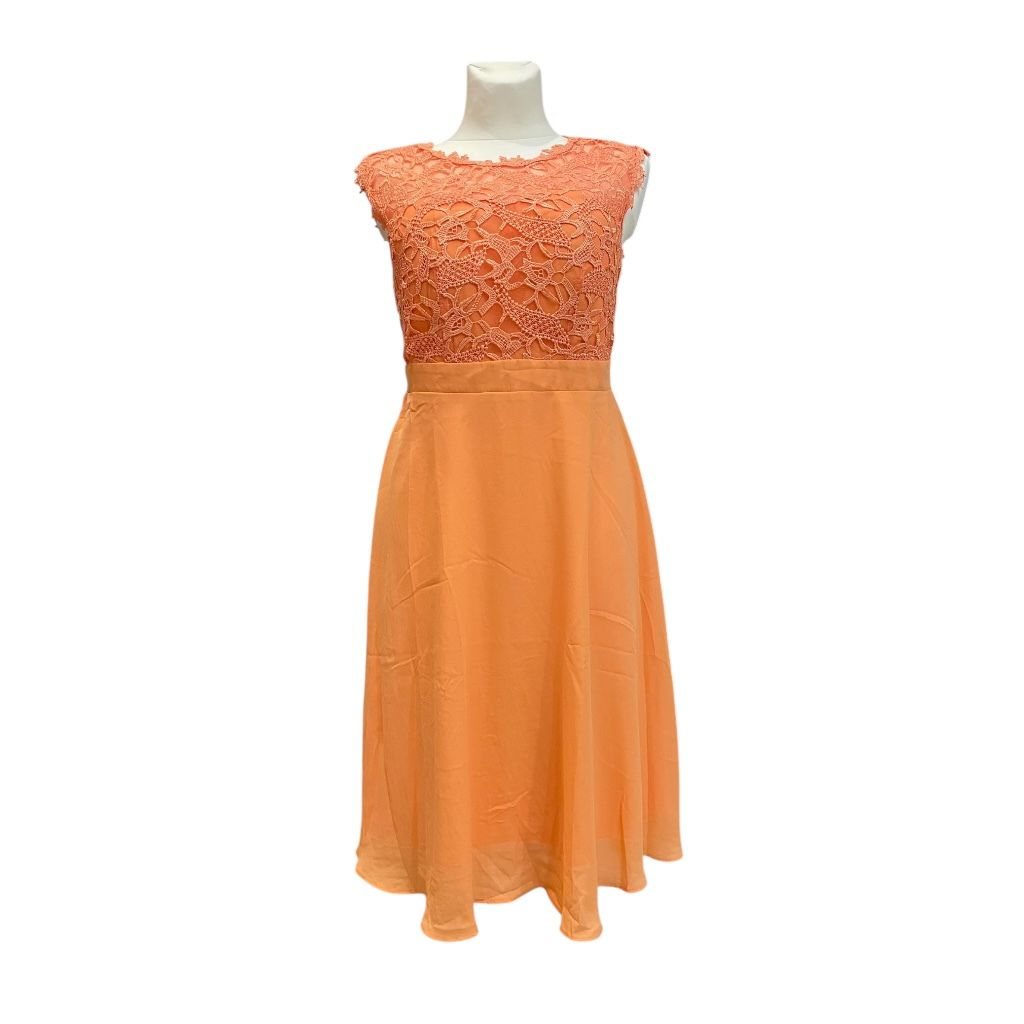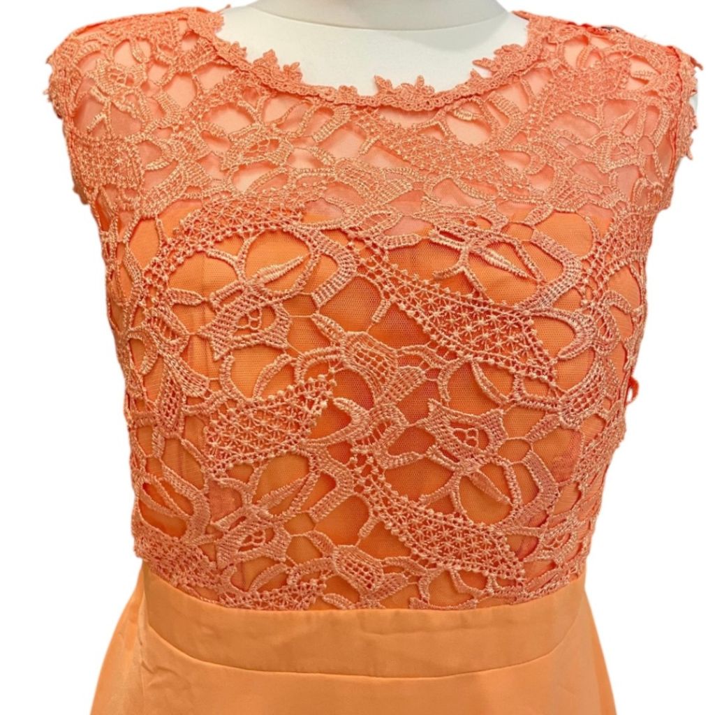 Elegancka sukienka sięgająca do kolan w pięknym, intensywnym pomarańczowym kolorze. Model zachwyca efektowną, koronkową górą – gorset od spodu jest podszyty podszewką i posiada wyprofilowane miseczki, dzięki czemu świetnie trzyma formę i pięknie podkreśla sylwetkę. Z tyłu na plecach znajduje się szeroka gumka, która zapewnia idealne dopasowanie do sylwetki oraz wysoki komfort noszenia. Dół sukienki to podwójna, lekko rozkloszowana spódnica, która subtelnie pracuje przy każdym ruchu, dodając całości lekkości i kobiecego uroku. Sukienka jest bardzo wygodna, idealna na wesela, przyjęcia, komunię czy eleganckie wyjścia. Prezentuje się wyjątkowo efektownie i przyciąga wzrok swoim kolorem oraz starannym wykończeniem.