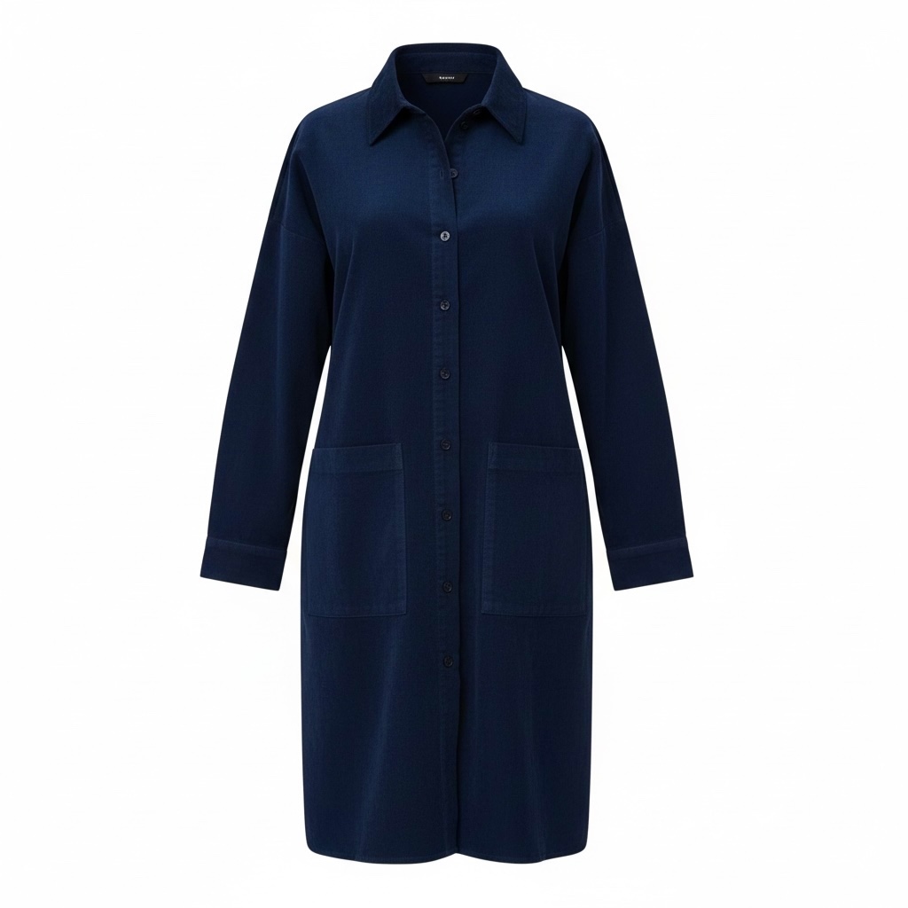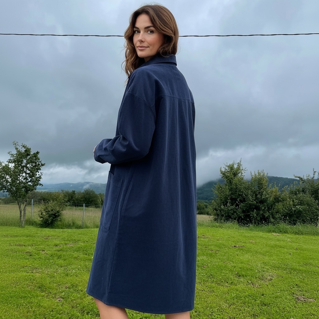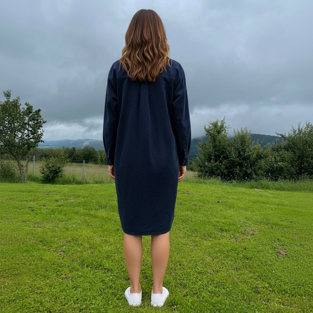 Granatowa sukienka sztruksowa o długości za kolano to stylowa i praktyczna propozycja na chłodniejsze dni. Wykonana z grubszego, bawełnianego materiału, zapewnia komfort noszenia i przyjemne ciepło. Model zapinany jest na całej długości na guziki, co daje dużą swobodę stylizacji – możesz nosić ją klasycznie jako sukienkę lub rozpiętą, w formie lekkiego płaszczyka do spodni czy legginsów. Sukienka posiada dwie duże, naszywane kieszenie z przodu, które dodają jej casualowego charakteru i są bardzo funkcjonalne. Całość uzupełnia klasyczny kołnierzyk oraz rękawy zakończone mankietem zapinanym na guziczek, co nadaje jej eleganckiego wykończenia. To uniwersalny model, który świetnie sprawdzi się zarówno na co dzień, jak i w bardziej stylowych zestawieniach.