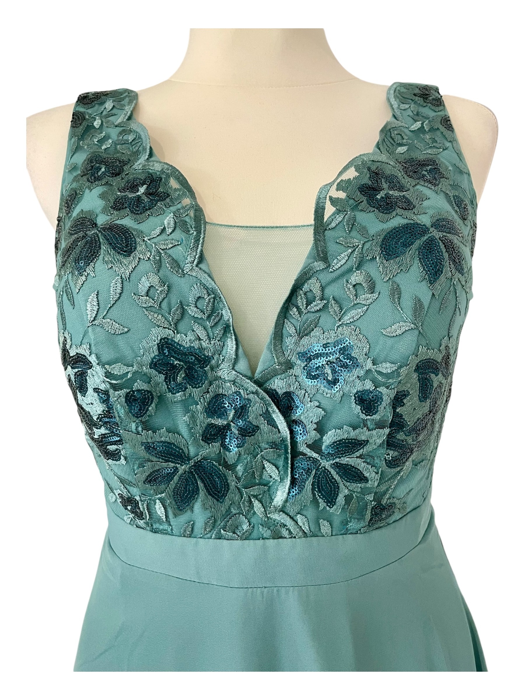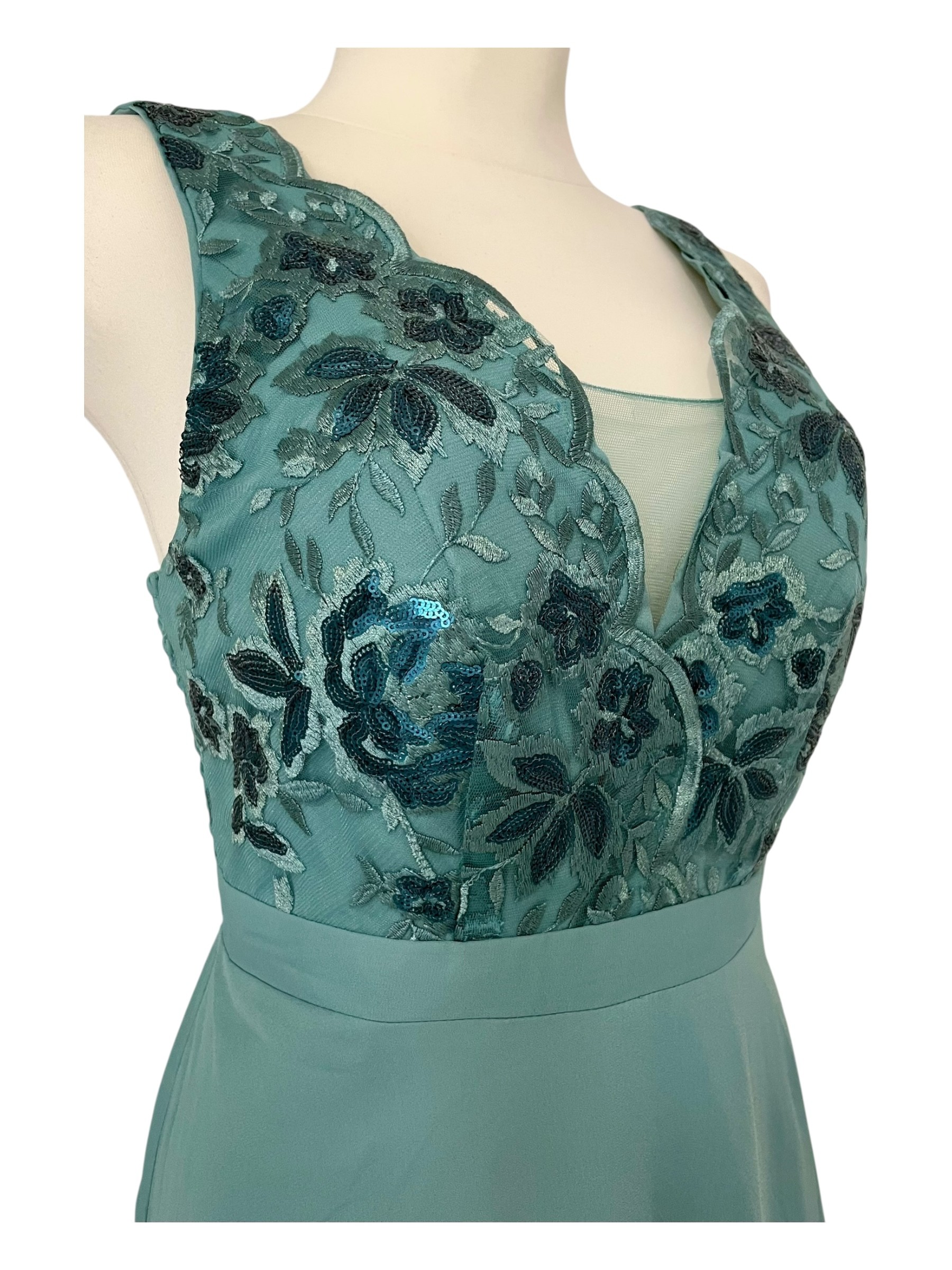 Ta długa turkusowa sukienka to elegancka kreacja na wyjątkowe okazje typu bal, wesele czy uroczyste przyjęcie. Delikatna koronka w górnej części z wyhaftowanym wzorem liści ozdobionych cekinami dodaje jej niepowtarzalnego uroku. Na plecach materiał przeszyty wraz z gumką co sprawia, że sukienka idealnie dopasowuje się do kształtu figury i odpowiedniego rozmiaru. Cała sukienka od wewnętrznej strony podszyta jest podszewką, a biust podtrzymują wszyte miękkie miseczki. Sukienka pięknie się prezentuje, idealna dla osób w każdym wieku, ceniących kobiecy styl z nutką romantyzmu. Dostępna również w innych kolorach.