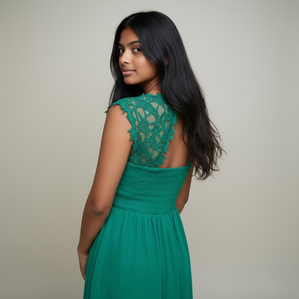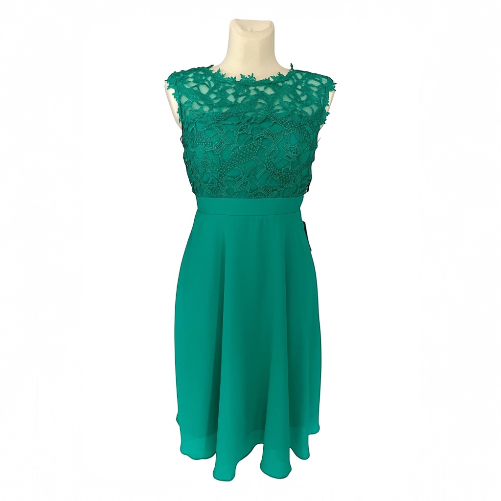 Elegancka sukienka sięgająca do kolan w pięknym, intensywnym zielonym kolorze. Model zachwyca efektowną, koronkową górą – gorset od spodu jest podszyty podszewką i posiada wyprofilowane miseczki, dzięki czemu świetnie trzyma formę i pięknie podkreśla sylwetkę. Z tyłu na plecach znajduje się szeroka gumka, która zapewnia idealne dopasowanie do sylwetki oraz wysoki komfort noszenia. Dół sukienki to podwójna, lekko rozkloszowana spódnica, która subtelnie pracuje przy każdym ruchu, dodając całości lekkości i kobiecego uroku. Sukienka jest bardzo wygodna, idealna na wesela, przyjęcia, komunię czy eleganckie wyjścia. Prezentuje się wyjątkowo efektownie i przyciąga wzrok swoim kolorem oraz starannym wykończeniem.