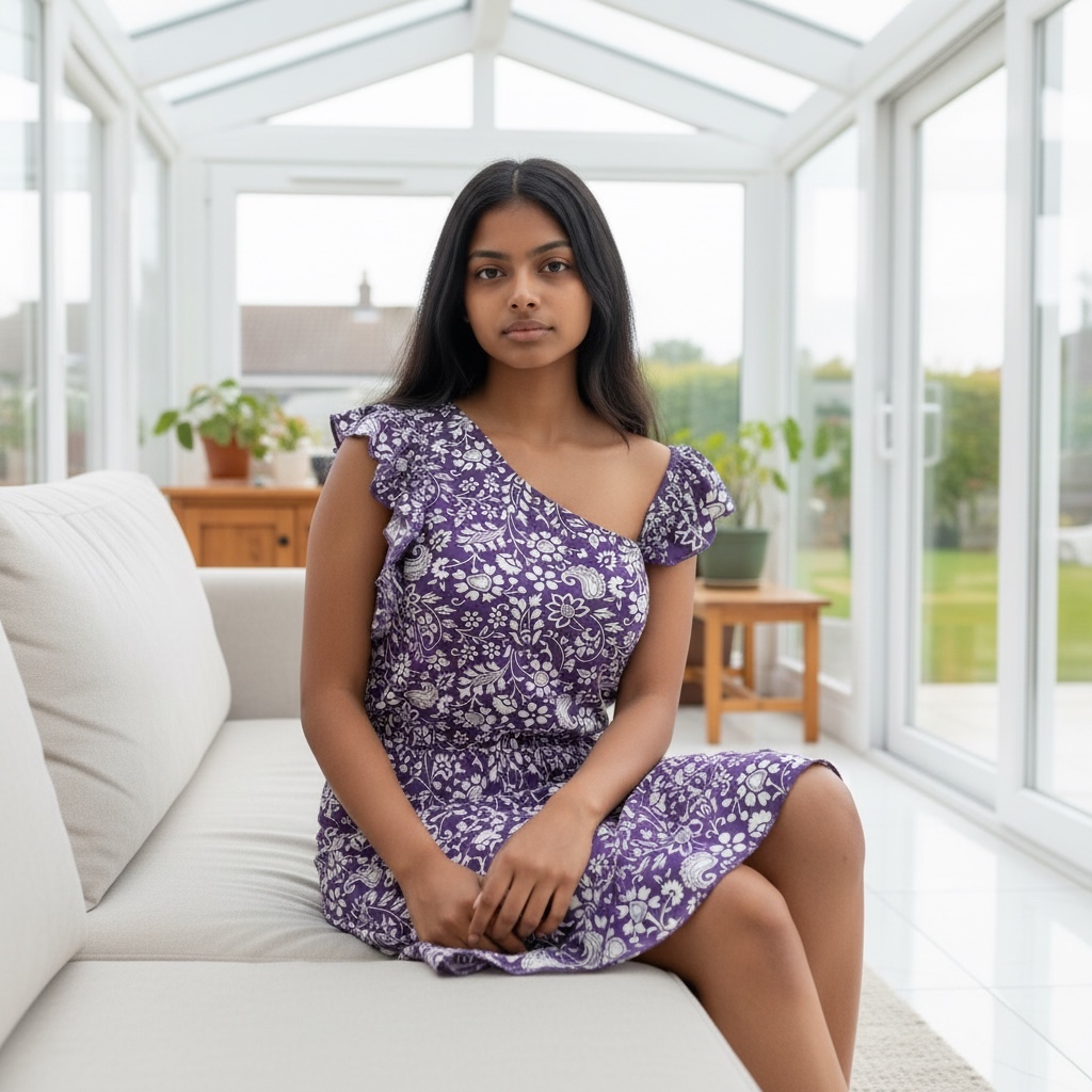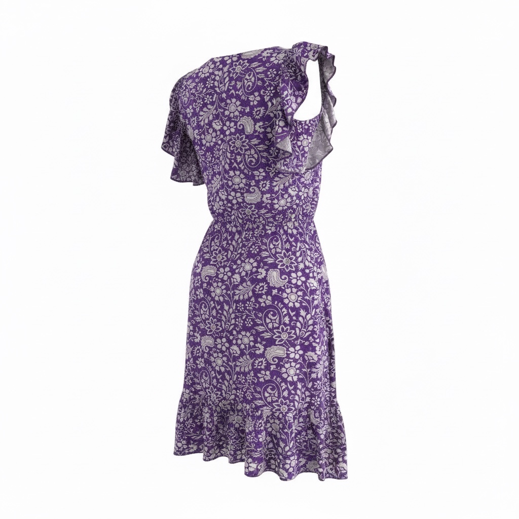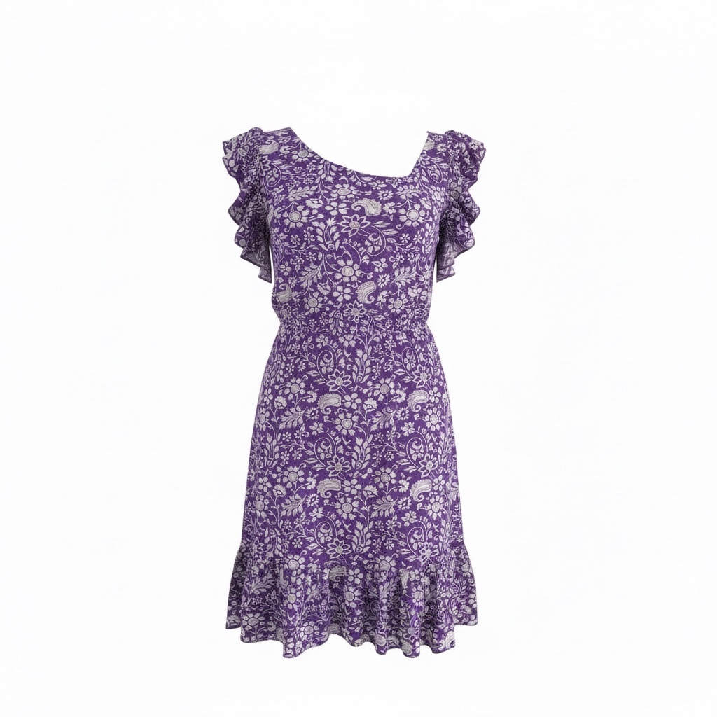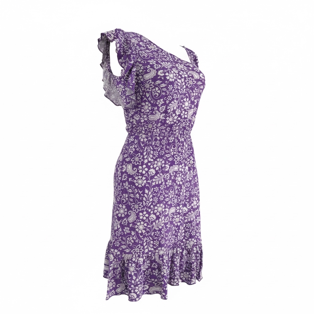Bardzo kobieca sukienka idealna na ciepłe, letnie dni. Wykonana z przyjemnej w dotyku, oddychającej wiskozy, zapewnia komfort noszenia. Sukienka o długości do kolan z elastyczną gumką w pasie pięknie podkreśla sylwetkę i dopasowuje się do figury. Niewielka falbanka przy rękawie oraz na dole spódnicy dodają sukience romantycznego, dziewczęcego charakteru. Kolor fioletowo – biały o delikatnym kwiatowym wzorze.