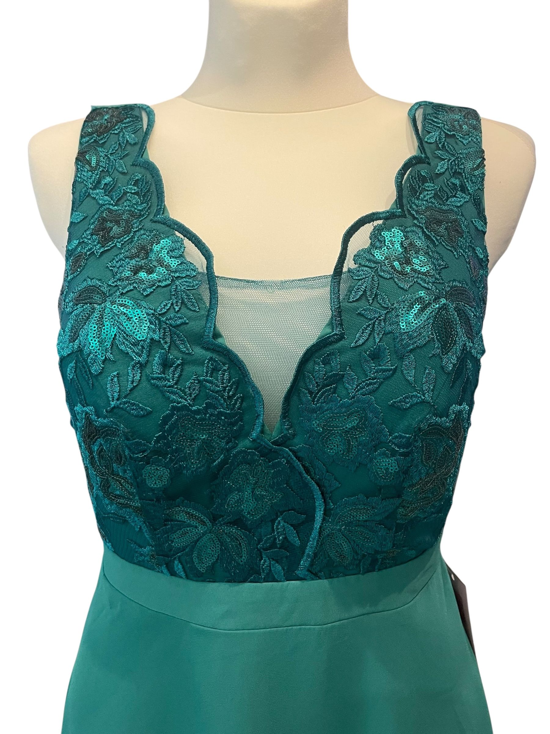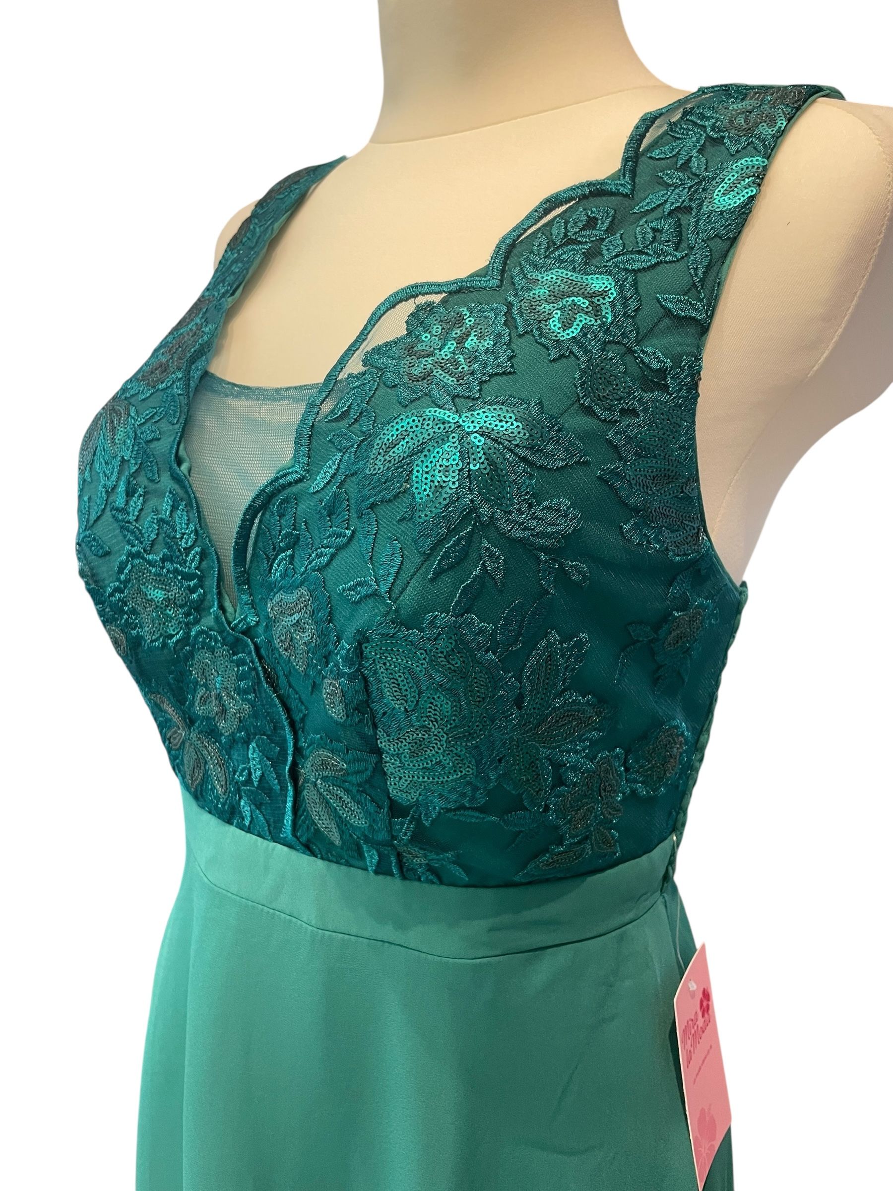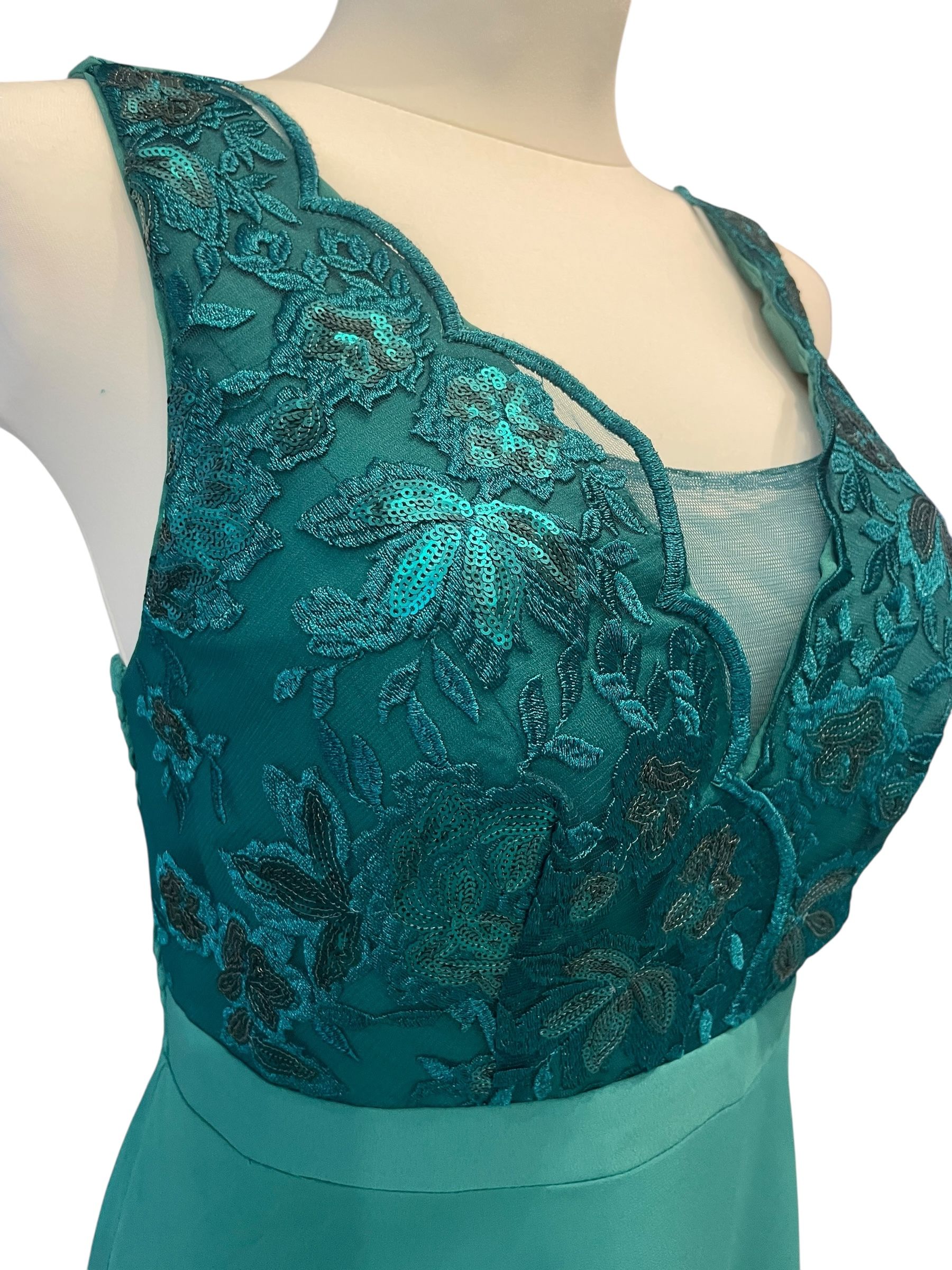 Ta długa zielona sukienka to elegancka kreacja na wyjątkowe okazje typu bal, wesele czy uroczyste przyjęcie. Delikatna koronka w górnej części z wyhaftowanym wzorem liści ozdobionych cekinami dodaje jej niepowtarzalnego uroku. Na plecach materiał przeszyty wraz z gumką co sprawia, że sukienka idealnie dopasowuje się do kształtu figury i odpowiedniego rozmiaru. Cała sukienka od wewnętrznej strony podszyta jest podszewką, a biust podtrzymują wszyte miękkie miseczki. Sukienka pięknie się prezentuje, idealna dla osób w każdym wieku, ceniących kobiecy styl z nutką romantyzmu. Dostępna również w innych kolorach.