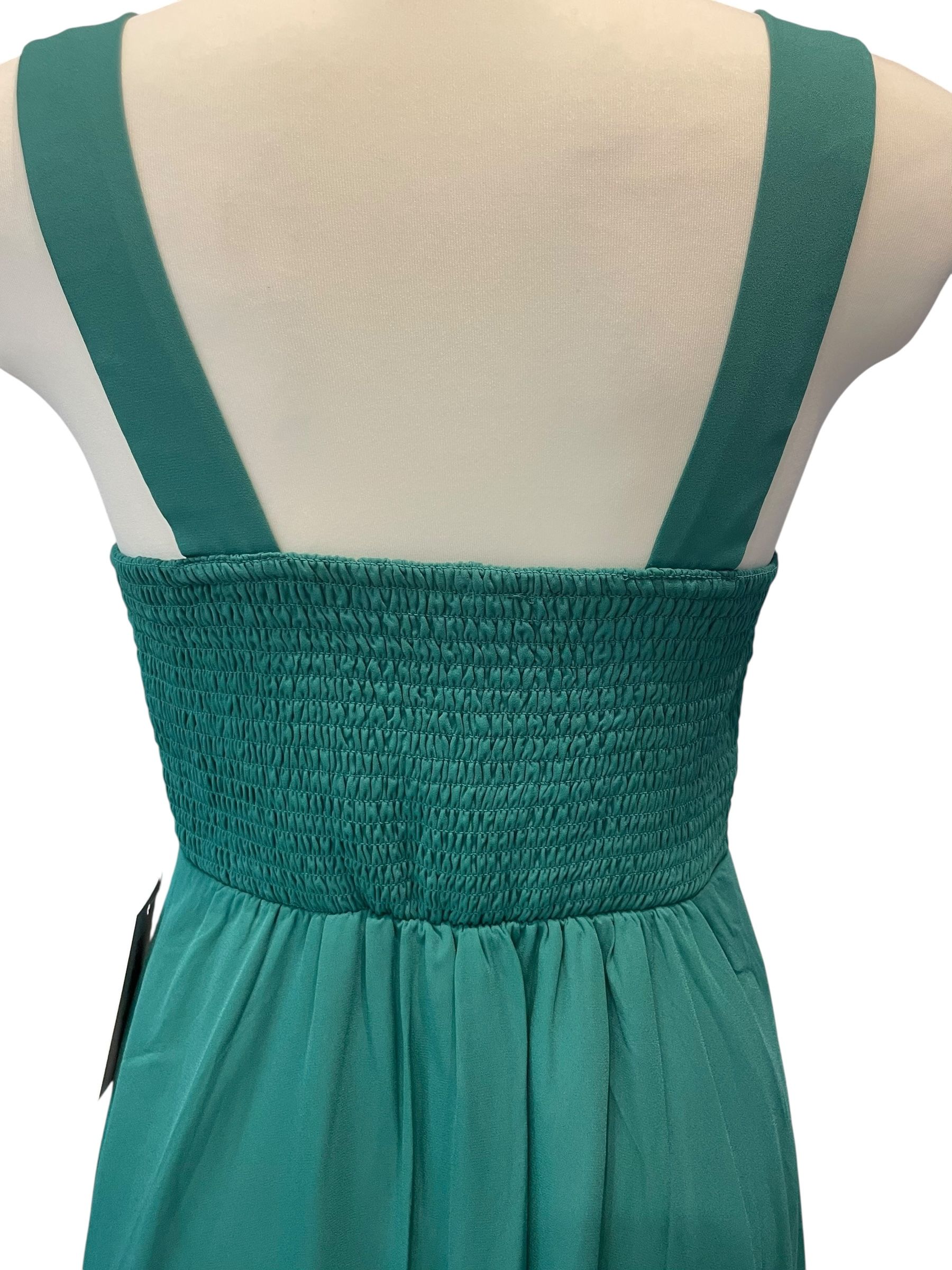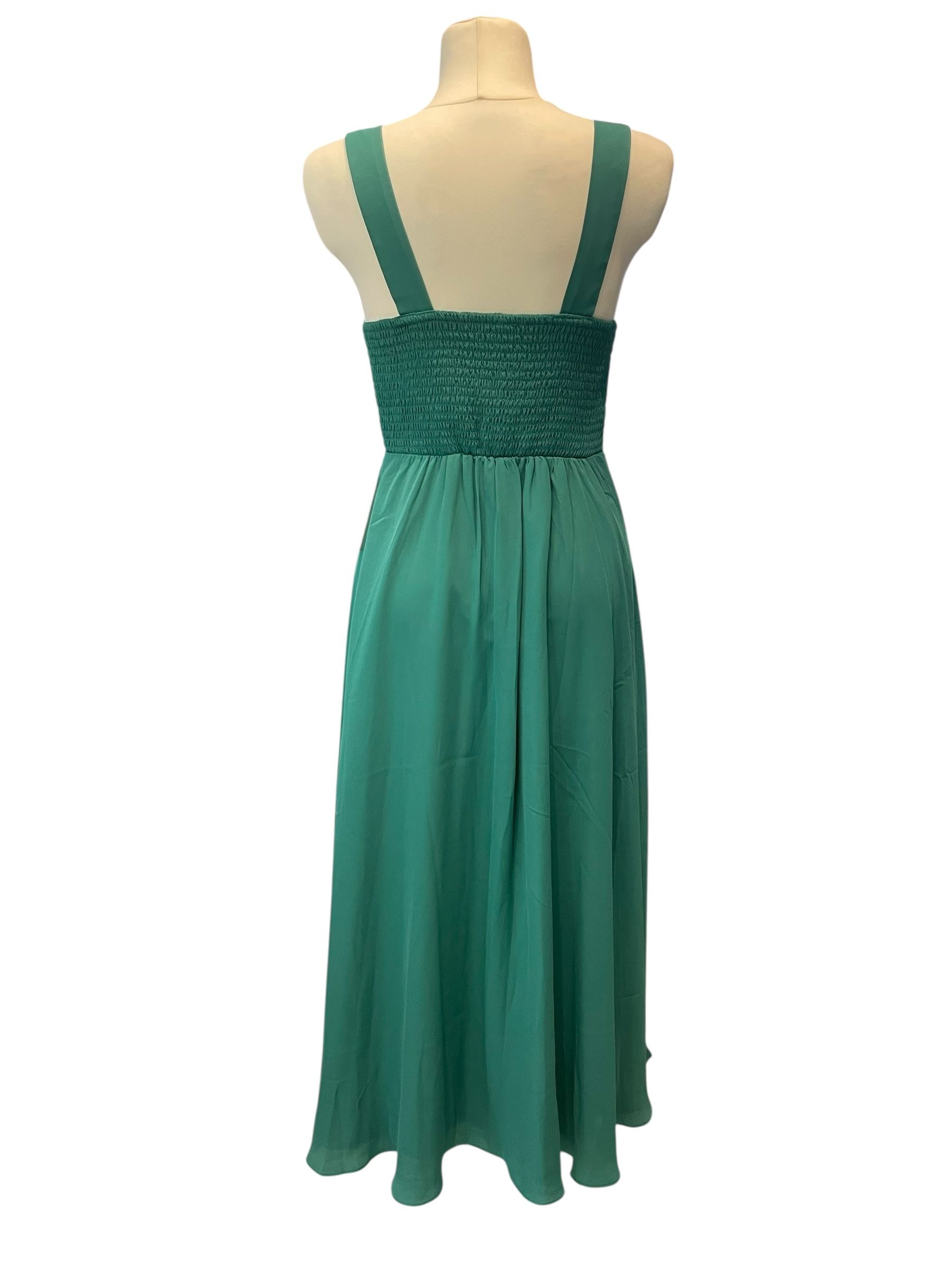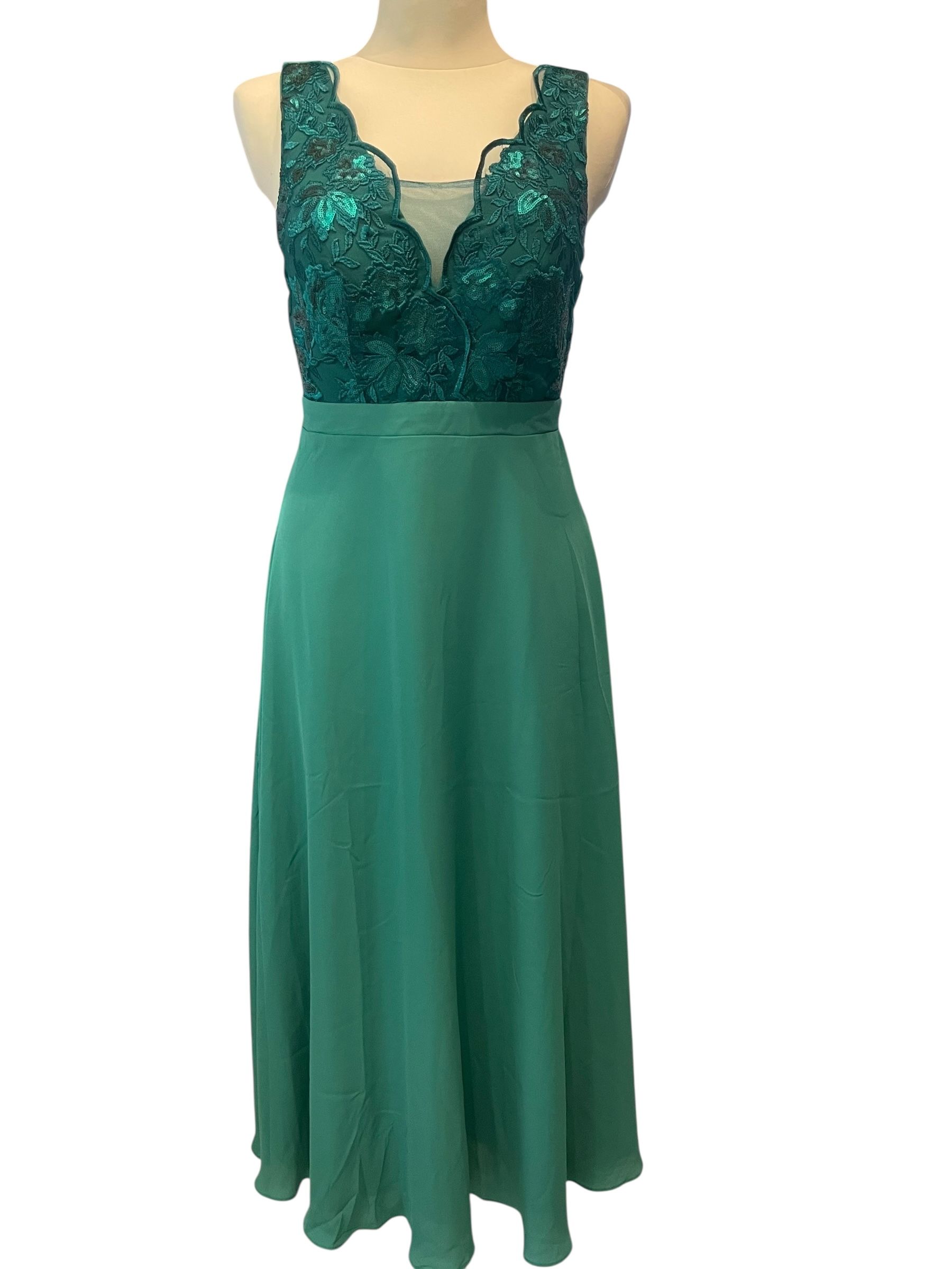 Ta długa zielona sukienka to elegancka kreacja na wyjątkowe okazje typu bal, wesele czy uroczyste przyjęcie. Delikatna koronka w górnej części z wyhaftowanym wzorem liści ozdobionych cekinami dodaje jej niepowtarzalnego uroku. Na plecach materiał przeszyty wraz z gumką co sprawia, że sukienka idealnie dopasowuje się do kształtu figury i odpowiedniego rozmiaru. Cała sukienka od wewnętrznej strony podszyta jest podszewką, a biust podtrzymują wszyte miękkie miseczki. Sukienka pięknie się prezentuje, idealna dla osób w każdym wieku, ceniących kobiecy styl z nutką romantyzmu. Dostępna również w innych kolorach.
