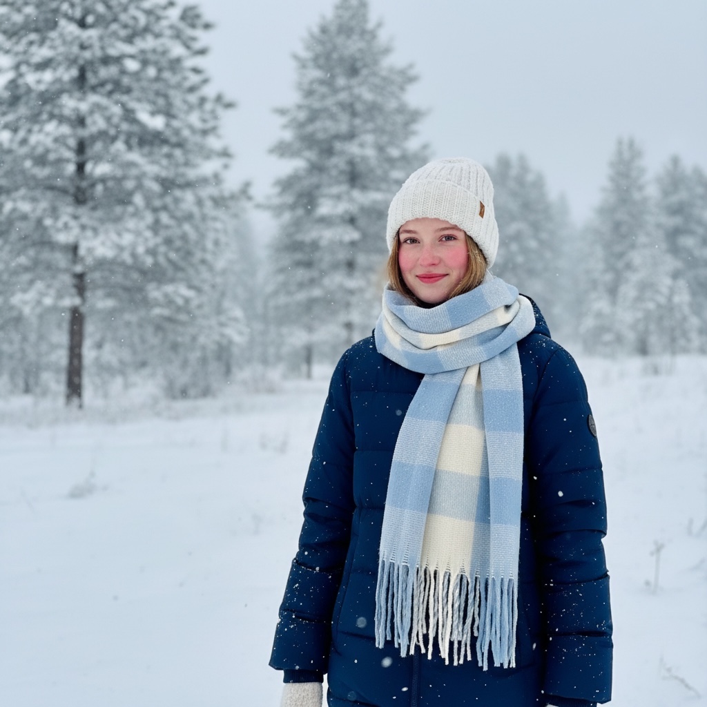 Szalik w pastelowych odcieniach wykonany z miękkiego, przyjemnego w dotyku materiału, który doskonale chroni przed zimnem, jednocześnie pięknie układając się wokół szyi. Jest bardzo kobiecy i delikatny. Długie frędzle na końcach dodają mu lekkości i klasycznego wykończenia. Dzięki stonowanej kolorystyce – połączeniu błękitu i bieli doskonale komponuje się zarówno z jasnymi, jak i ciemnymi płaszczami, kurtkami czy swetrami. To idealny wybór na zimowe spacery, wyjazdy w góry czy codzienne stylizacje.