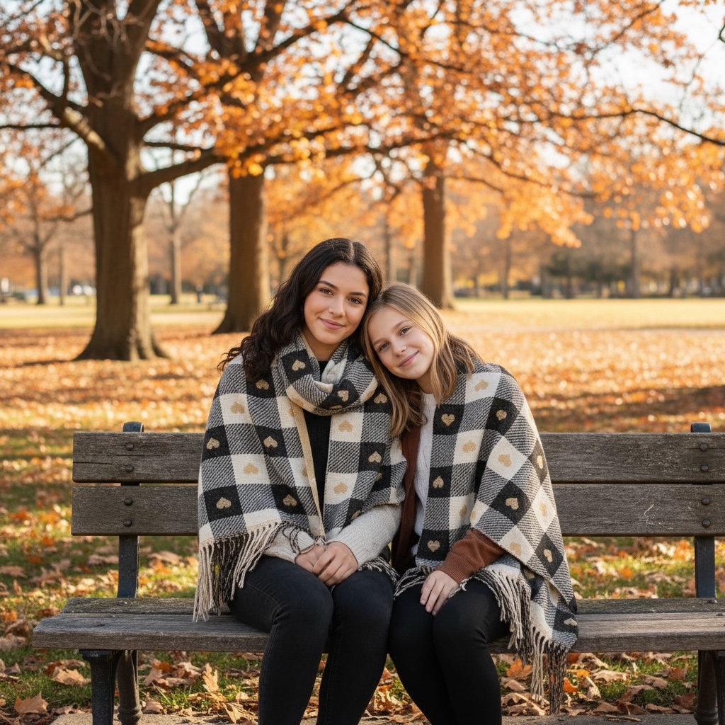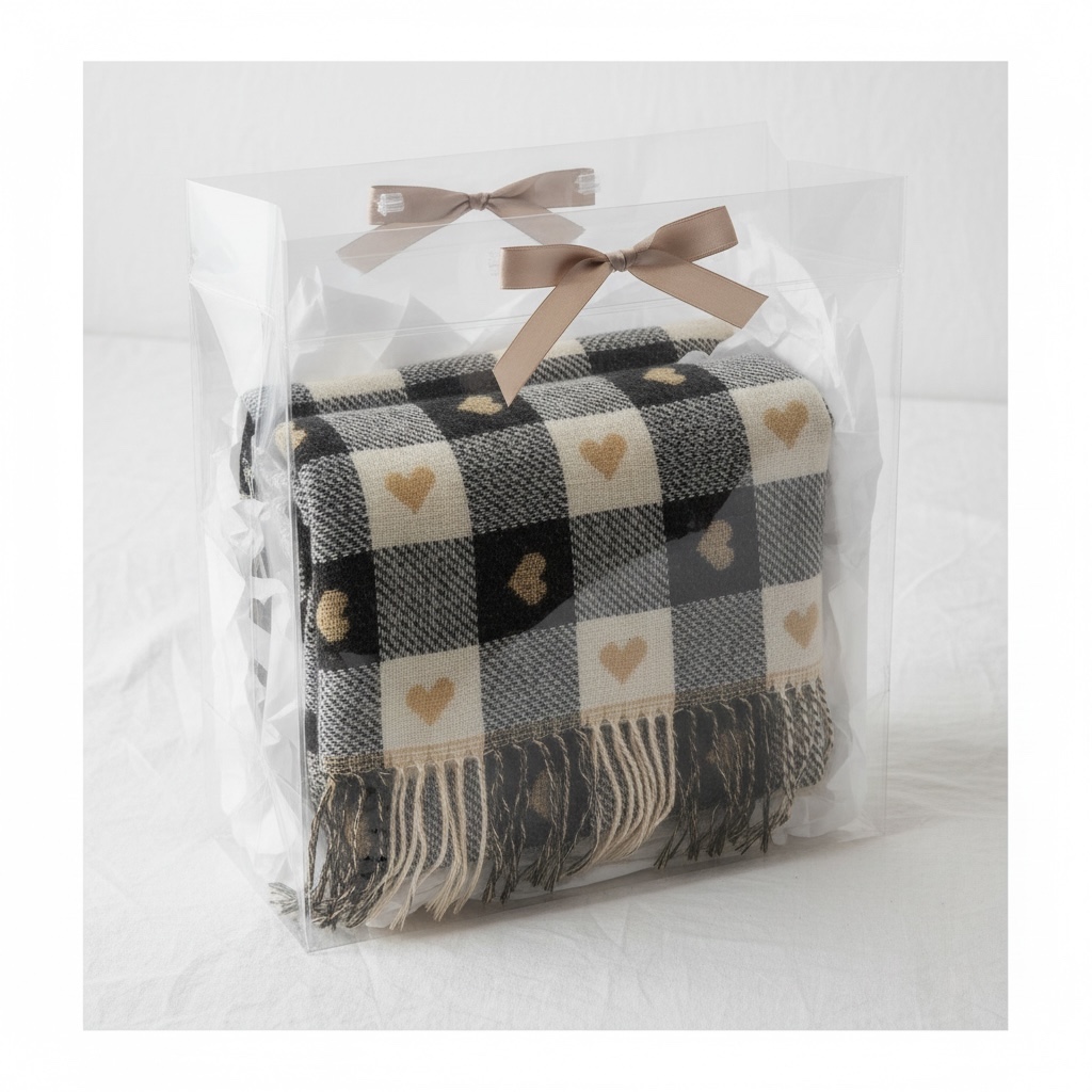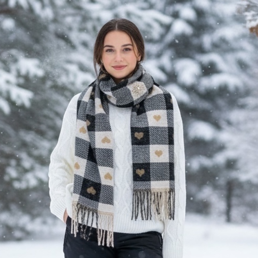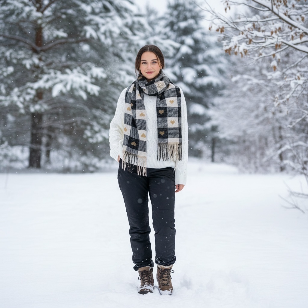Szalik w klasyczną kratę został wykonany z miękkiego, przyjemnego w dotyku materiału, który doskonale chroni przed zimnem, jednocześnie pięknie układając się wokół szyi. Model wyróżnia się subtelnymi, złoto-beżowymi serduszkami, umieszczonymi w wybranych polach kraty – to drobny, ale bardzo stylowy detal, który sprawia, że szalik zyskuje kobiecy i oryginalny charakter. Długie frędzle na końcach dodają mu lekkości i klasycznego wykończenia. Dzięki stonowanej kolorystyce – połączeniu czerni, bieli i szarości – szalik doskonale komponuje się zarówno z jasnymi, jak i ciemnymi płaszczami, kurtkami czy swetrami. To idealny wybór na zimowe spacery, wyjazdy w góry czy codzienne stylizacje.